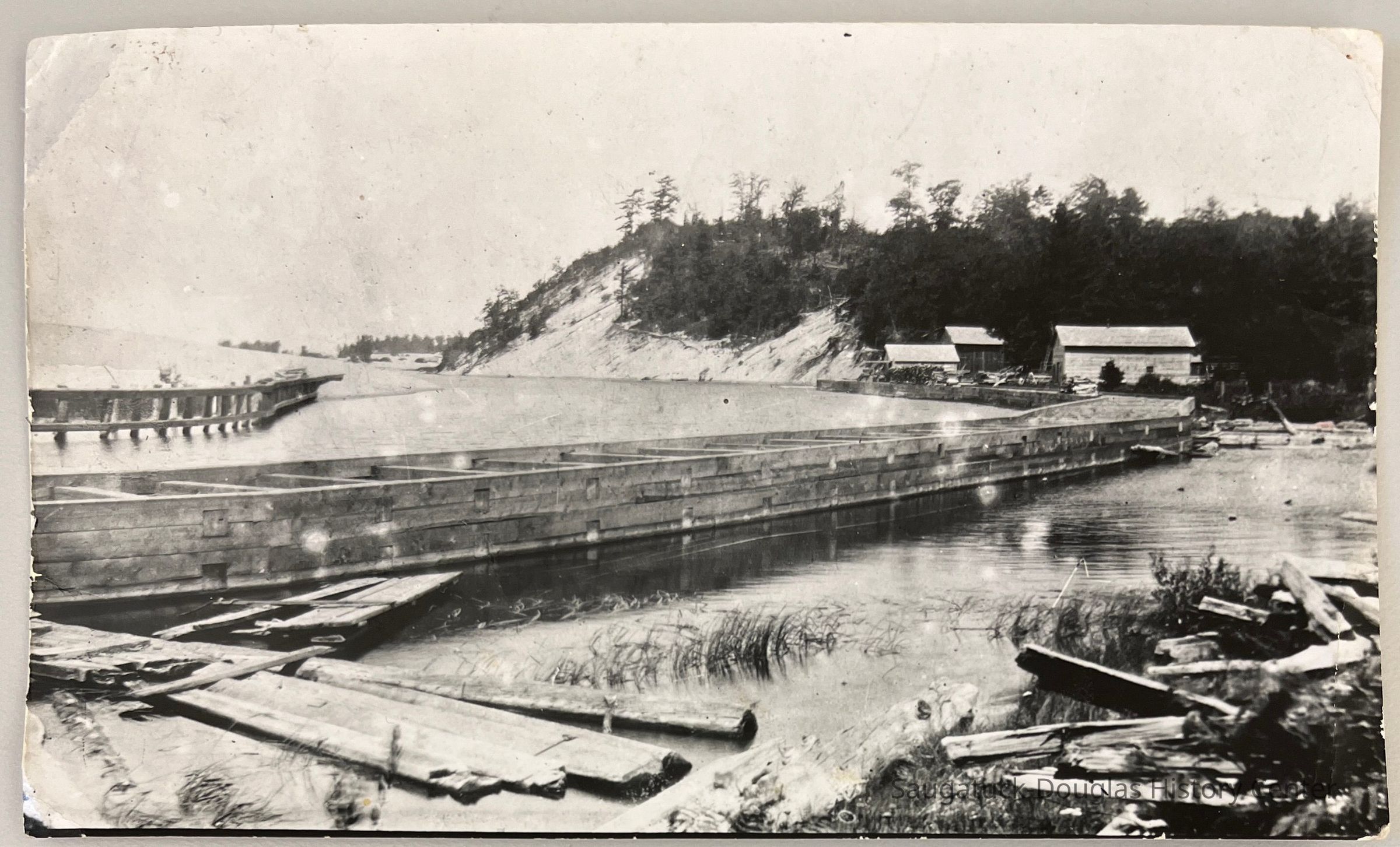 Photographs of the wooden sea walls along the final curve of the Kalamazoo River's old harbor, the rustic wooden buildings on the Shriver property and the crow's next dune.Photograph Details