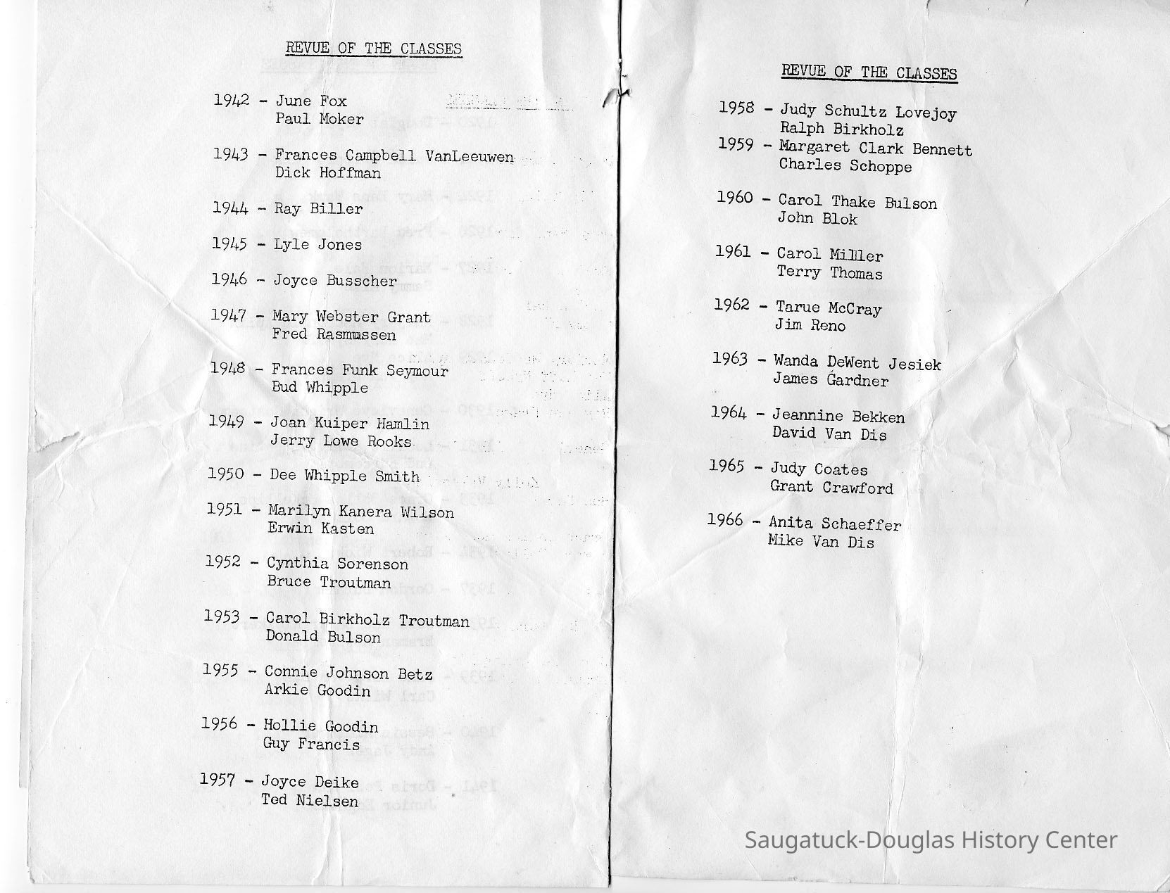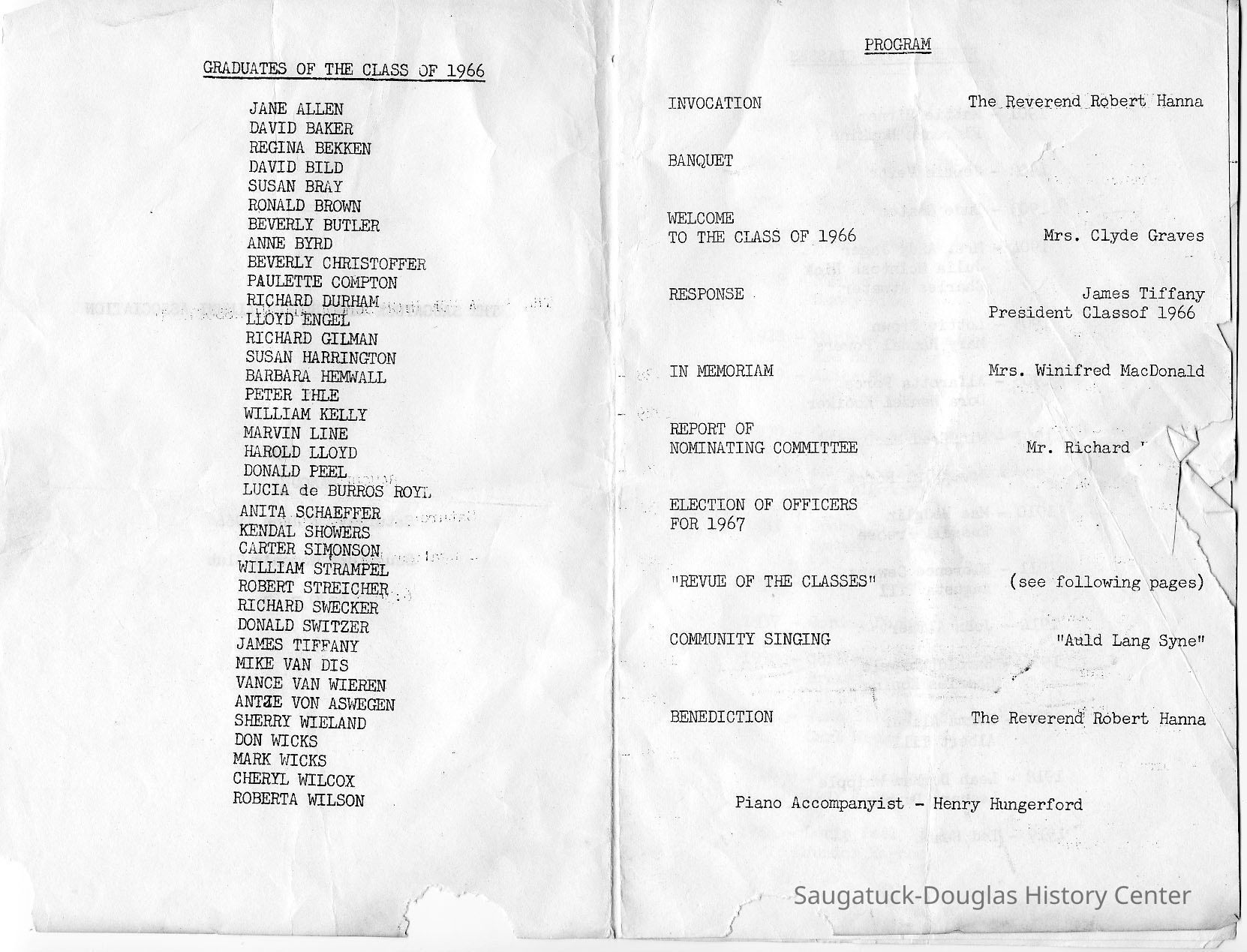 Scan of a photocopy of the Saugatuck High School Alumni Association banquet program, 4 June 1966 at the Saugatuck Women's Club. The programs lists the class of 1966, the evening's program and a review of (most of) the classes from 1901 to 1966.