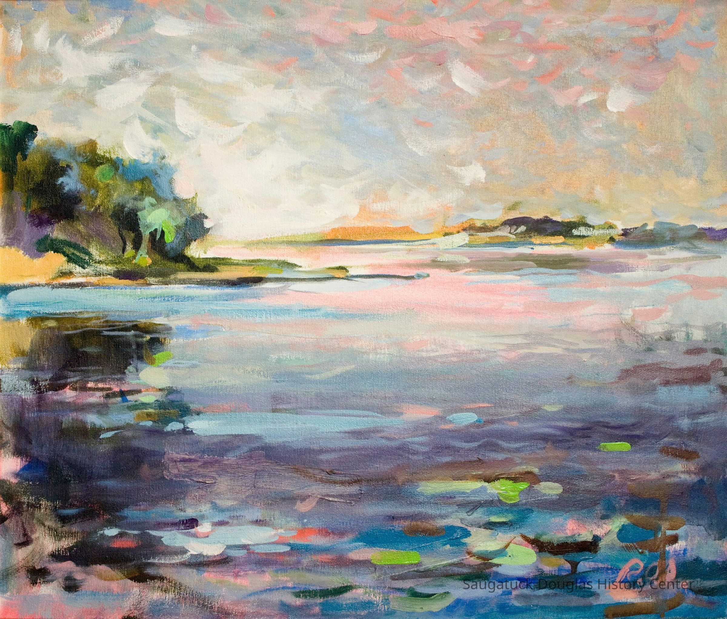 An impressionistic landscape with bold pink strokes in the sky, the water in the middle distance and among the green lily pads in the foreground.Type of Painting
