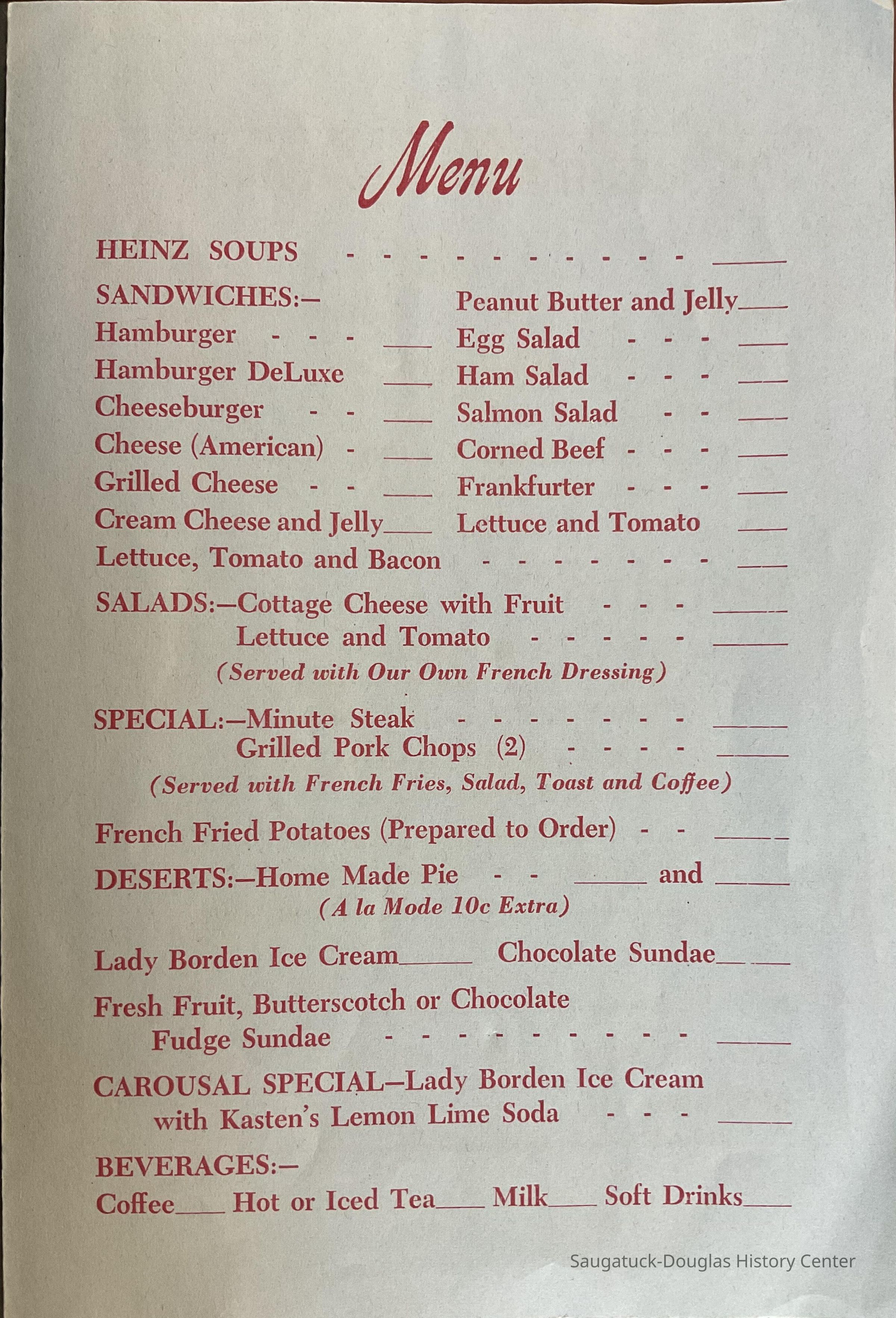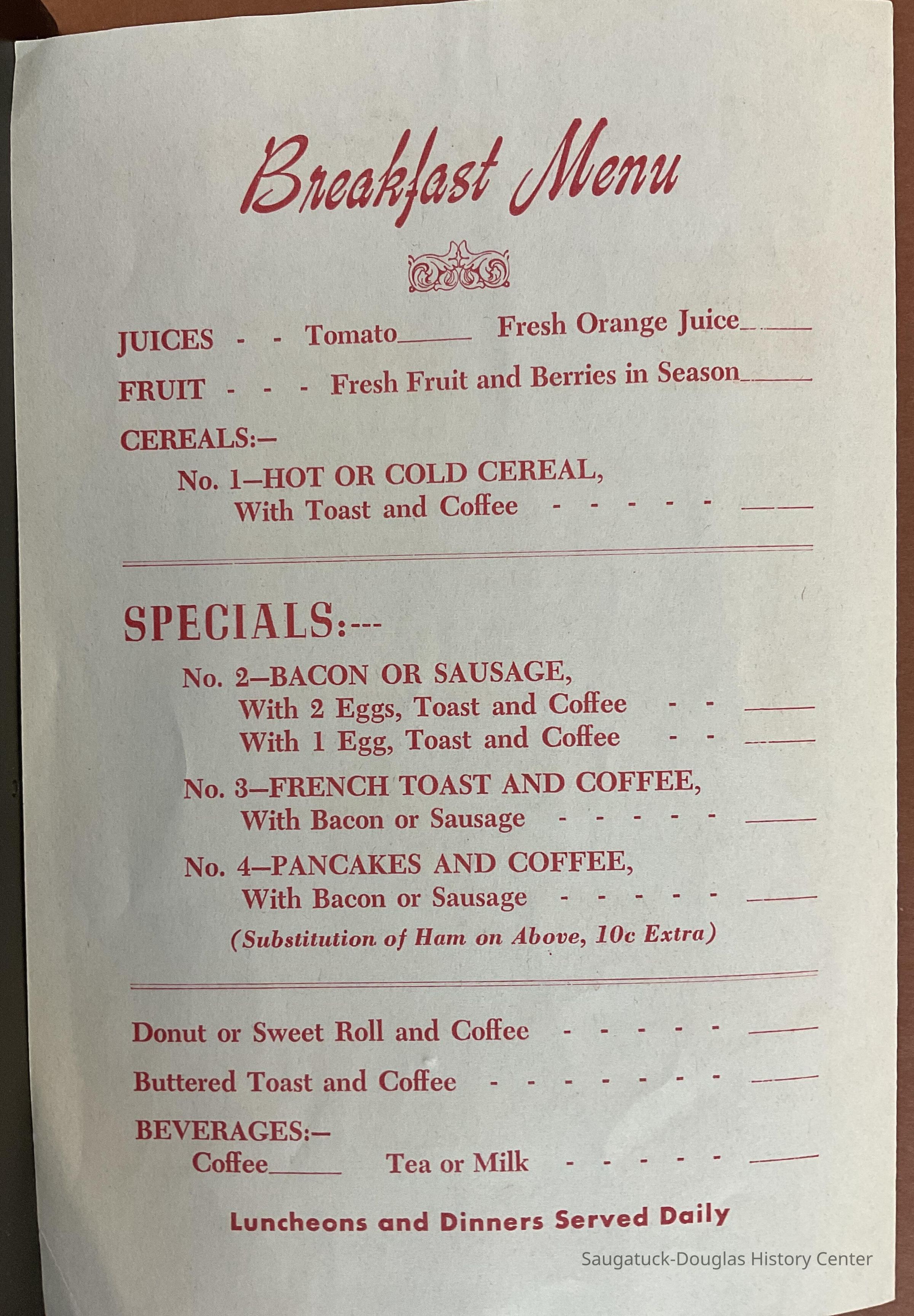 Menu of the Simmons of Saugatuck tearoom restaurantCollection