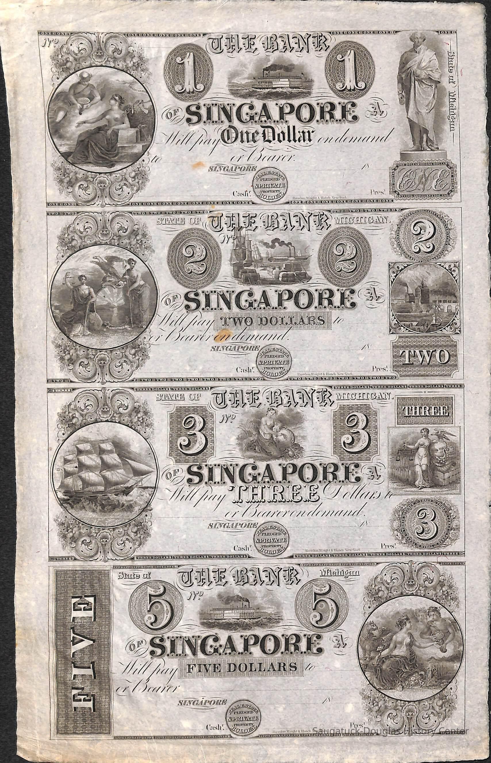 Four uncut, unsigned banknotes printed (one side only) for the Singapore Bank. Also several sheets of information about the bank written by Charles Lorenz in 1989Collection