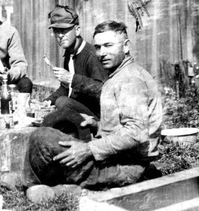 Herman Hirner enjoys picnic lunch, Osa Welch in Background