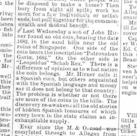 "Last Wednesday a son of John Hirner found an old coin bearing the date 1682, in the sand hills near the old ruins of Singapore. One side of the coin bears the inscription "Patronahun Gaviae 1682." On the other side is "Leopoldus" "Schab Rex." There is a difference of opinion as to what nation the coin belongs. Mr. Hirner calls it a Spanish coin, but others acquainted with the Spanish langauge and money say it does not belong to that country. The problem is whether or not there are more of the coins in the hills. The discovery re-awakens all the old stories of hidden Spanish treasures of which every town in the state claims an inexhaustiable supply."
