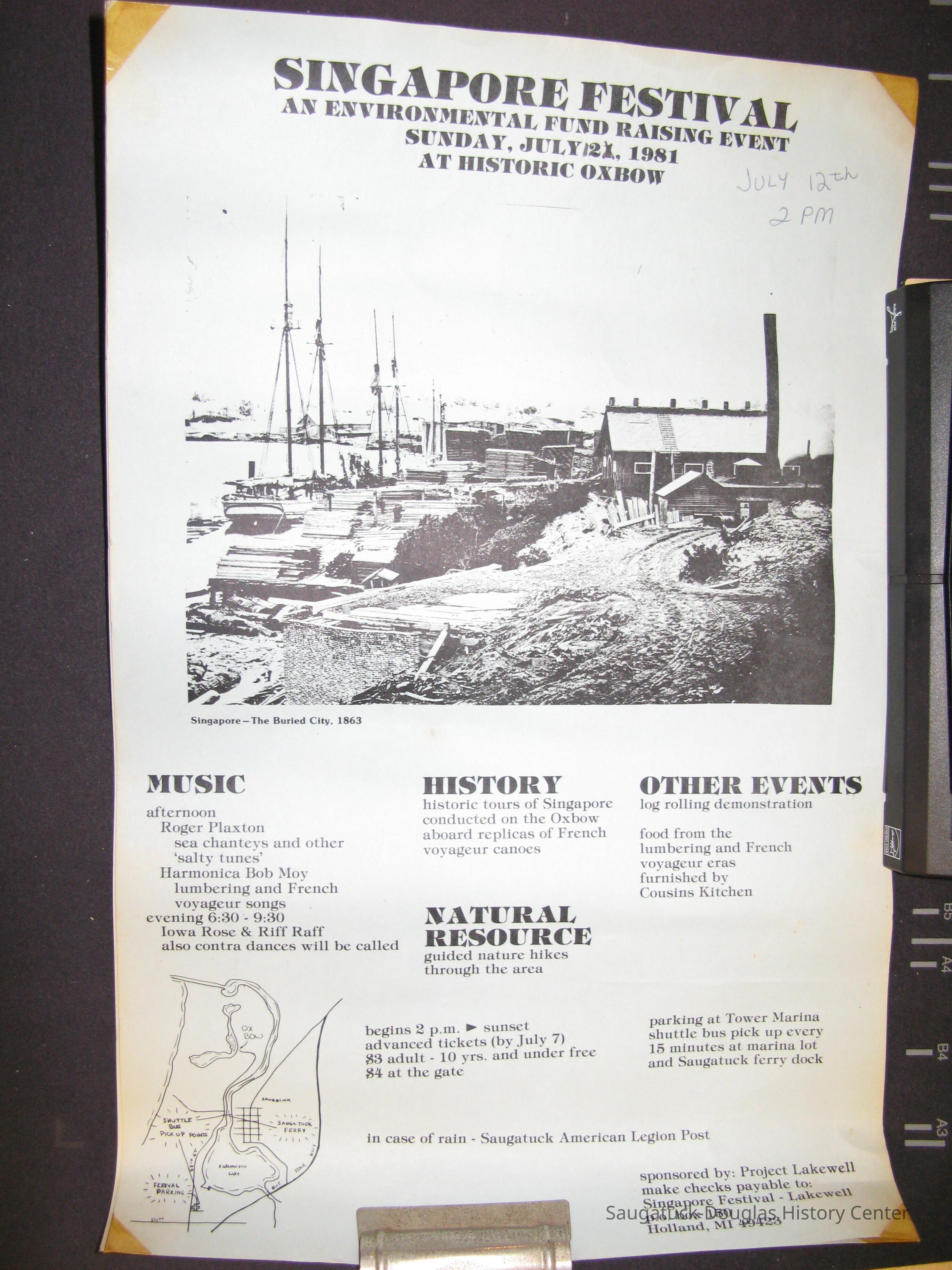 Two posters of the Singapore Festival, July 12, 1981 An Enviromental Fund Raiser at the Historic OxBow. The event featured music, food and tours of the natural areas around Singapore.Cataloged By