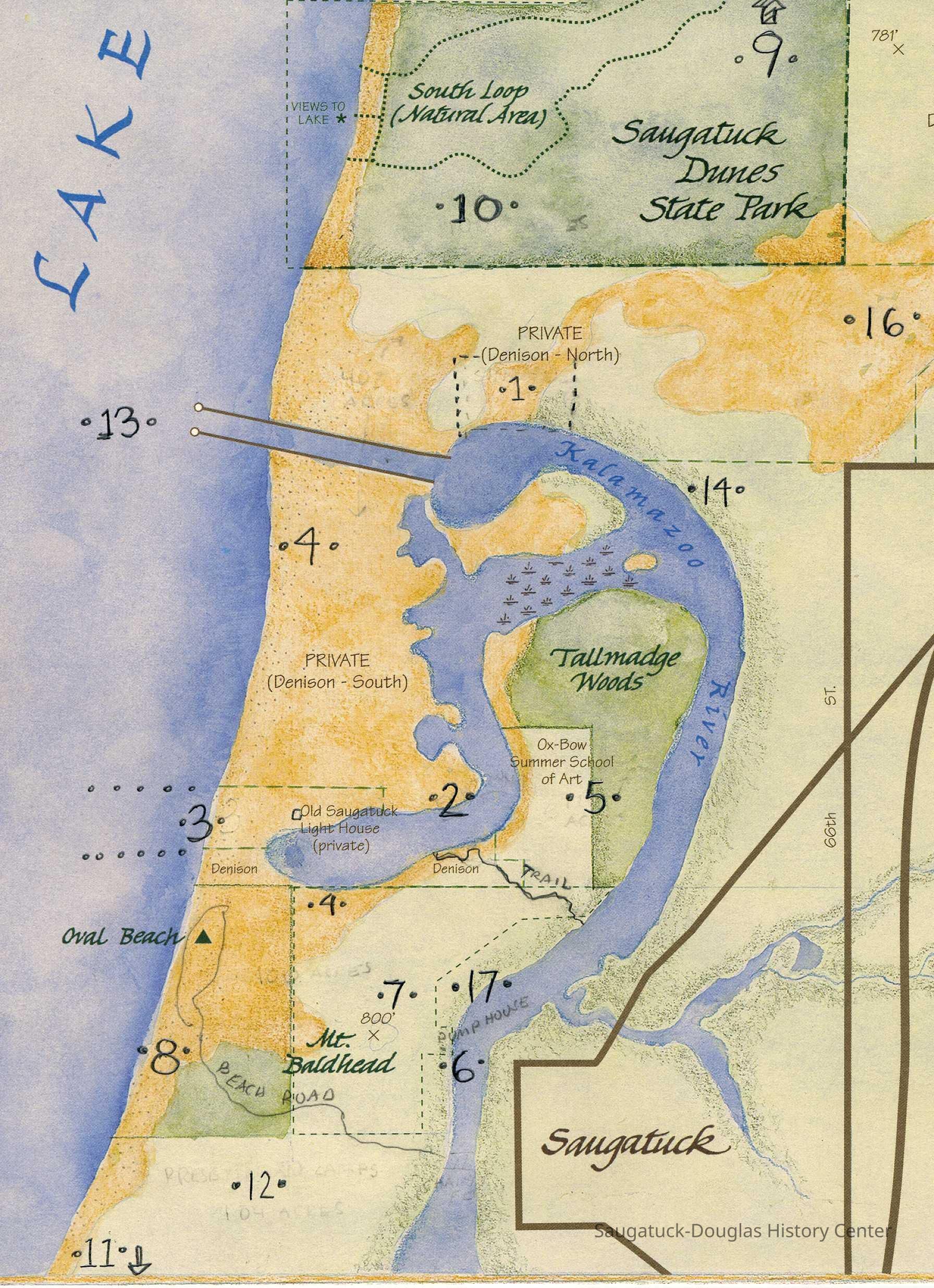 Historical Context. Saugatuck's Lake Michigan/Kalamazoo River coastal district is an area of roughly 2,000 acres of relatively undisturbed dune and woodlands that hold a large concentration of interconnected sites of particular historic significance. These sites tell a number of important stories in Michigan and American history, all of which center on the many interactions, over centuries of time, between humankind and the natural environment. Some of the sites hold structures, some have been abandoned.
