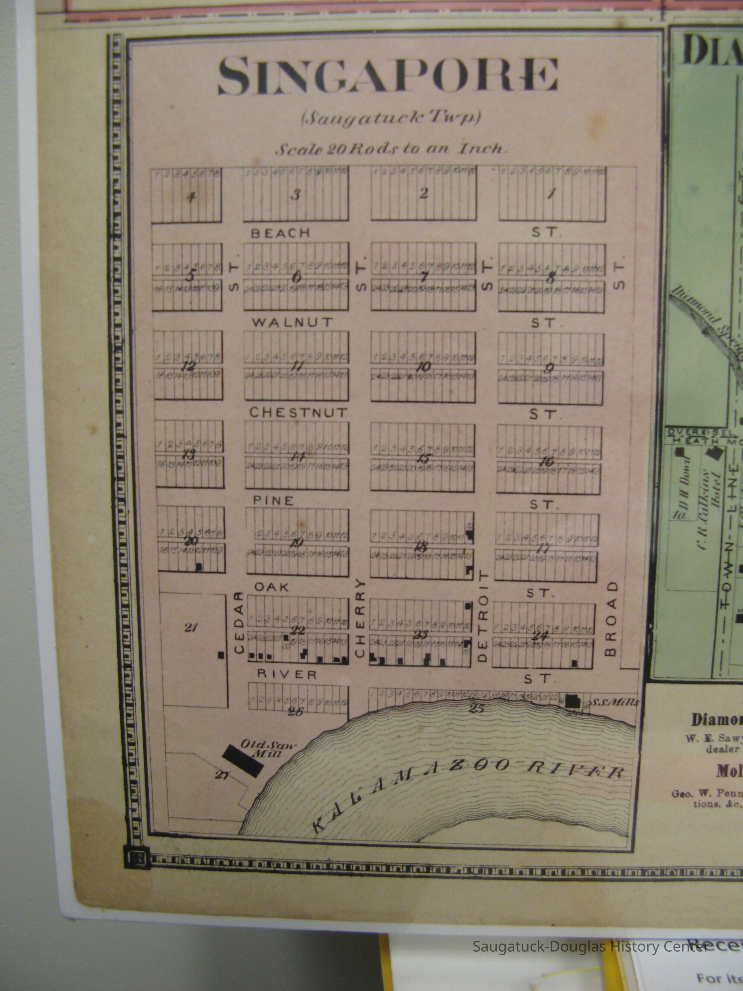 Map was reprinted in "Raising the Roof" by James Schmiechen with the caption, "Map of Singapore, 1873. Singapore was the famous 'Wild Cat' mill-town founded in 1837 near the mouth of the Kalamazoo River at Lake Michigan. As a thriving lumber producing center, it exported millions of board feet of lumber to Chicago and elsewhere during the heyday of the lumber boom era in the 1860s, but disappeared as fast as the nearby forests of white pine were clear-cut. This map from 1873 shows Singapore on its last legs. From this time the town was slowly abandoned. The mill was packed up and sent to St. Ignace. Some houses were moved to new sites upriver in Saugatuck, while the remaining structures were left to be buried beneath the moving sand dunes. The plat suggests a much larger town was planned, but in reality few of the lots ever had structures built upon them."Collection