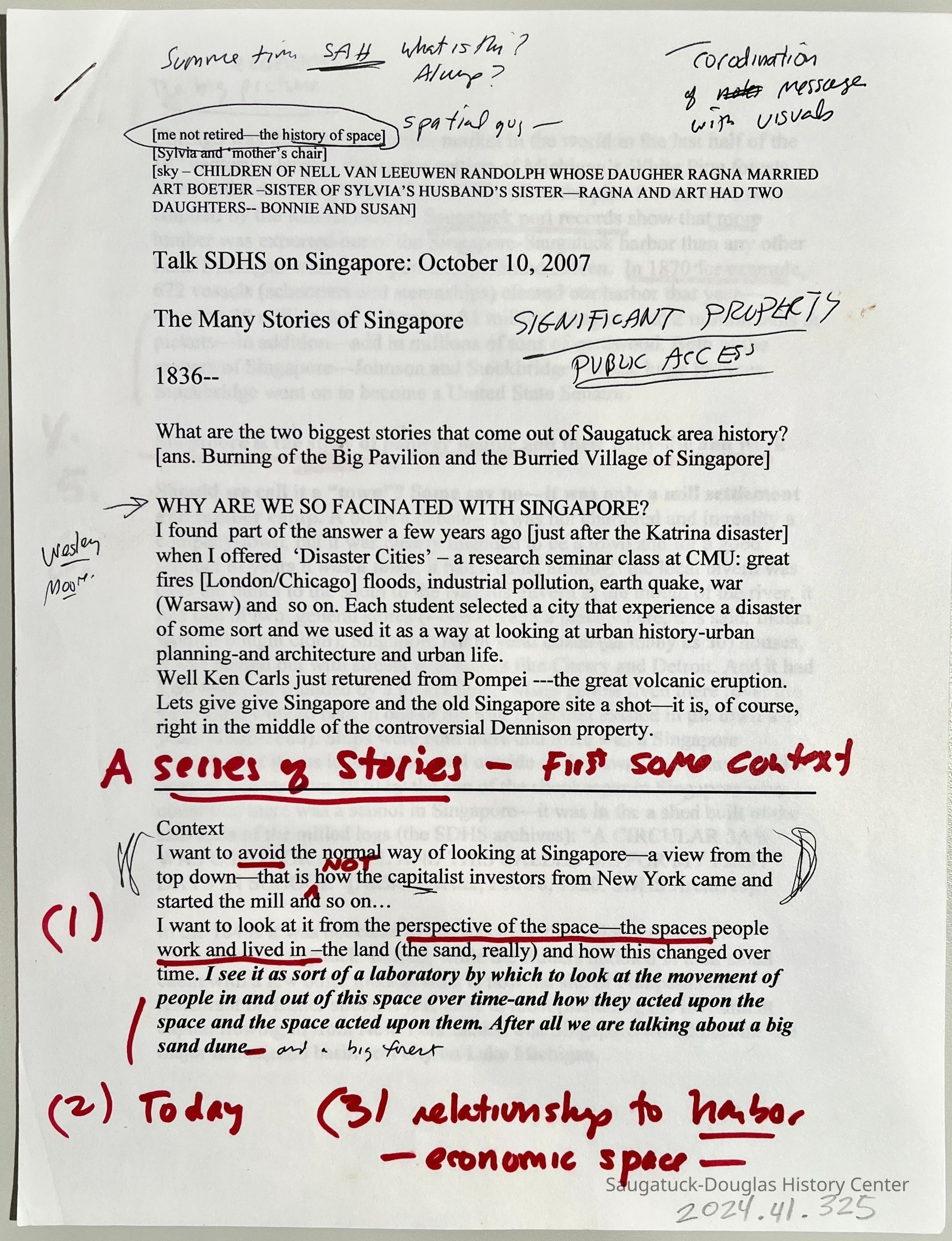Historian James A. Schmiechen speaking about Singapore, Michigan in this SDHS presentation at the Saugatuck High School library on October 10, 2007. Video is blurred but audio is intact. A PDF of the powerpoint presentation that accompanied lecture is included in this entry.Collection