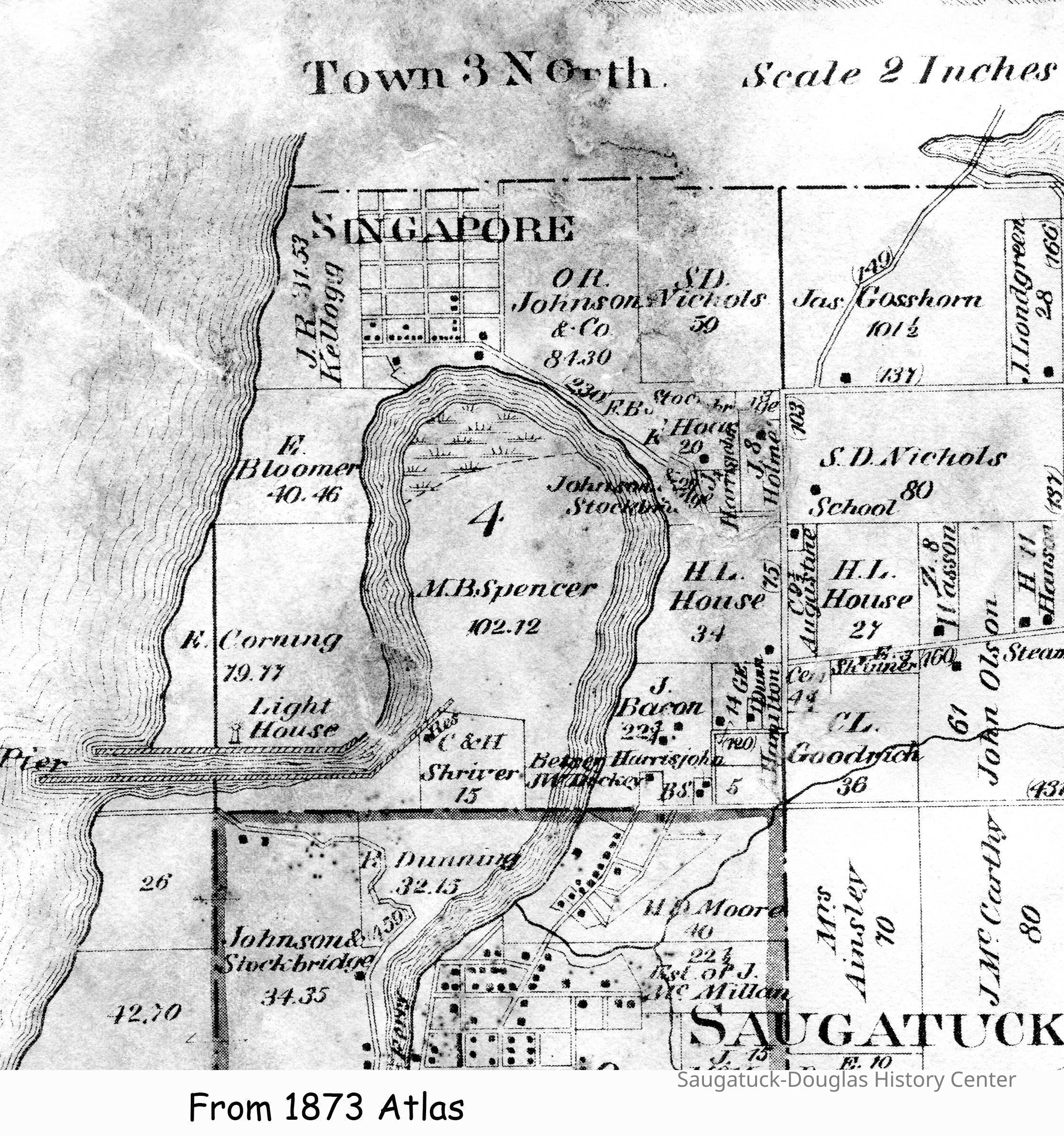 Stockbridge operated a lumber yard in Chicago, and the partners established a tannery on the lakeshore south of Douglas. This created a two-way payload for the sailing ships -- lumber to Chicago, and tan hides back to Singapore, where the lumber mill's by-product hemlock bark or tanbark) was stockpiled.