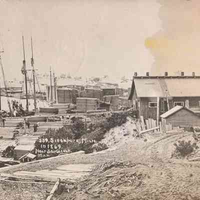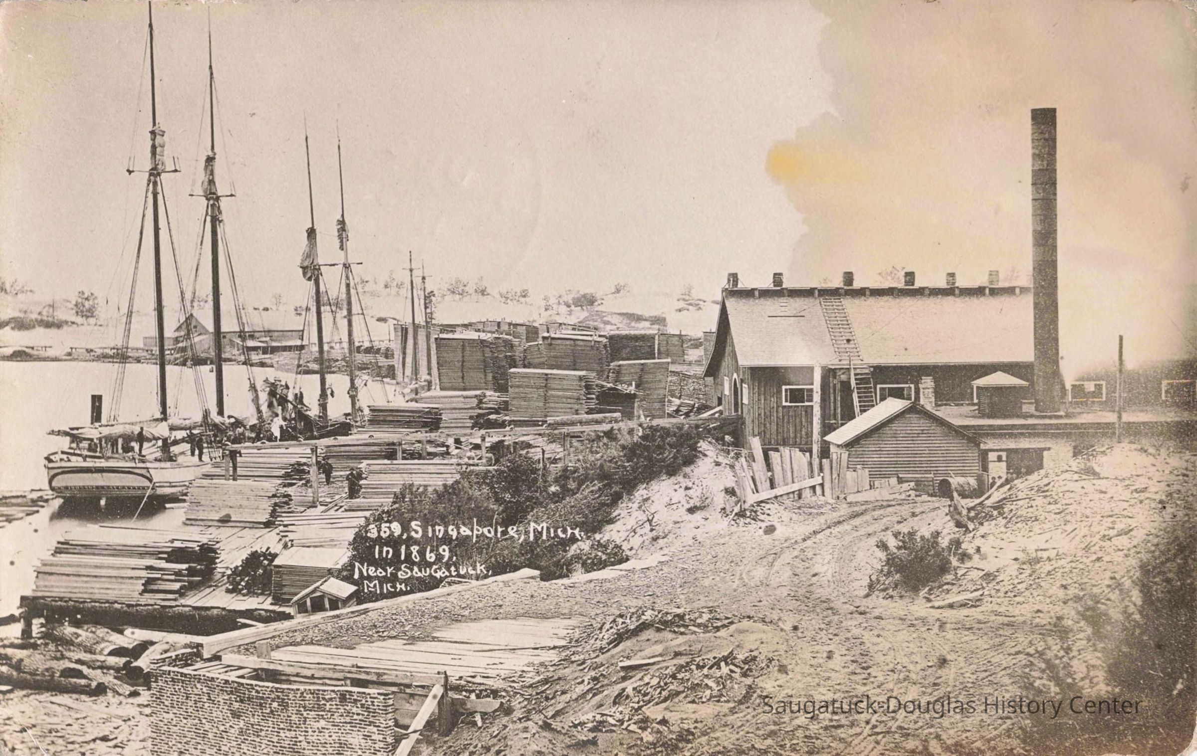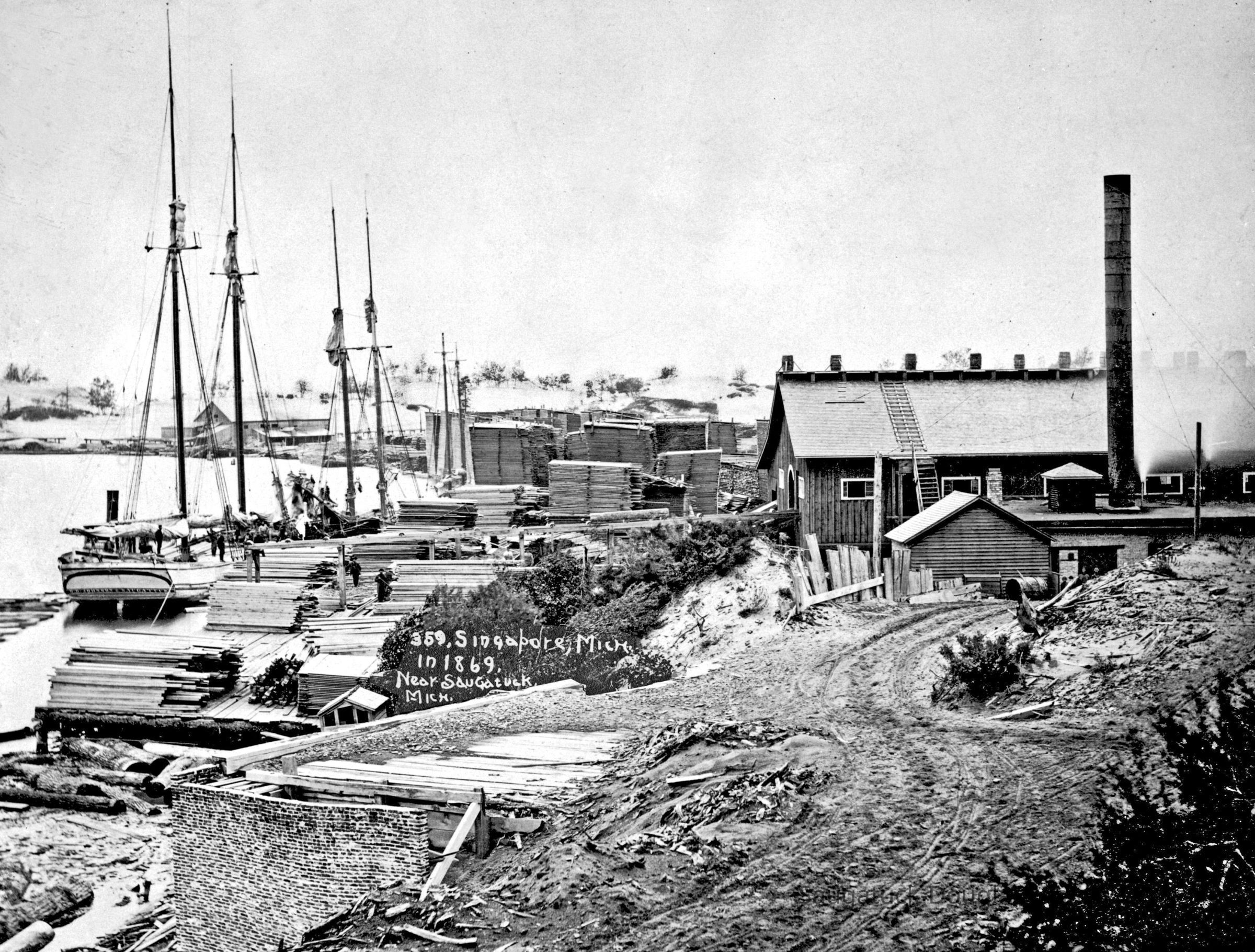 Framed photographic print of the Singapore Saw Mill located at the mouth of the Kalamazoo River, dated 1869.Photograph Details