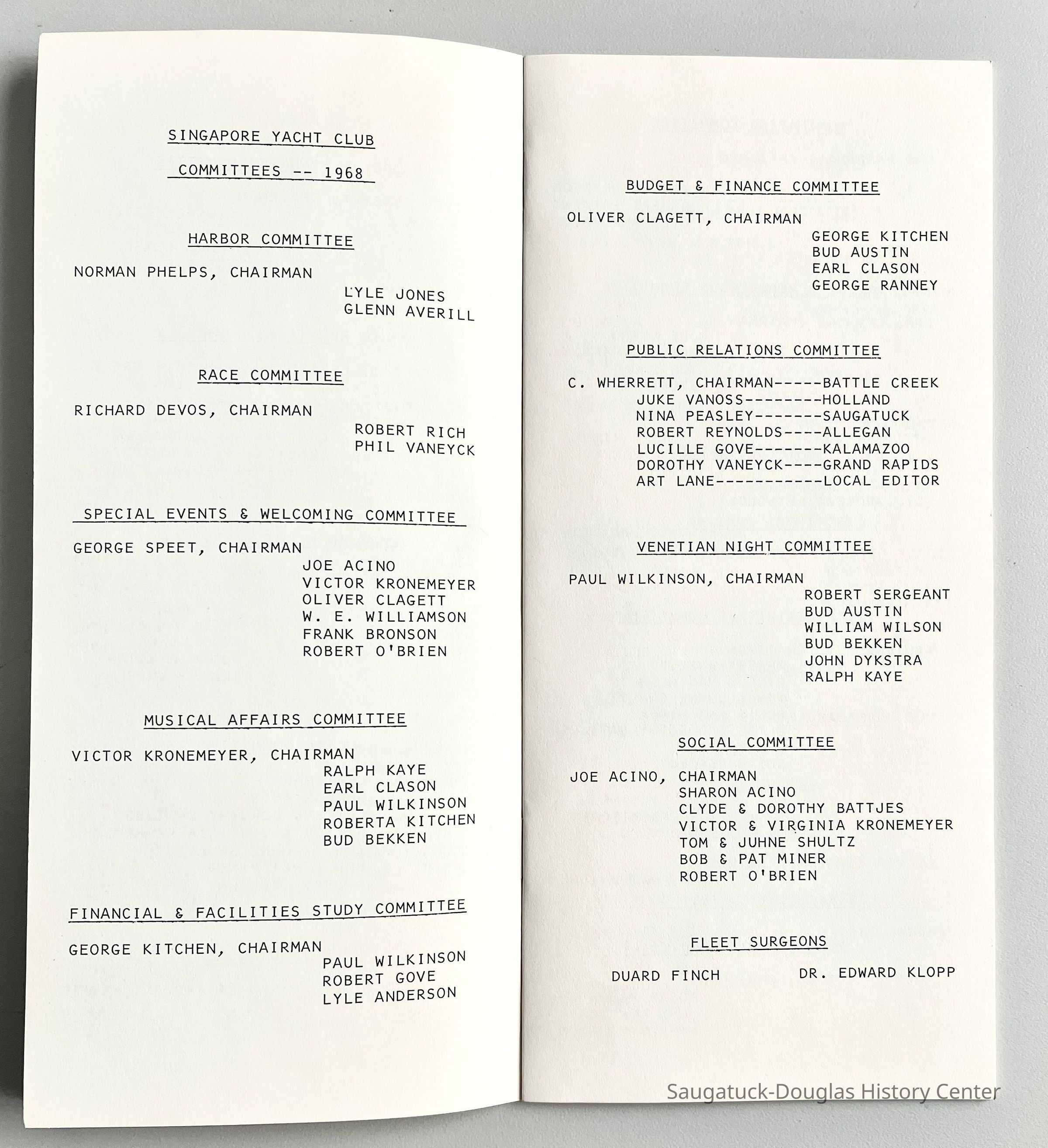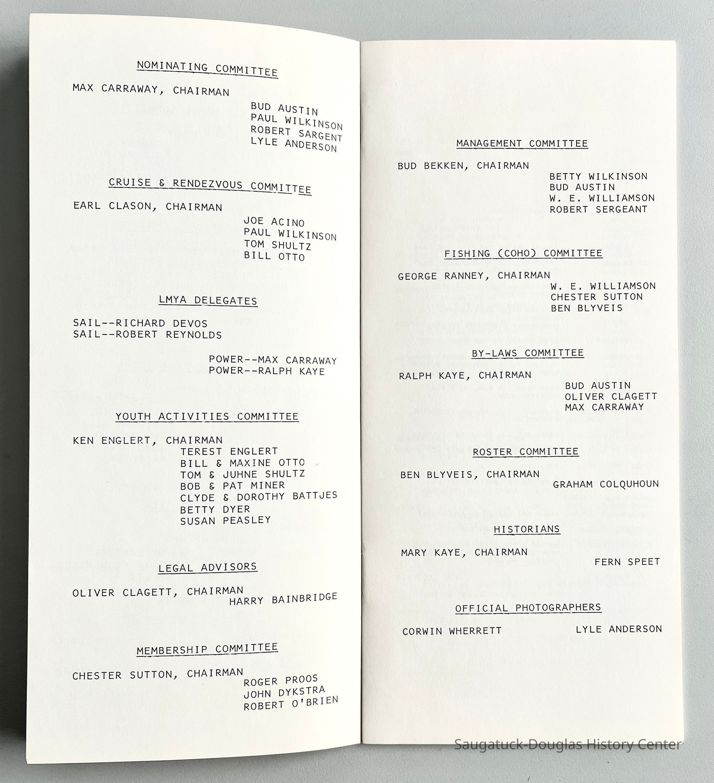 Slim white staple-bound booklet containing club membership directory with names of member's boats, lists of officer, directors, commanders, committees and by-lawsCollection