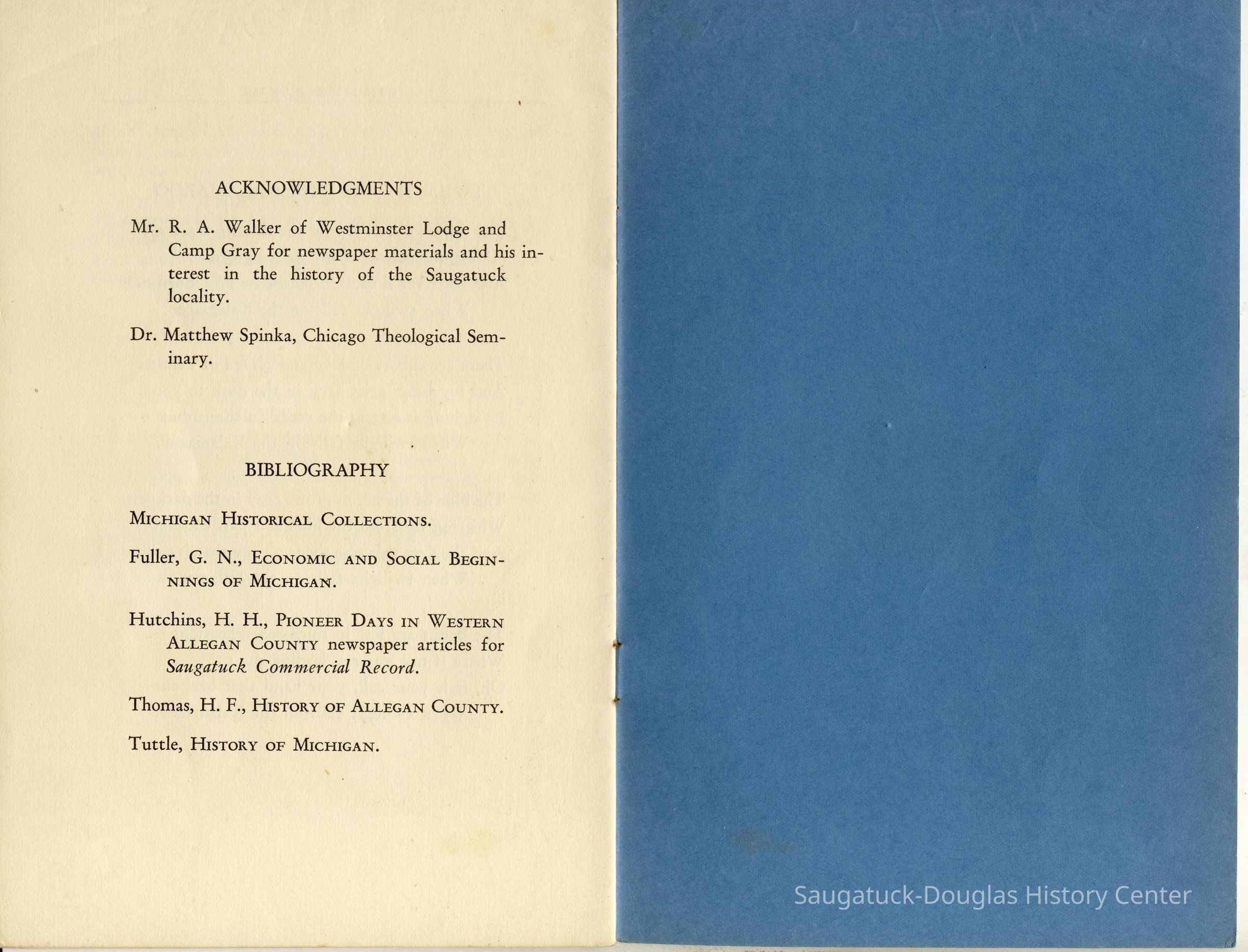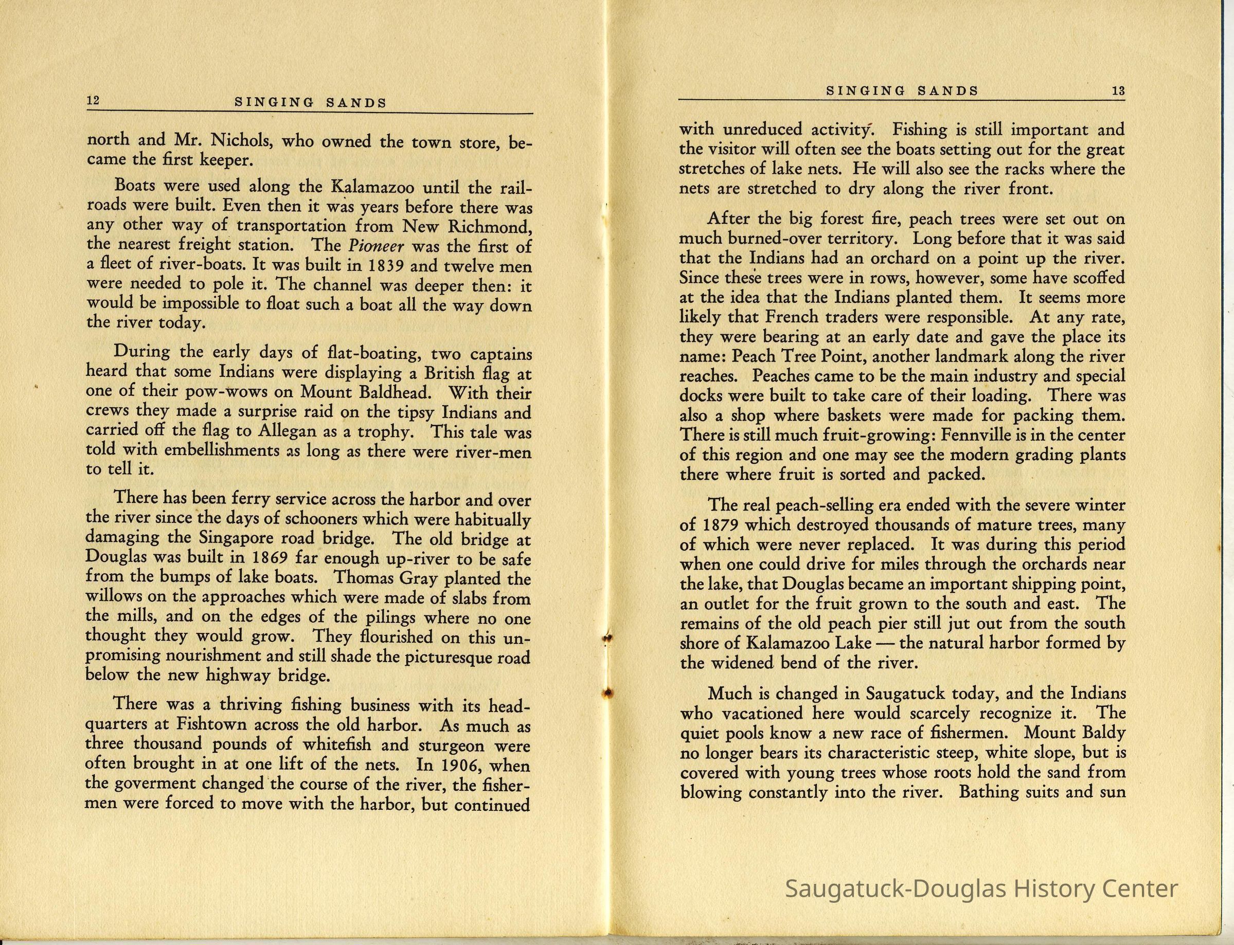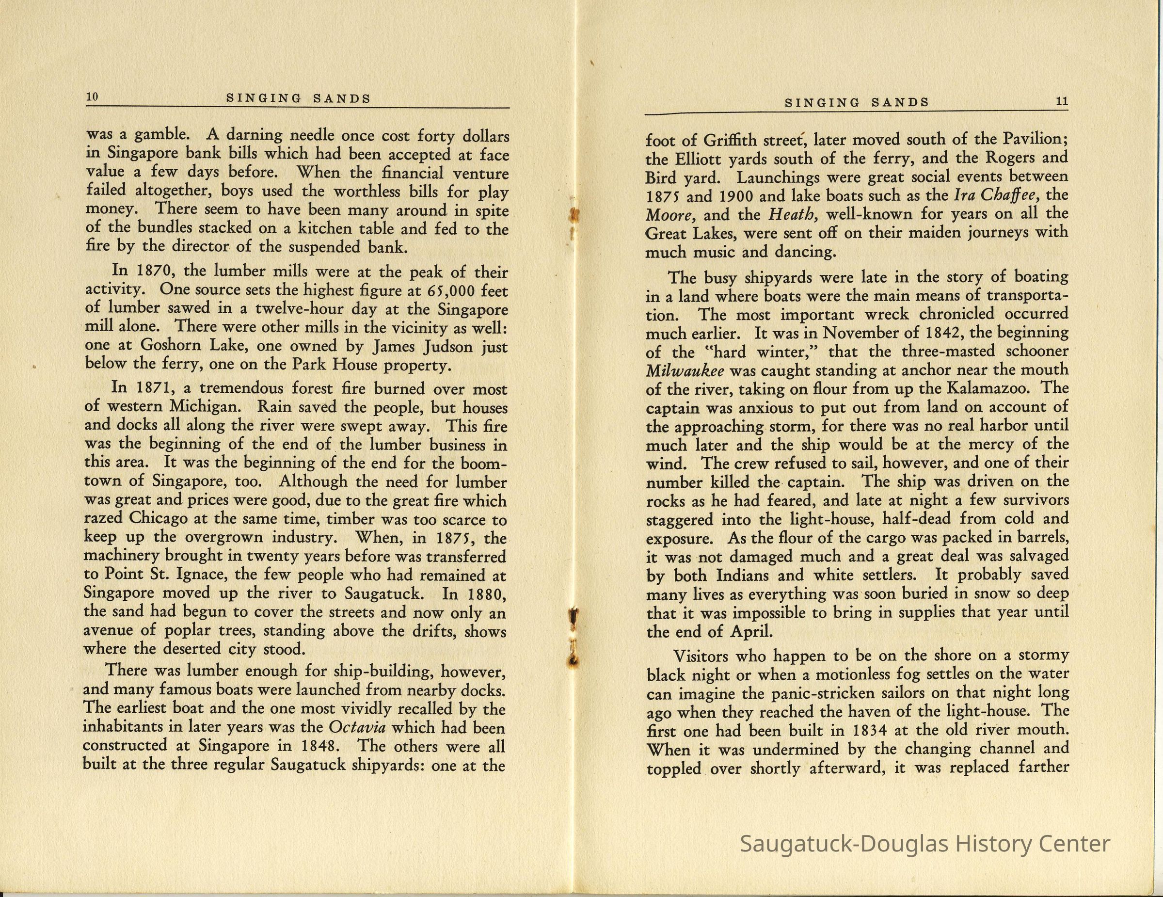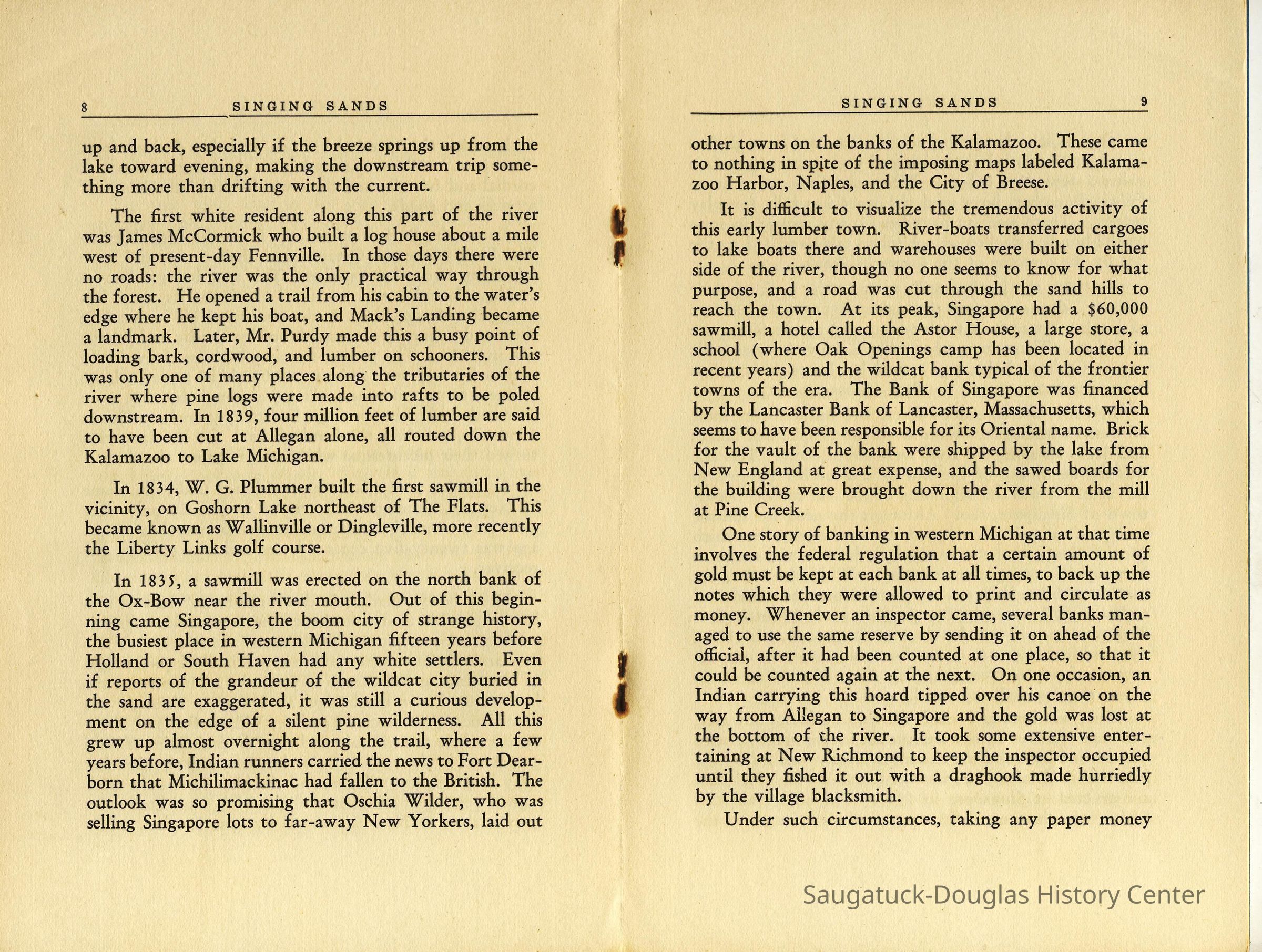 Undated 15-page booklet that tells stories of scheme to fool bank inspectors by delaying them at New Richmond while an unnamed Native American man paddled the gold from Allegan to Singapore, Astor House, the "oriental" origins of the name "Singapore", the worthlessness of Singapore bank notes, river-men stealing British flag from Native Americans gathering at Mount Baldhead, peach farming on burned over land, the winter of 1879, and many of the often repeated town tales.Collection