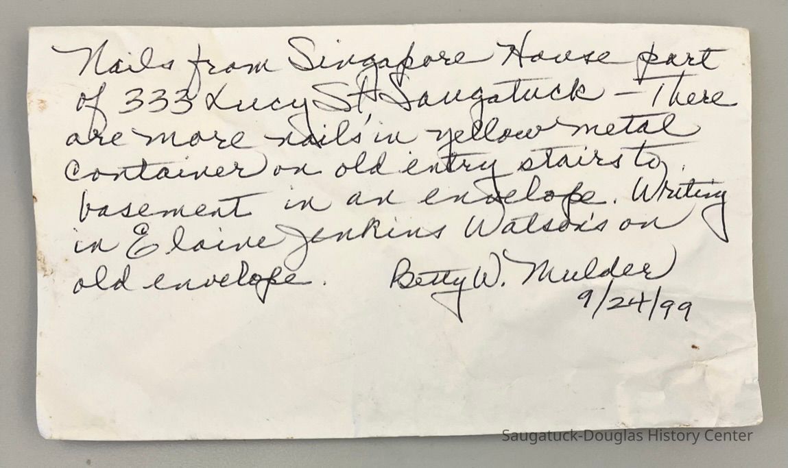 Collection of various items used at Singapore or found in the sands of the Singapore site including bottles, pottery shards, knives, and pieces of iron, stone or brick. Entry includes notes associated with items that explains their origins.Context