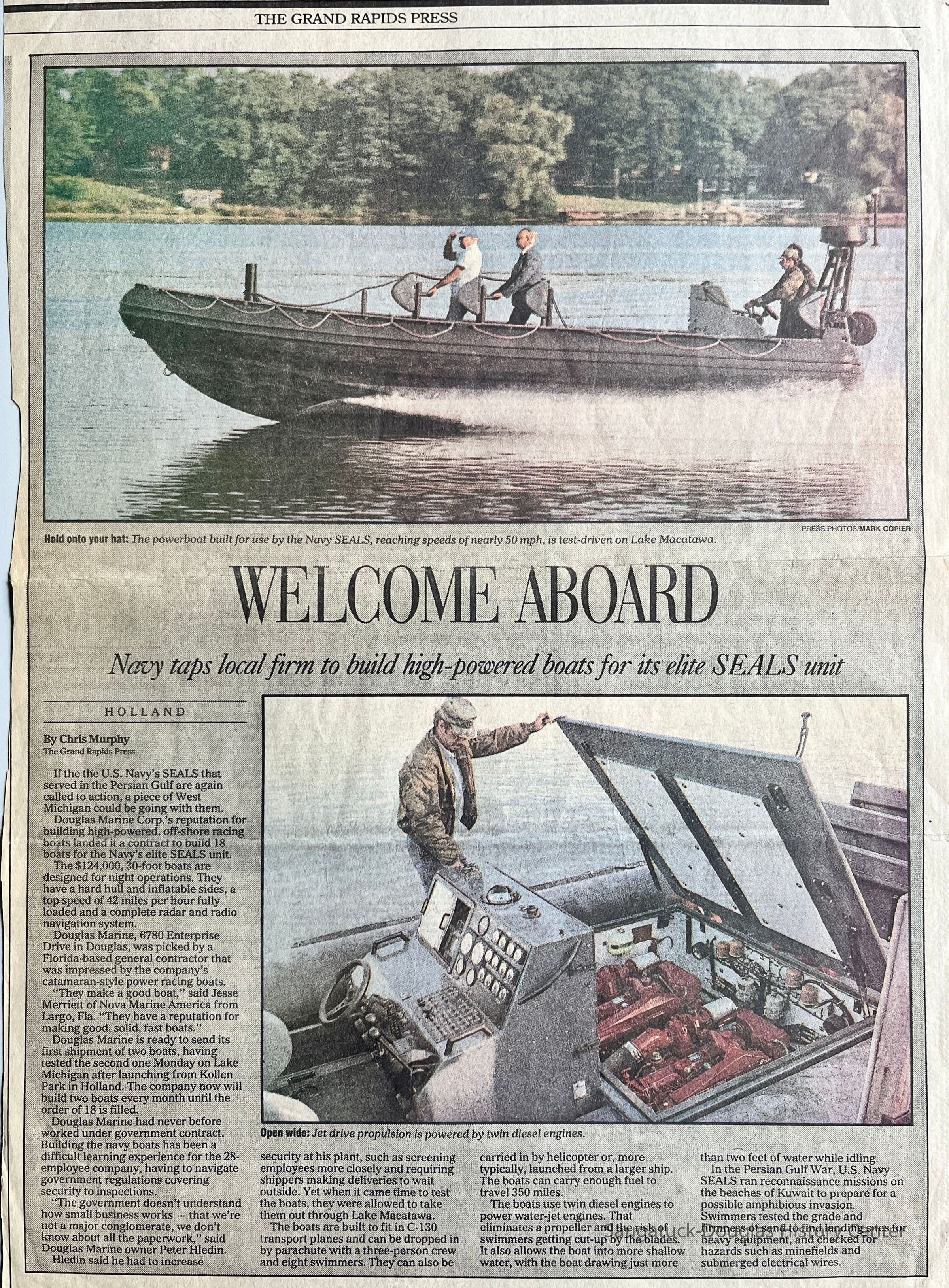 Grand Rapids Press, Sept. 3, 1992 article about Douglas Marine getting a contract to build 18 boats for the U.S. Navy SEALS.