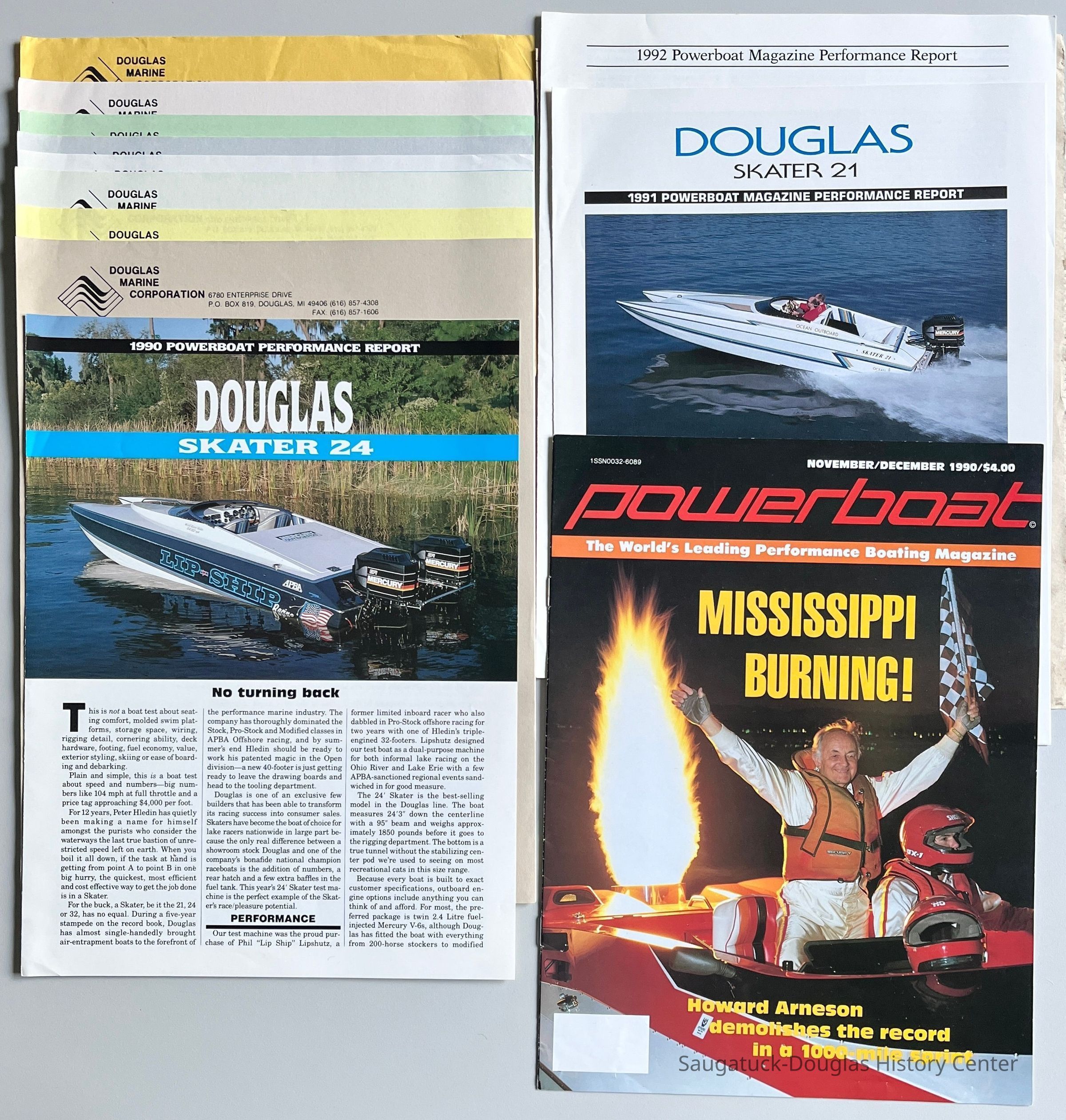 Four-page, color, Douglas Skater Powerboat Magazine performance reports for 1990, 1991, and 1992