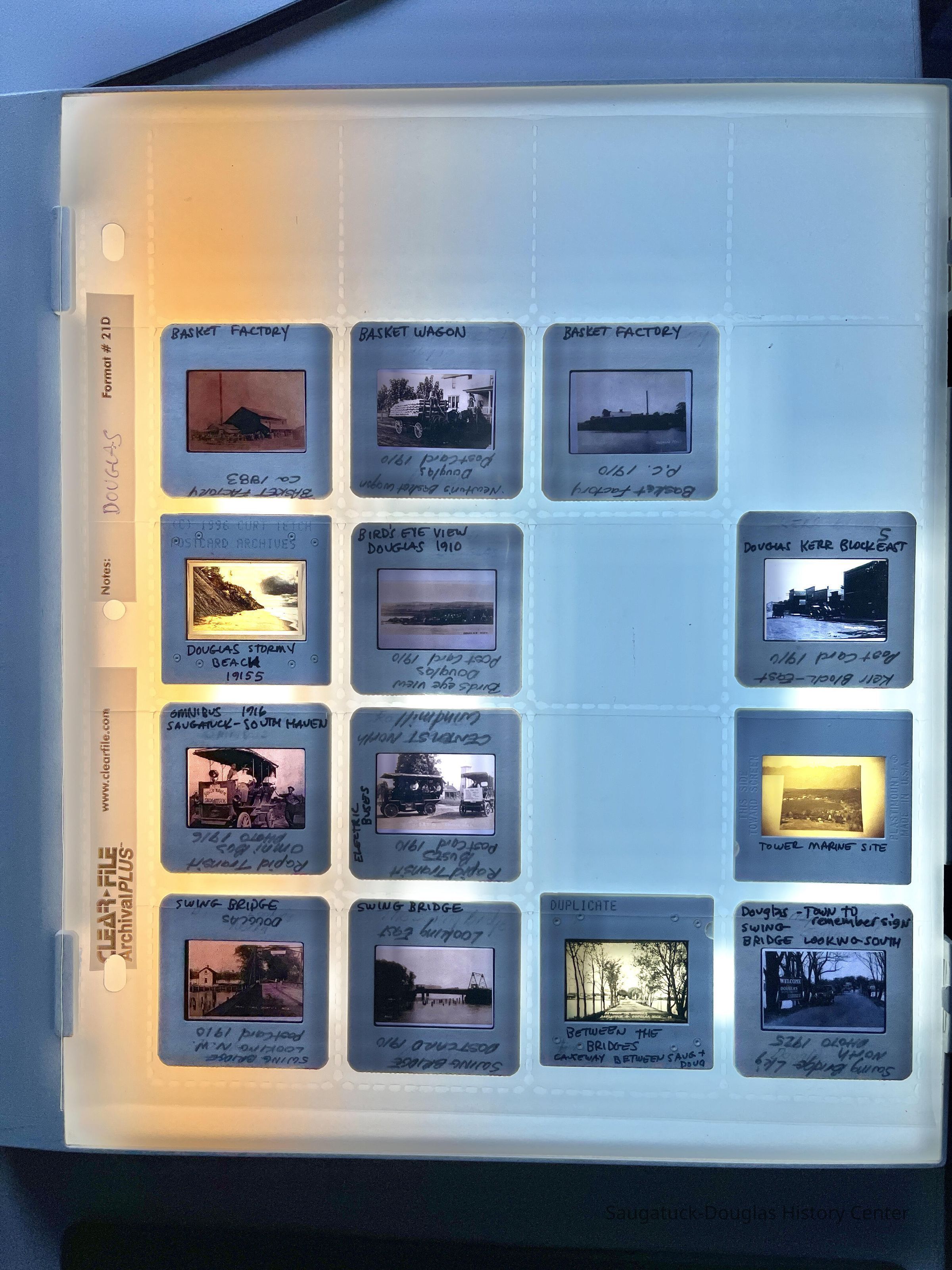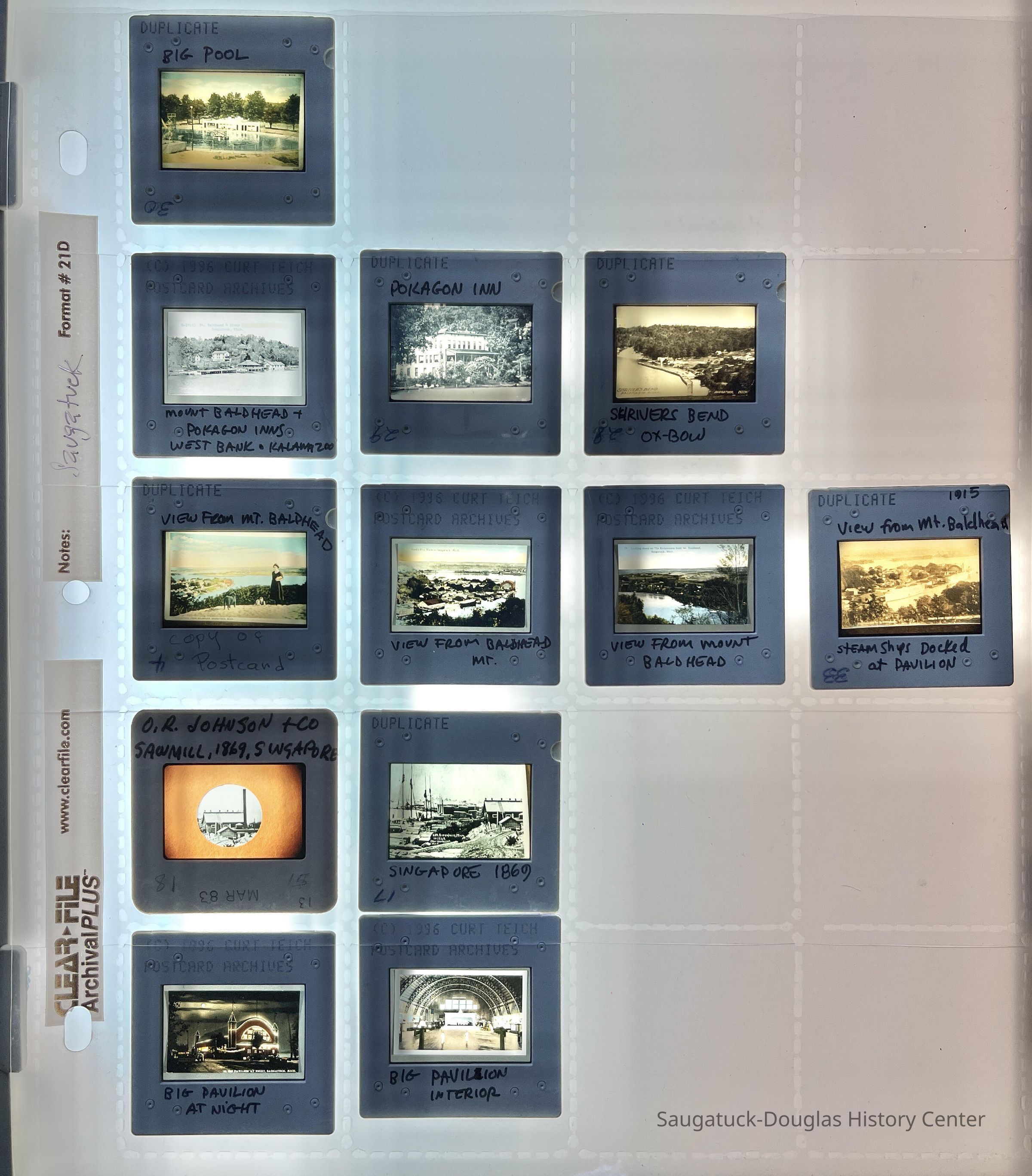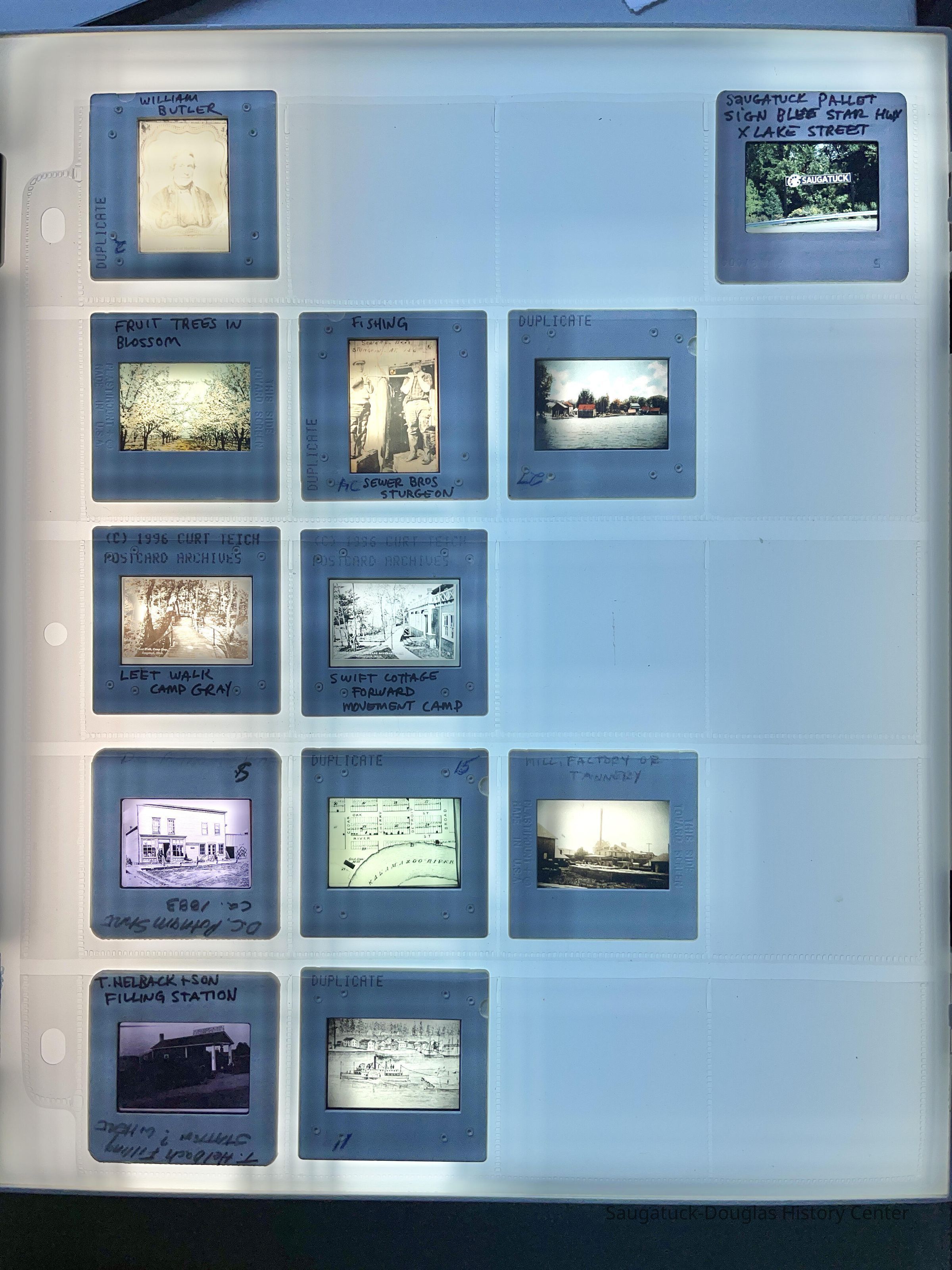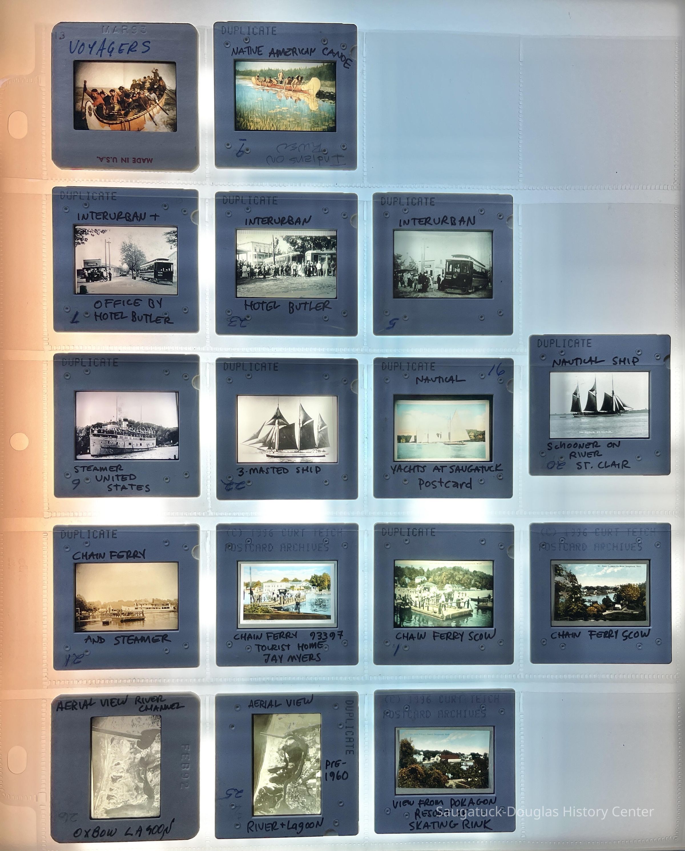 Four sheets of color slides with copies of historical photos, illustrations and postcards.