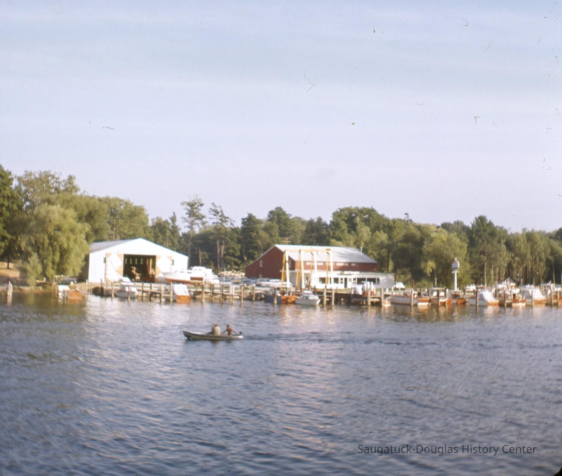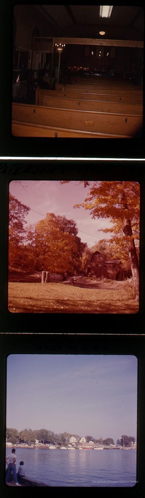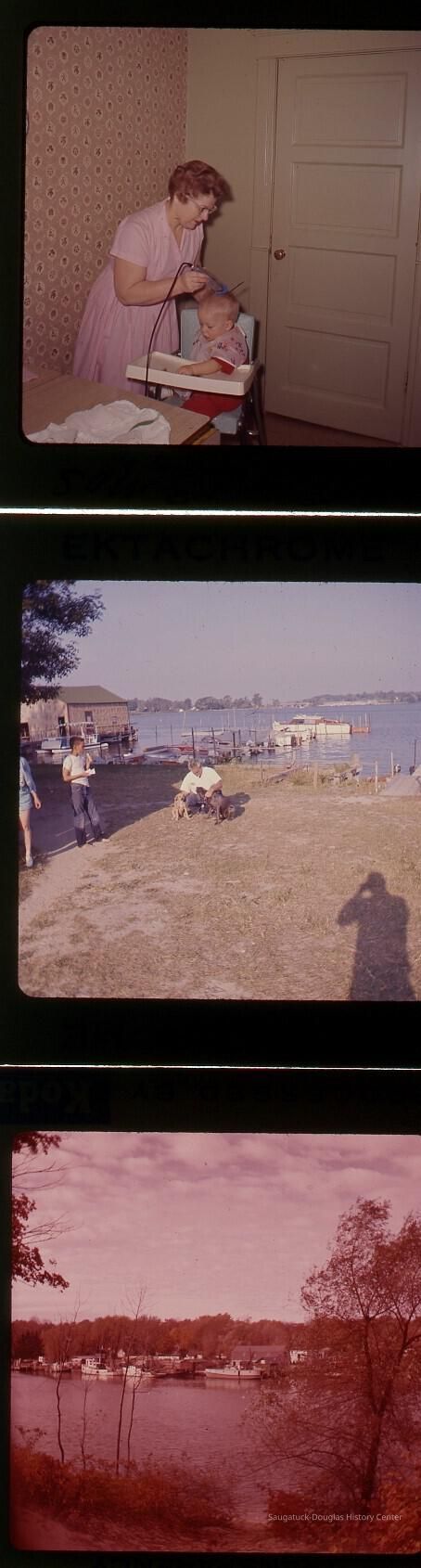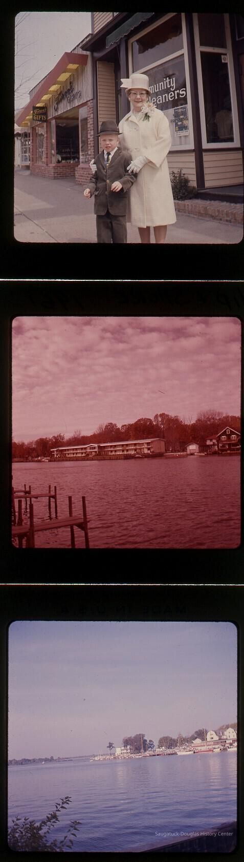 Shots of Saugatuck Yacht Service, church pews, Peterson Mill, Coral Gables, woman and child in front of Community Cleaners and Fris Gifts [Holland?], Ship n' Shore motel, the Blue Star bridge, docks and boats, Anchor Park and an Island Queen, a white house, a child getting a haircut, and the Sewers docks on Water Street.