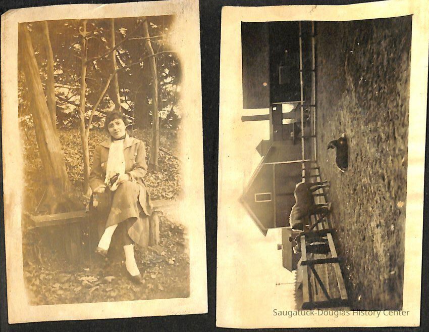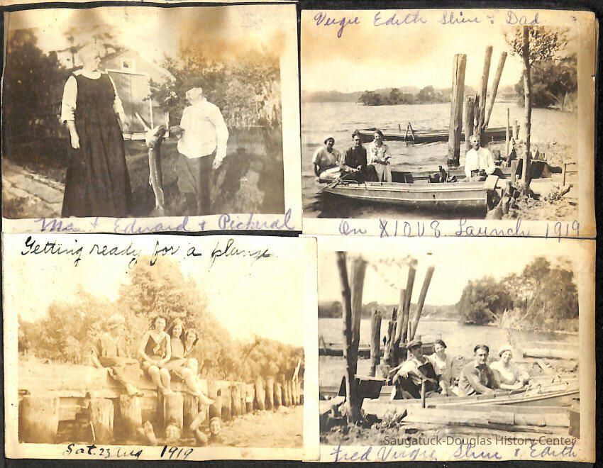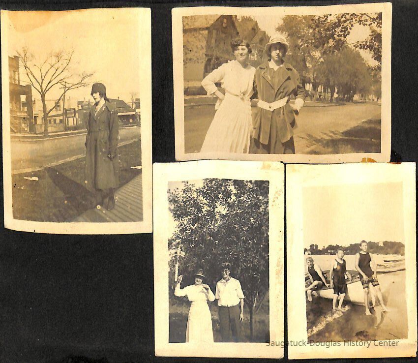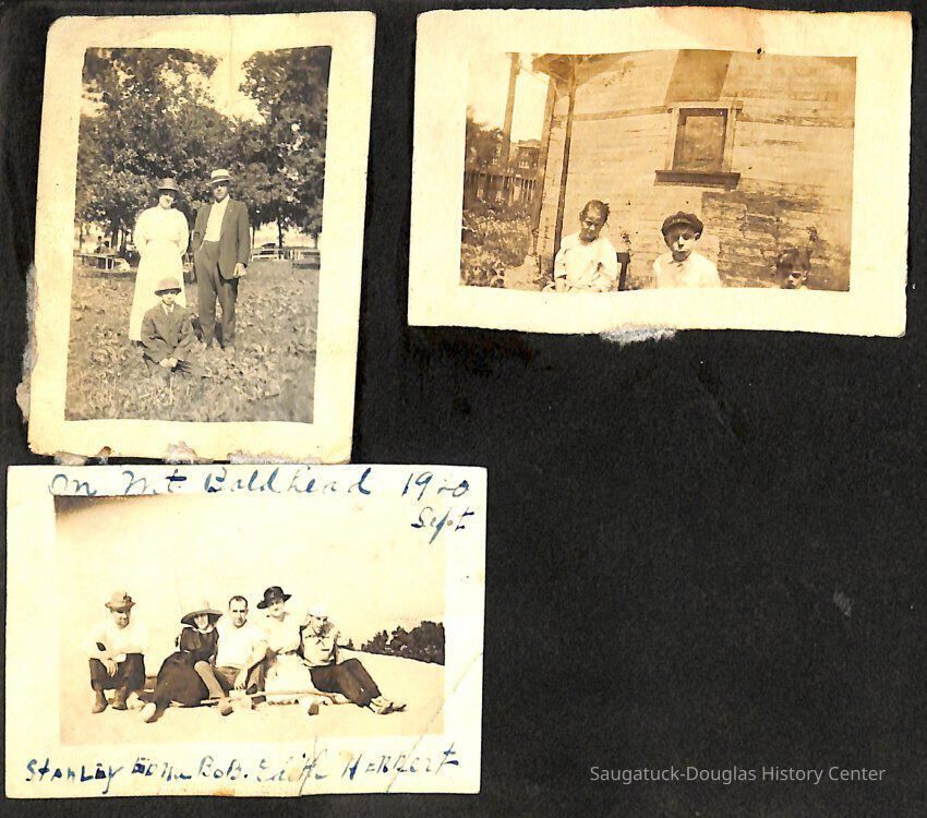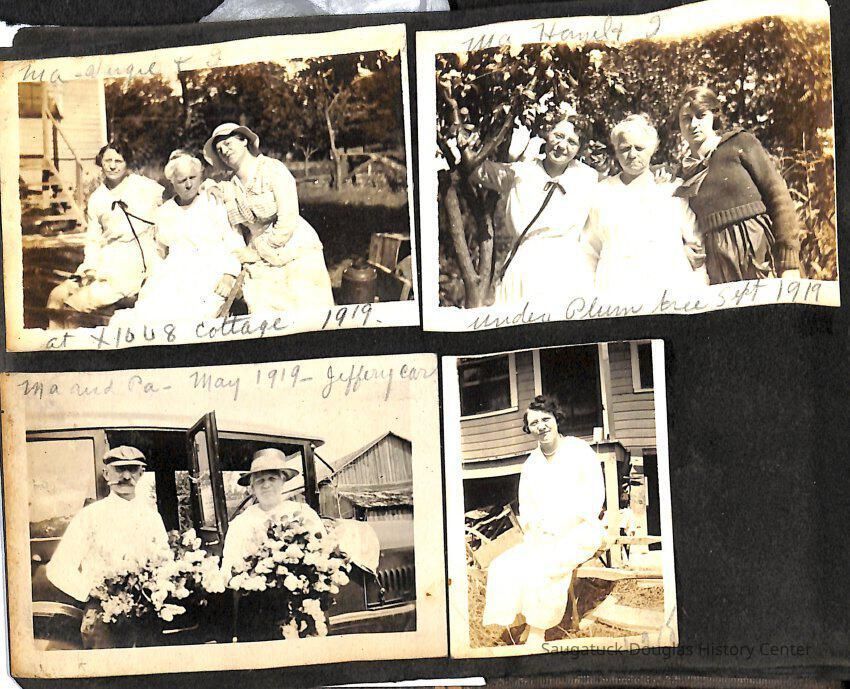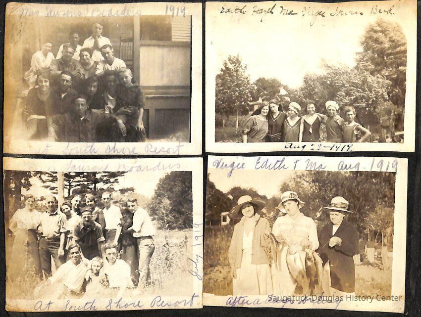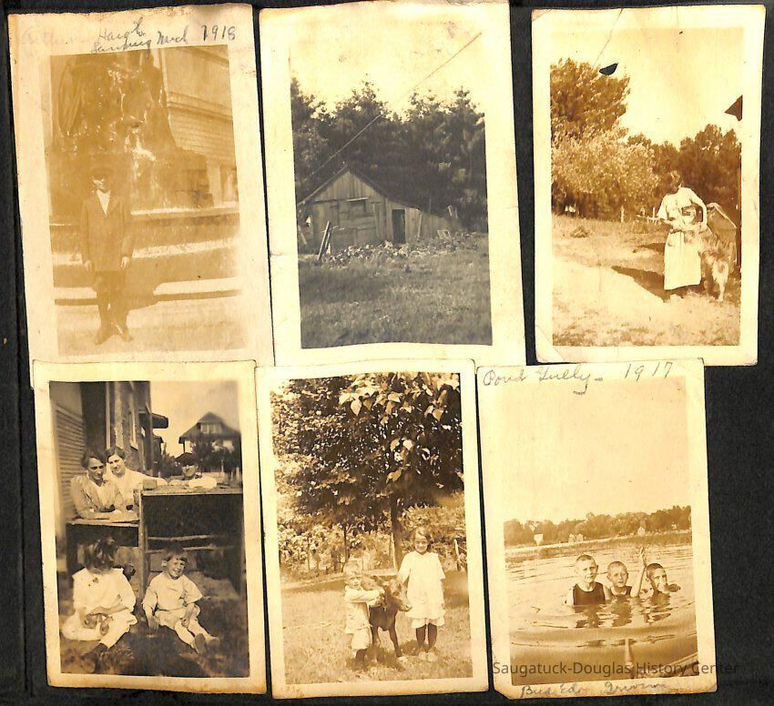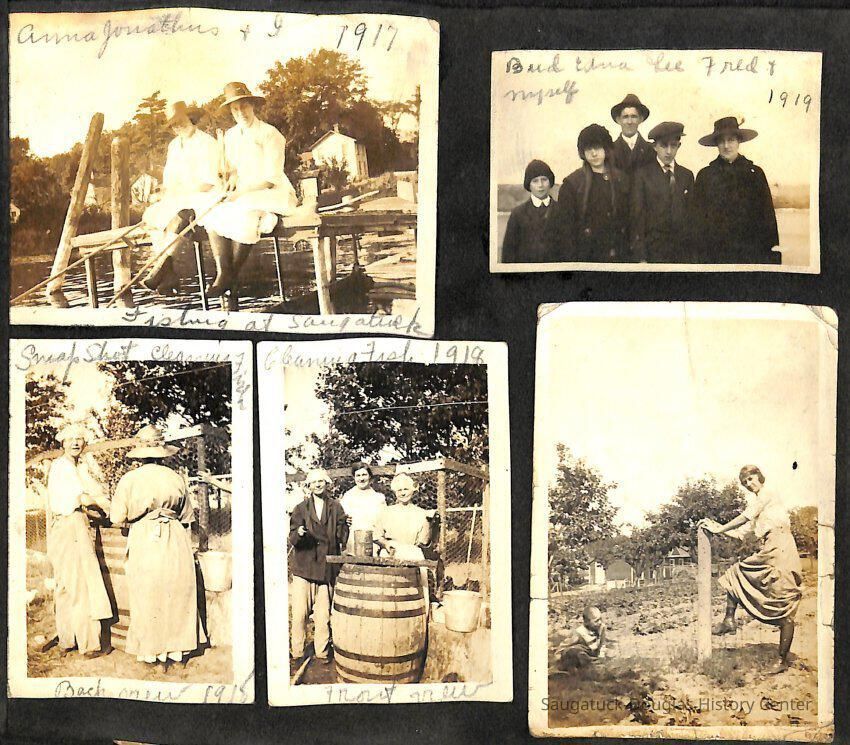 Family photo album for the Mokers. It contains photos from various vacations between 1917 and 1920. The majority of the photos are of the Moker family vacationing in Saugatuck at a cottage that their friends, the Reeves, owned. Almost all of the images have a caption on them, including names, dates, and locations. They are glued onto the pages, which have begun to deteriorate. The album cover is green with the phrase, "Snapshots" embossed on the front cover.