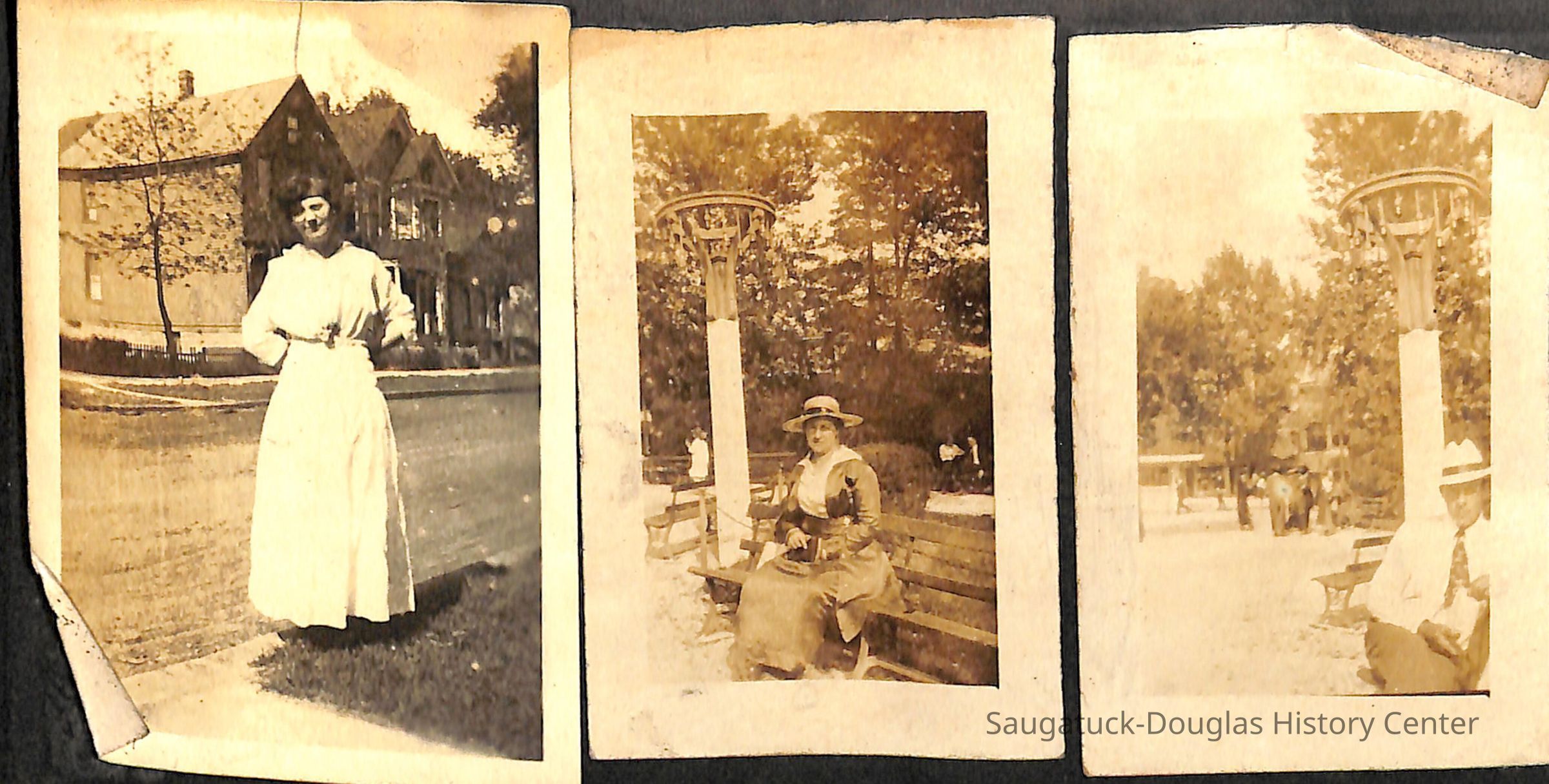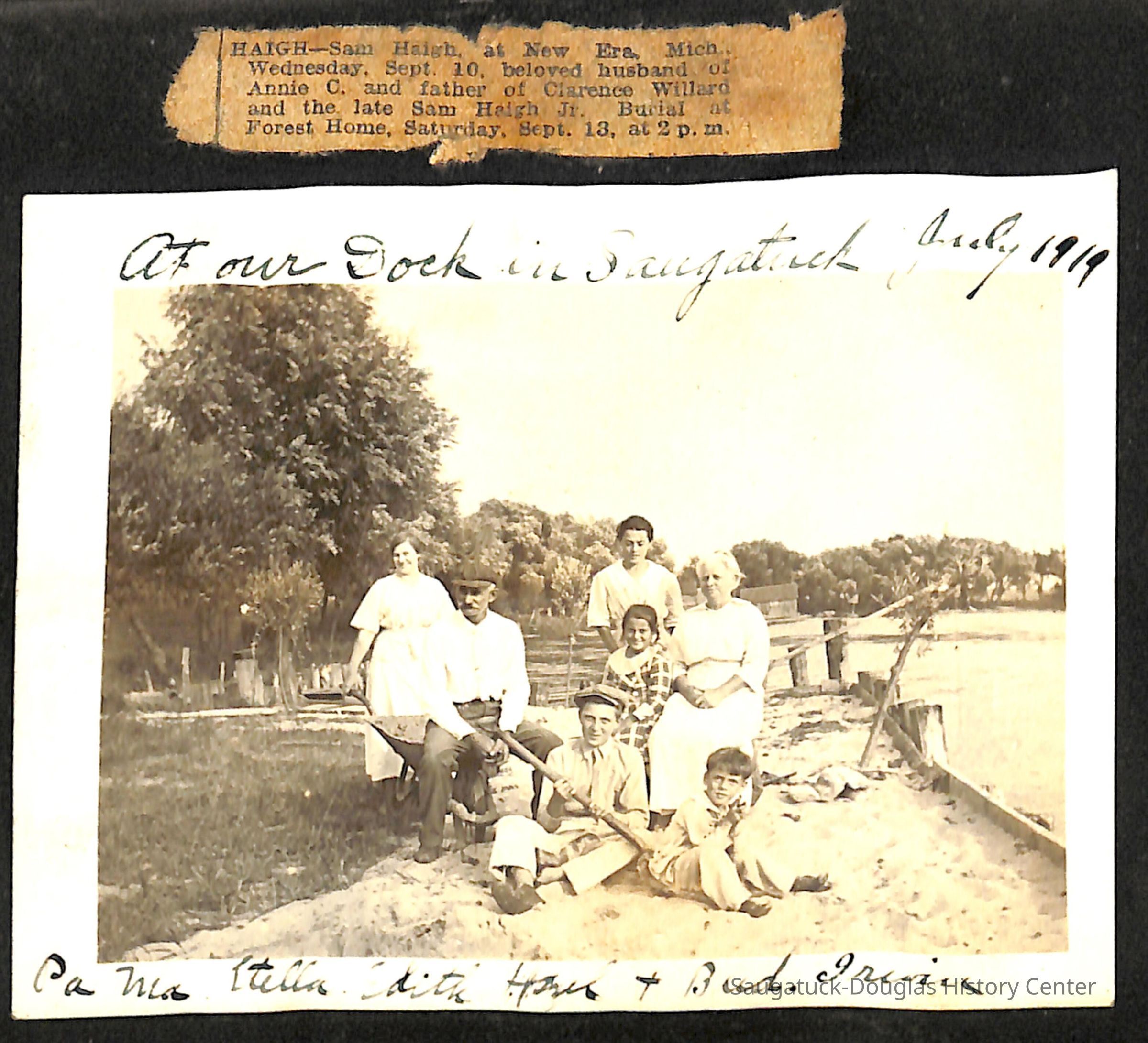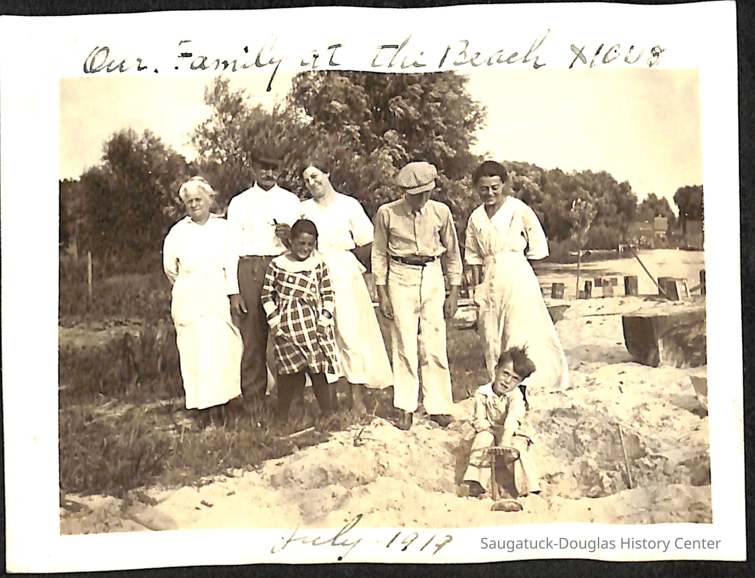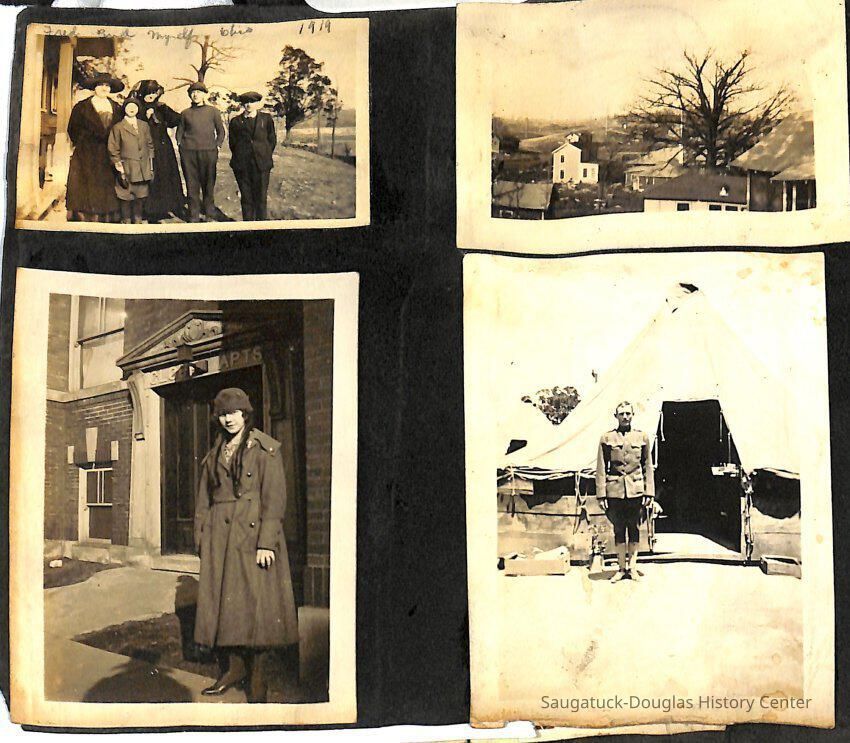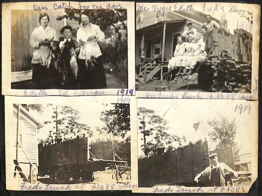 Family photo album for the Mokers. It contains photos from various vacations between 1917 and 1920. The majority of the photos are of the Moker family vacationing in Saugatuck at a cottage that their friends, the Reeves, owned. Almost all of the images have a caption on them, including names, dates, and locations. They are glued onto the pages, which have begun to deteriorate. The album cover is green with the phrase, "Snapshots" embossed on the front cover.