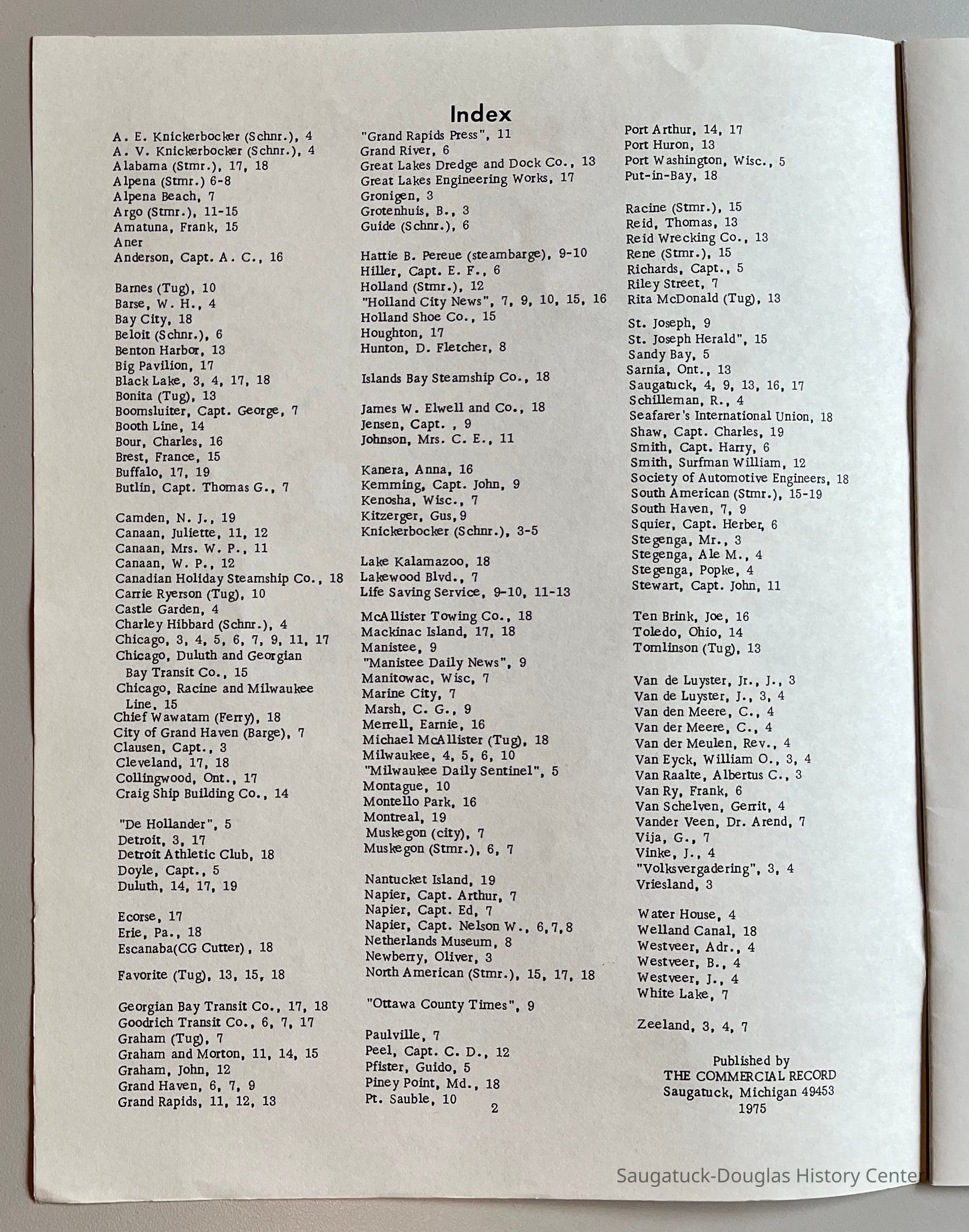 The index is on page 2. Text includes many large black-and-white photos of the ships and text from newspaper accounts about the wrecks.Context