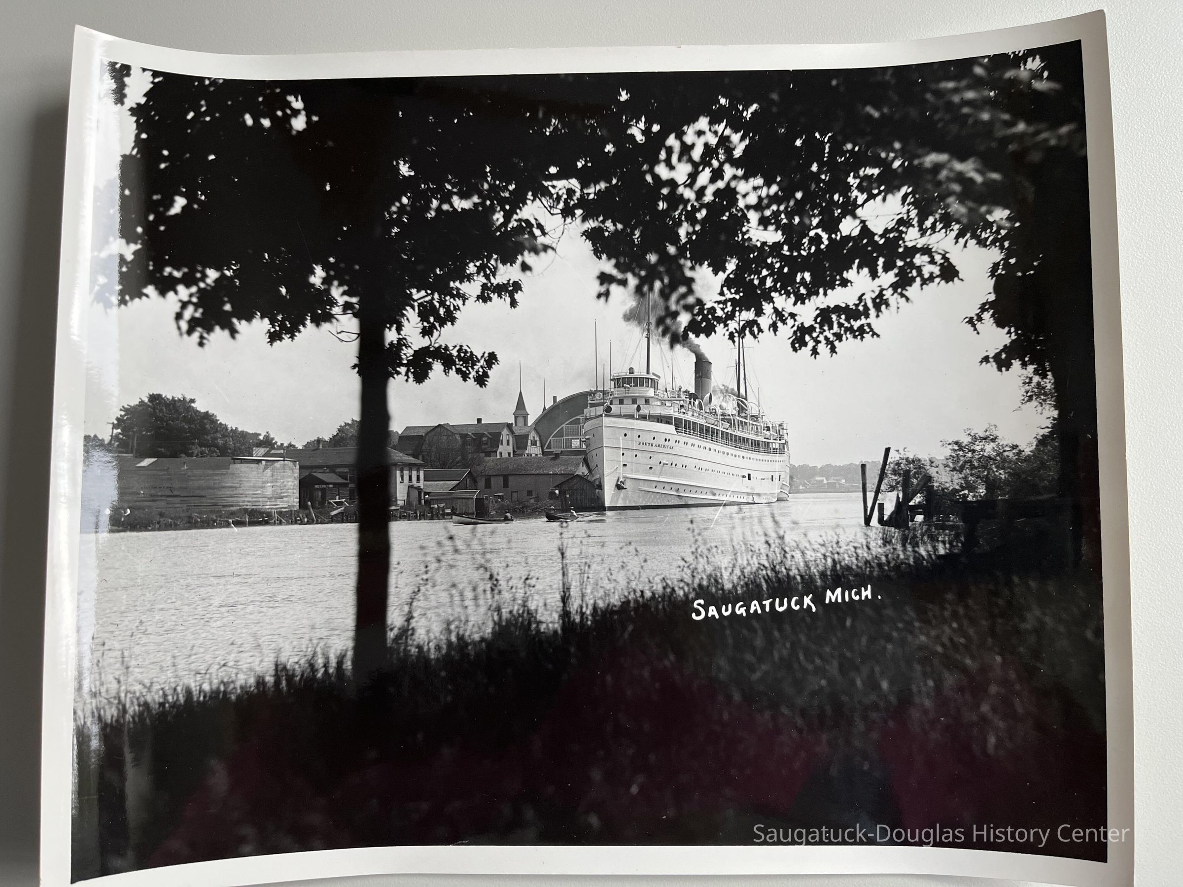 The photo shows the SS South American with smoke pouring from her smokestack . (The photo is likely prior to 1924 when she was fitted with a second smokestack.)