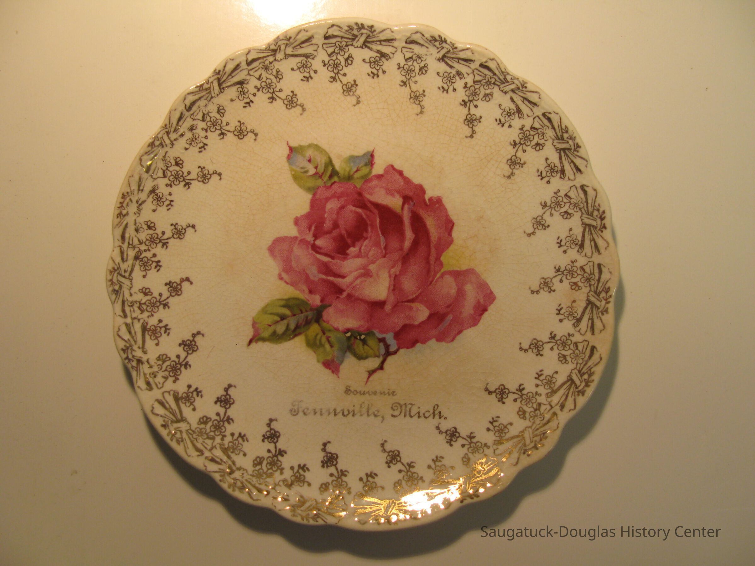 6 1/4 " white china plate with gold decor around the rim, a red rose in the center and the words "Souvenir of Fennville, Mich in gold under the rose.Collection