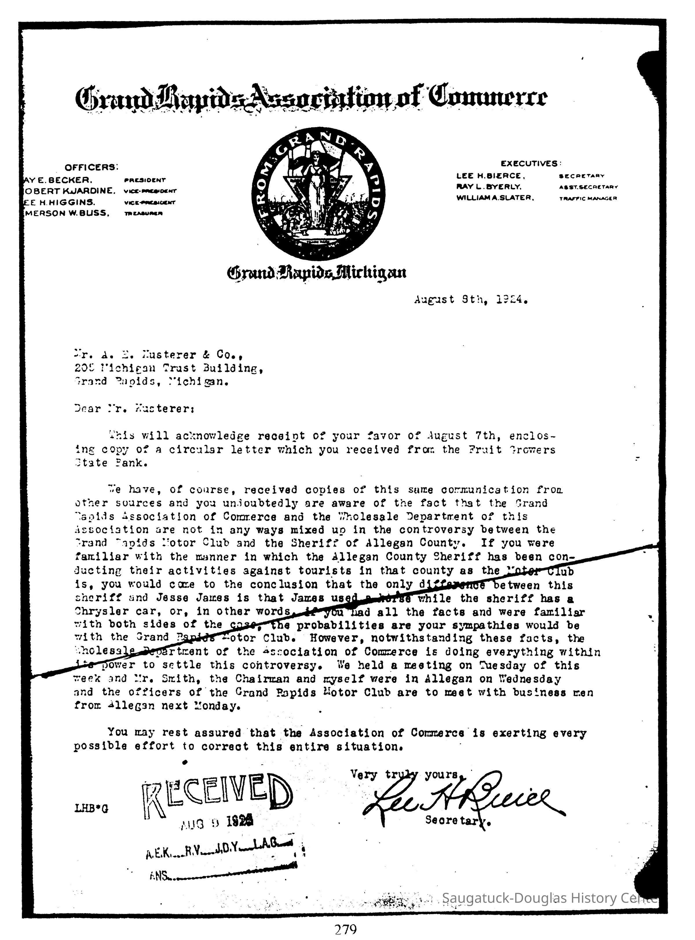Copy of a letter from the Grand Rapids Association of Commerce written to a Grand Rapids businessman in 1924. They are discussing a speed trap that the Allegan County Sheriffs office had established in the Saugatuck area which had caused the Grand Rapids Motor Club to call for a boycott of the area. Note his statement concerning the difference between Jesse James and the Allegan sheriff. This print was made from an old glass negative, which explains the crack. In the days before copy machines if you wanted to make several copies of something one way was to photograph the page and print the copies from the photographic negatives. This one was made in the Simonson studio.Collection