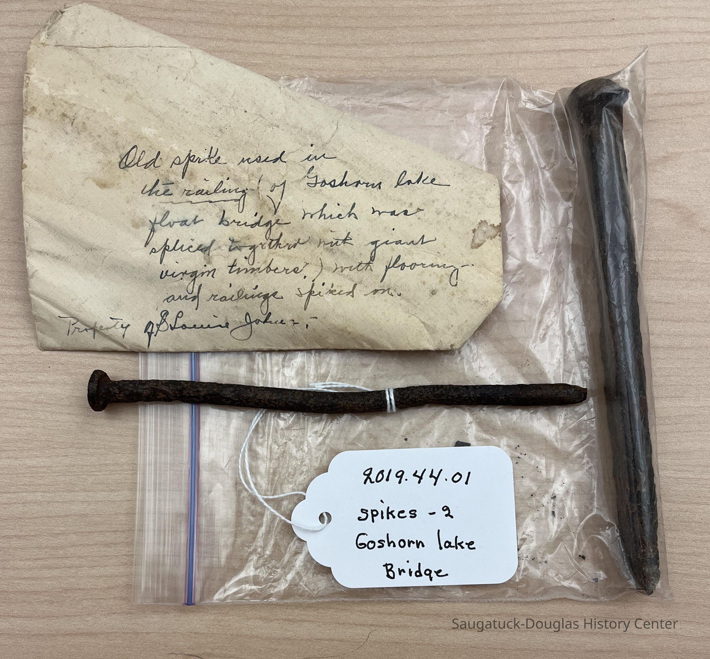 Old spikes used in the railing of the Goshorn Lake floating bridge which was spliced together with giant virgin timbers held together with these large spikes.Collection