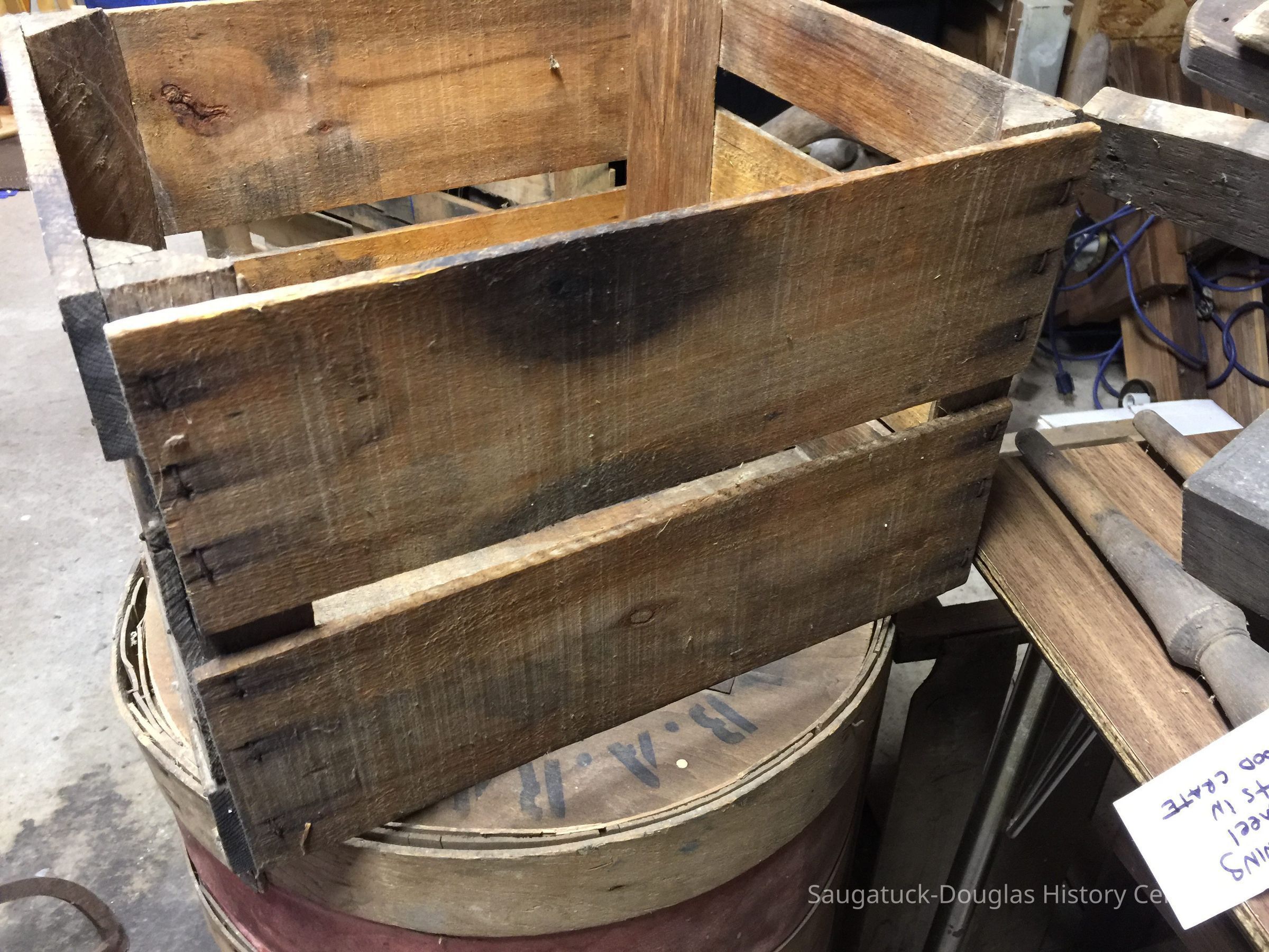 Crate of wooden parts thought to be a spinning wheel.Collection