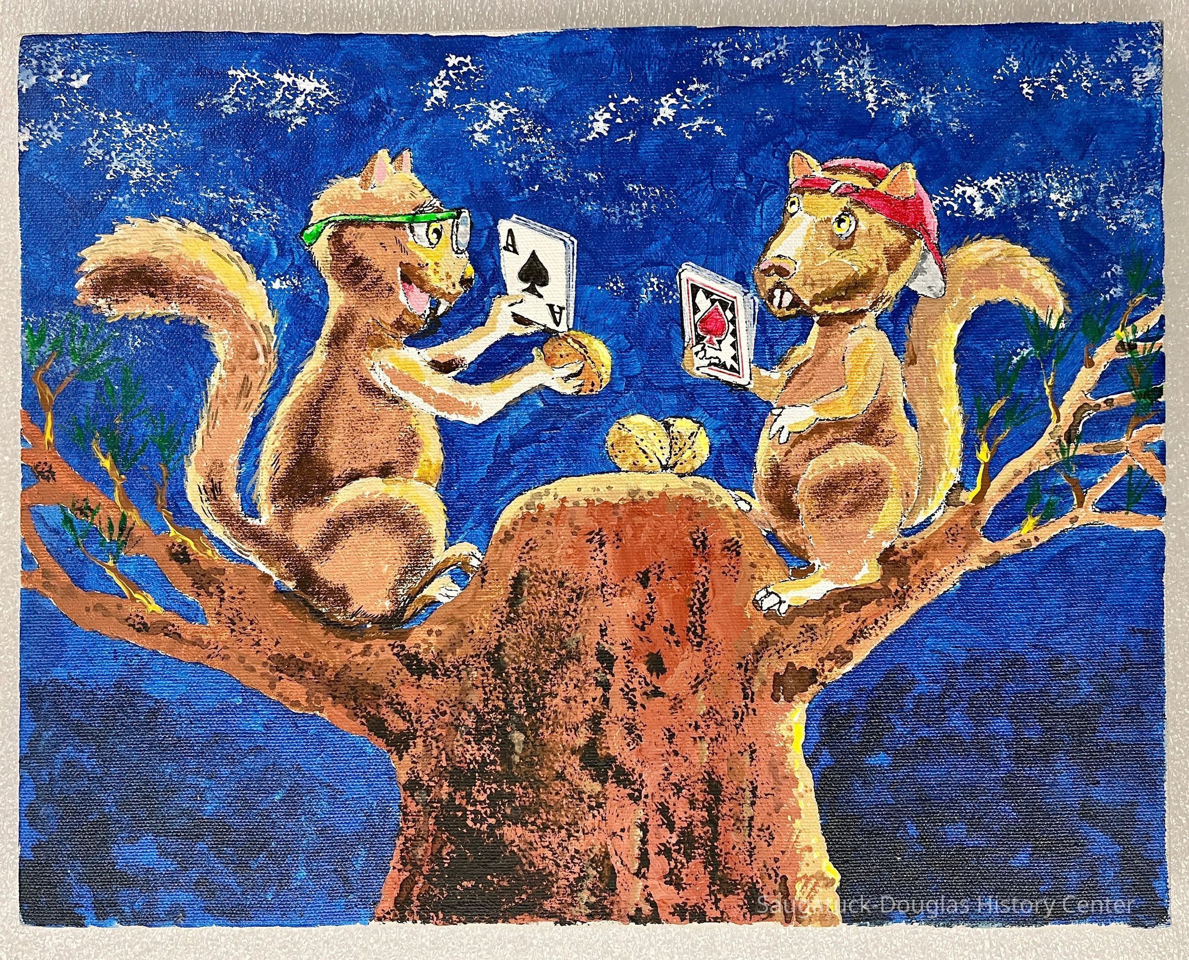 Humorous painting of two squirrels playing cards. The two rodents sit on a tree trunk with branches for chairs. They are betting with nuts. One squirrel is wearing green glasses, they other is wearing a red baseball cap backwards. The background is blue with mottled with black and white. Unframed mass-produced canvas stapled on wooden stretchersType of Painting