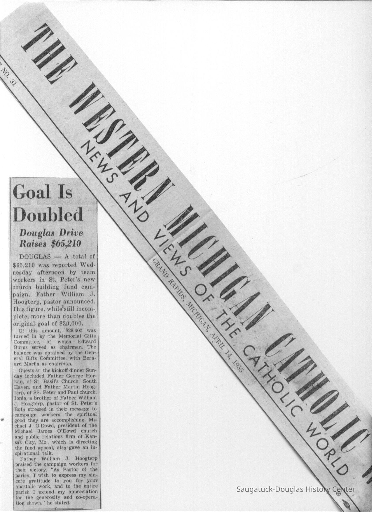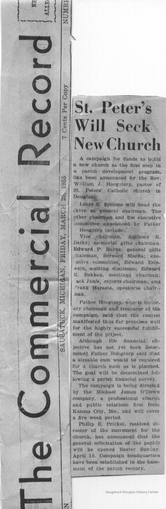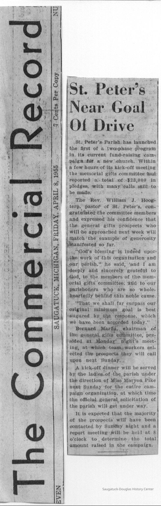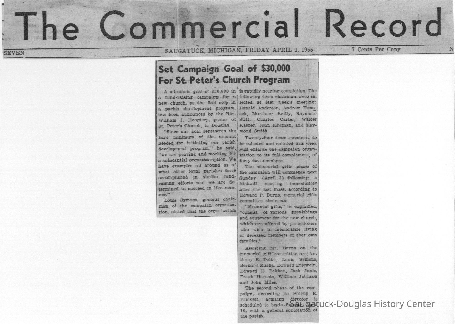 CD containing 164 files and folders of scanned photos and documents. The images include color and black-and-white photos of church buildings, priests, weddings and community supporters plus newspaper clippings, correspondence, budgets, fundraising totals, press releases, a "Men of St. Peter's" directory and deeds. A representative collection of the images have been included in this entry. Some images on the CD are duplicates.Photograph Details