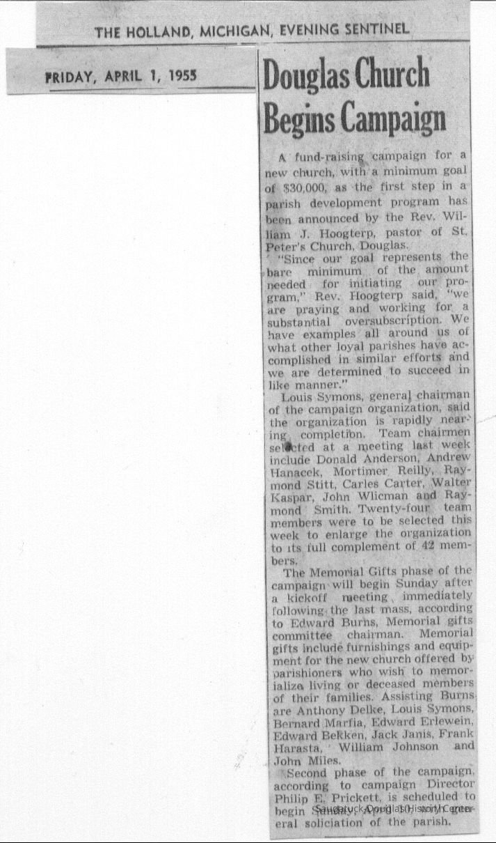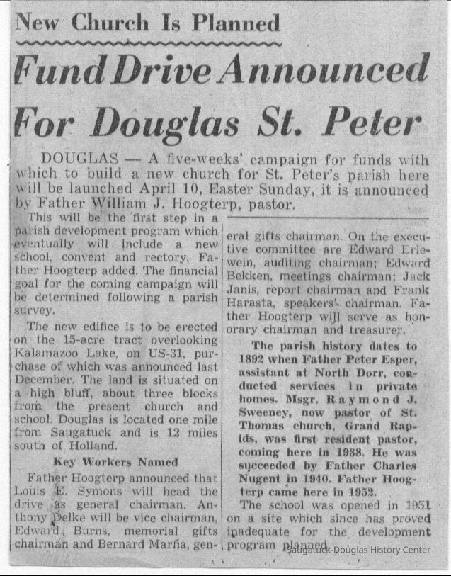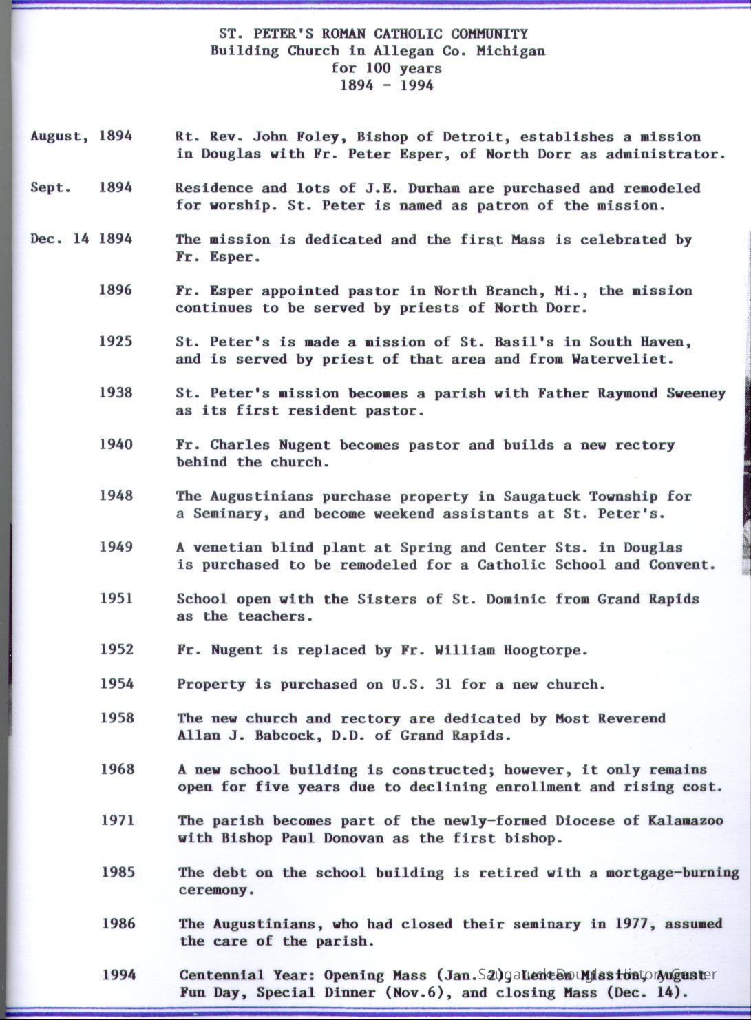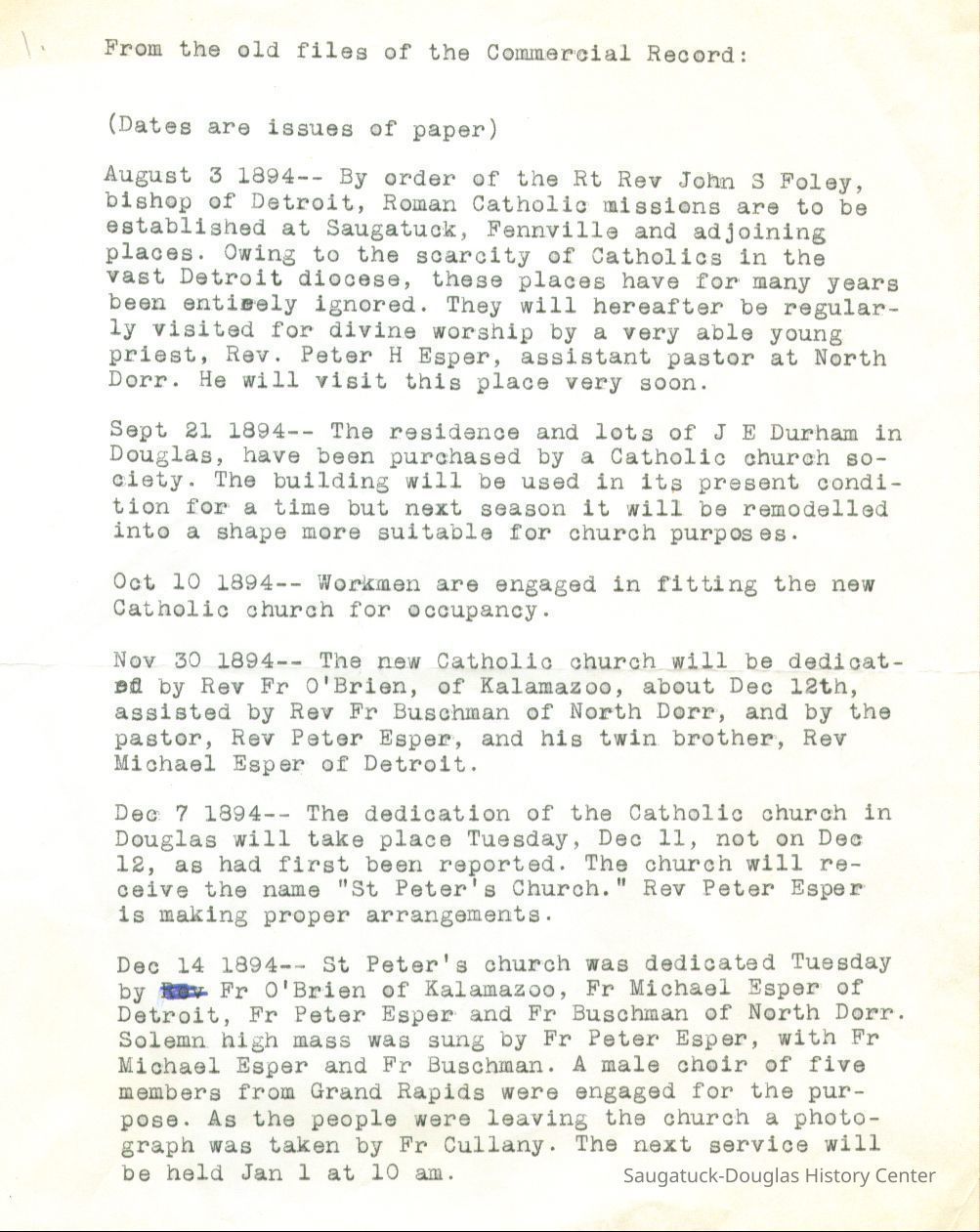 CD containing 164 files and folders of scanned photos and documents. The images include color and black-and-white photos of church buildings, priests, weddings and community supporters plus newspaper clippings, correspondence, budgets, fundraising totals, press releases, a "Men of St. Peter's" directory and deeds. A representative collection of the images have been included in this entry. Some images on the CD are duplicates.Photograph Details