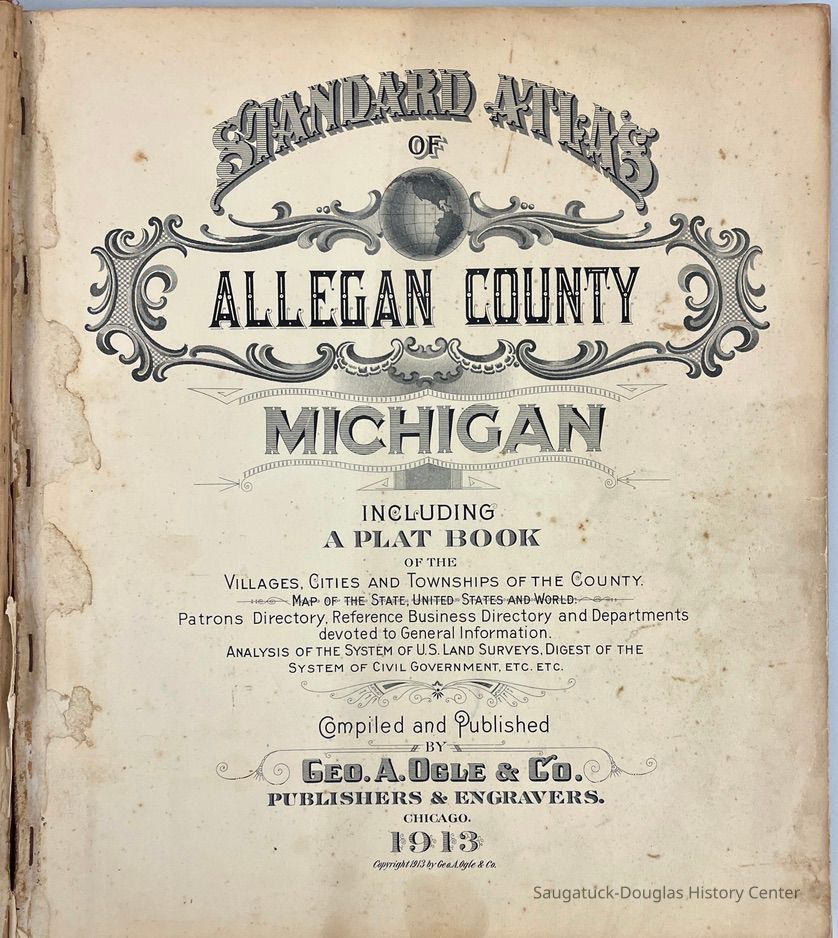 Second copy in collection of the "Standard Atlas of Allegan County, Michigan, Including a Plat Book" compiled and published by Geo. A. Ogle & Co. 1913. Large format hard-bound book with beige paper tape reinforcing cover.