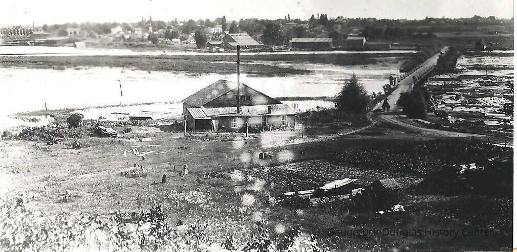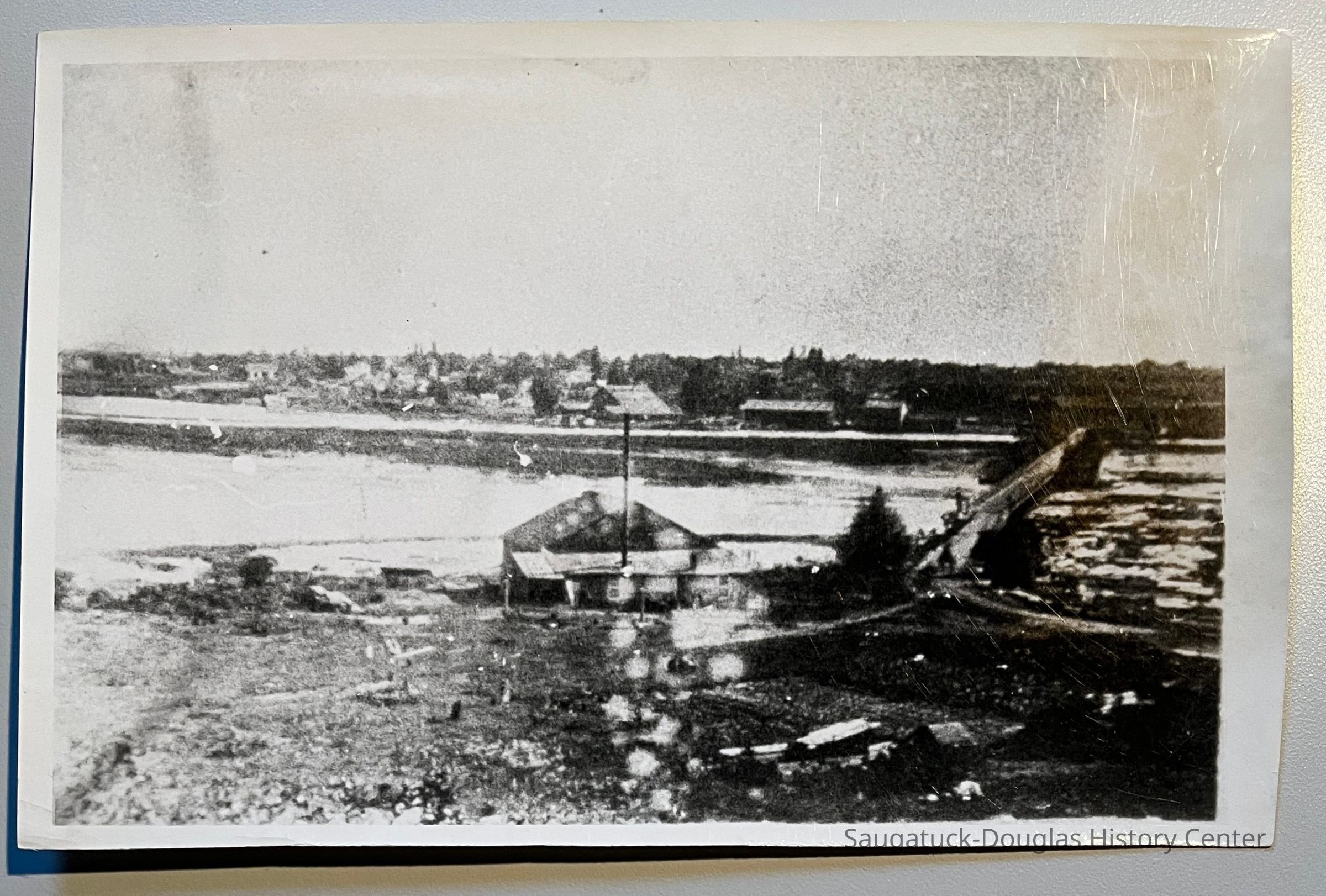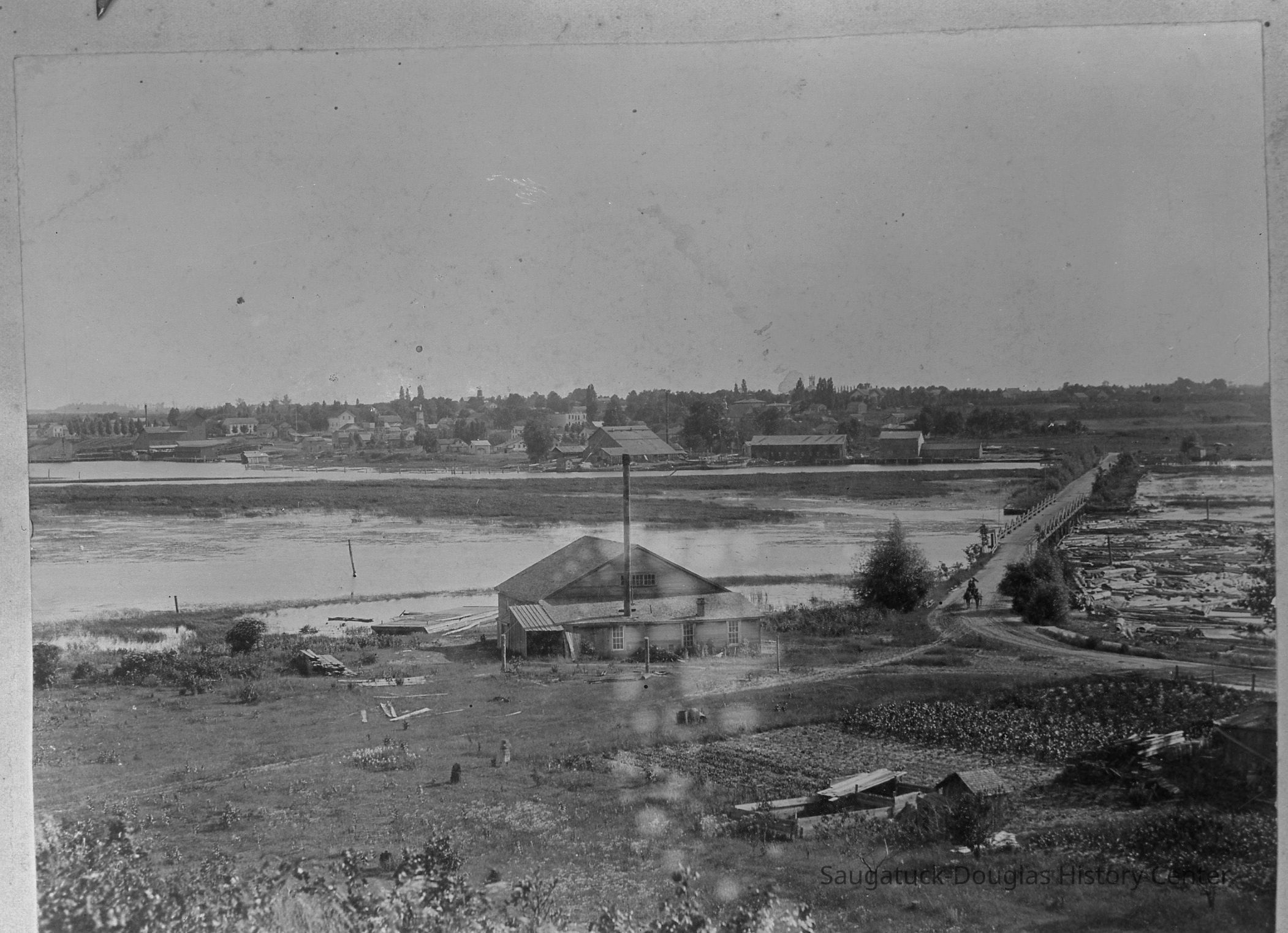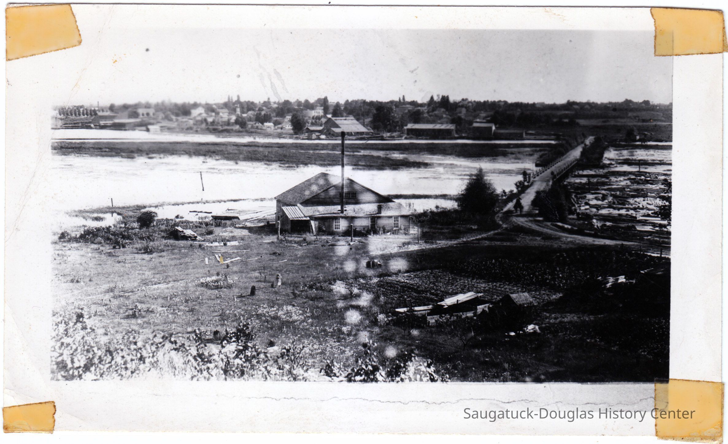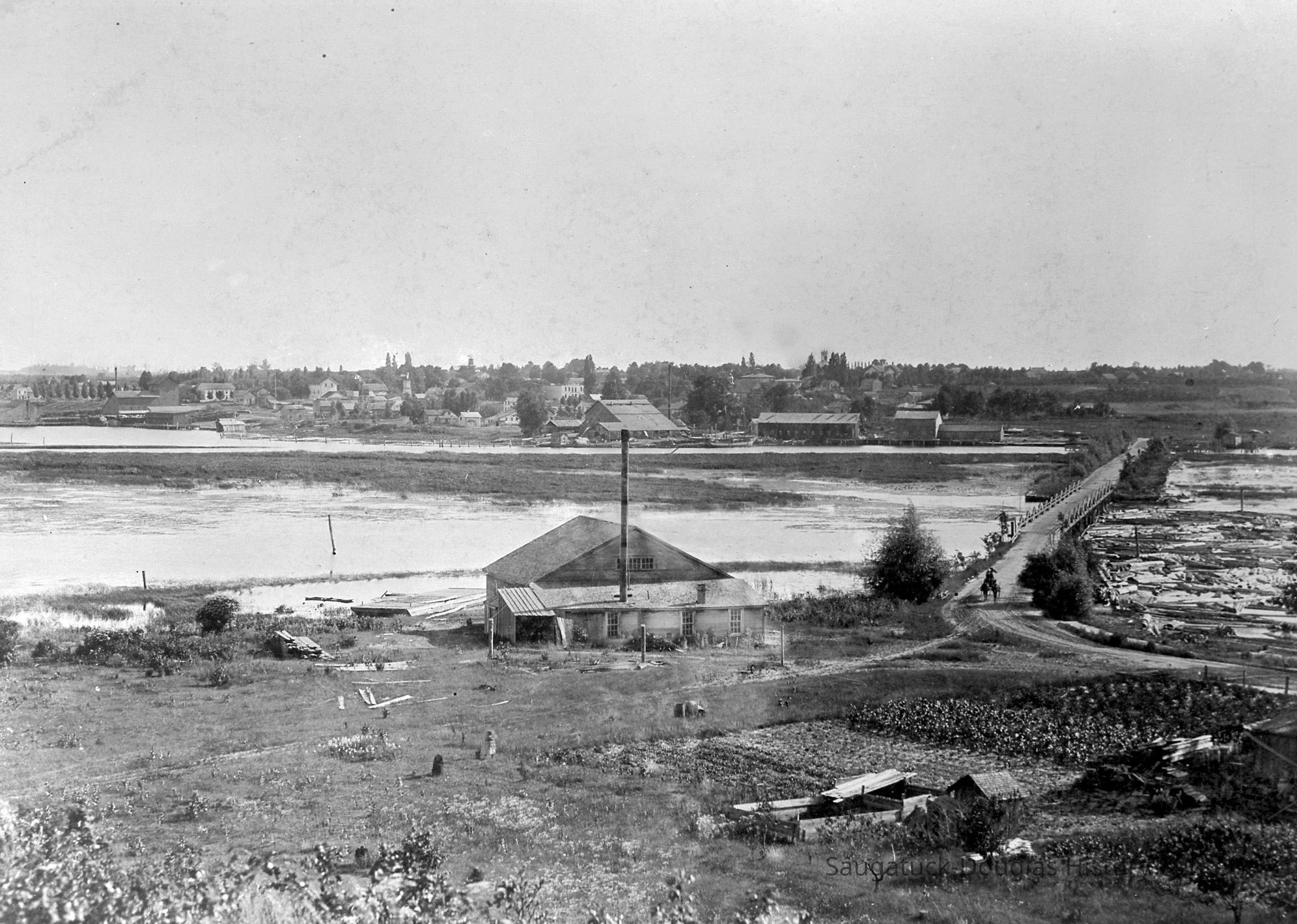 View from an elevated position of a building with a simple roof. A shed addition on the east side of the building has a tall smokestack. The building is south of the swing bridge causeway to Douglas. Douglas and the basket factory can be seen on the other side of the Kalamazoo.