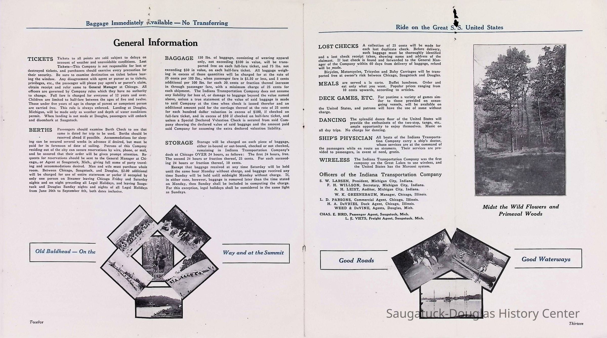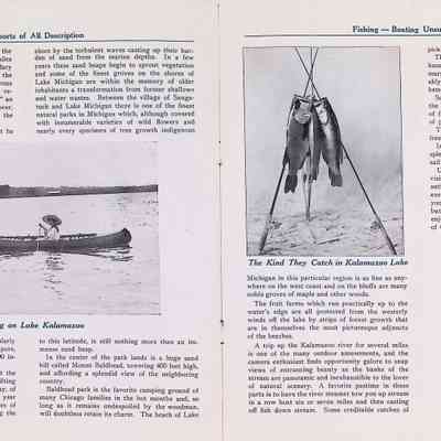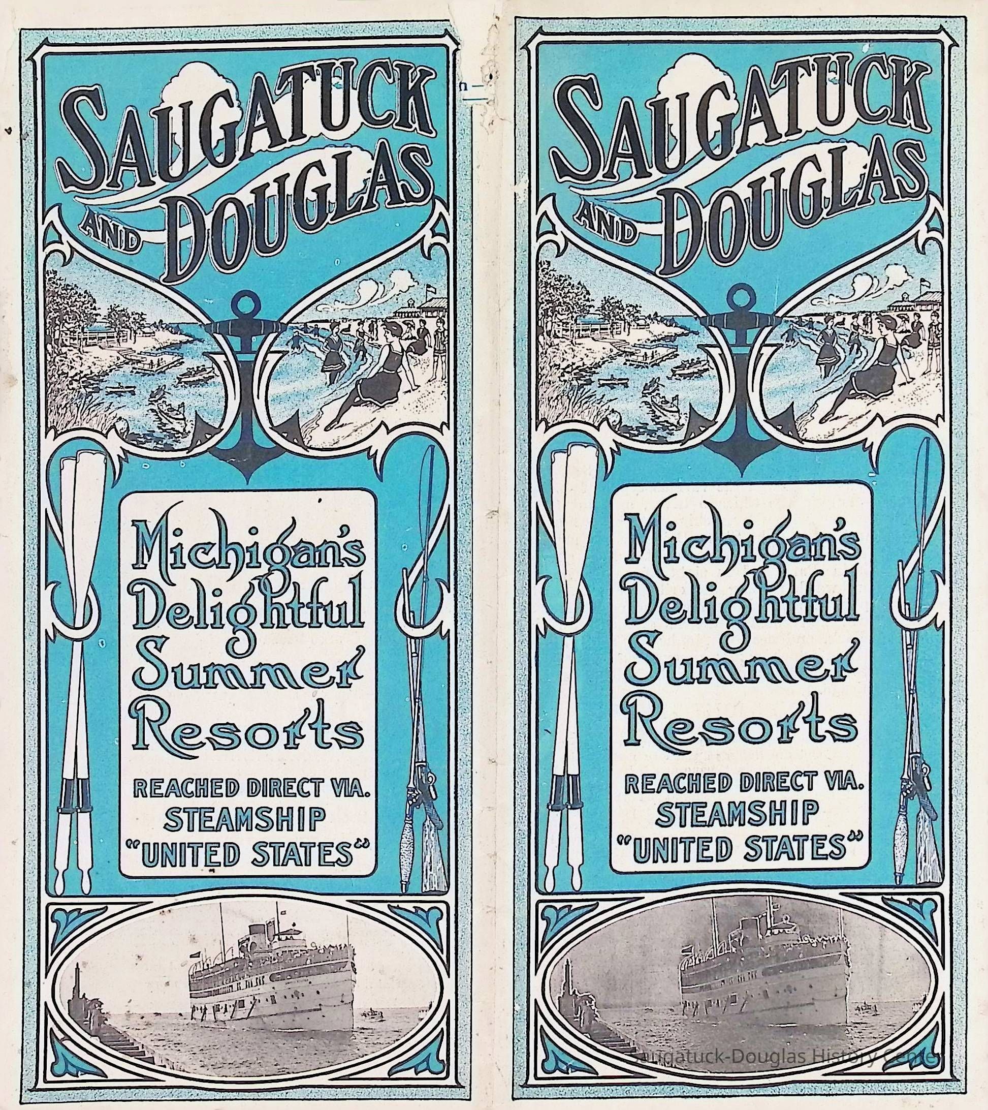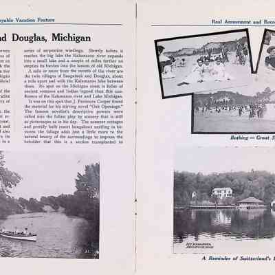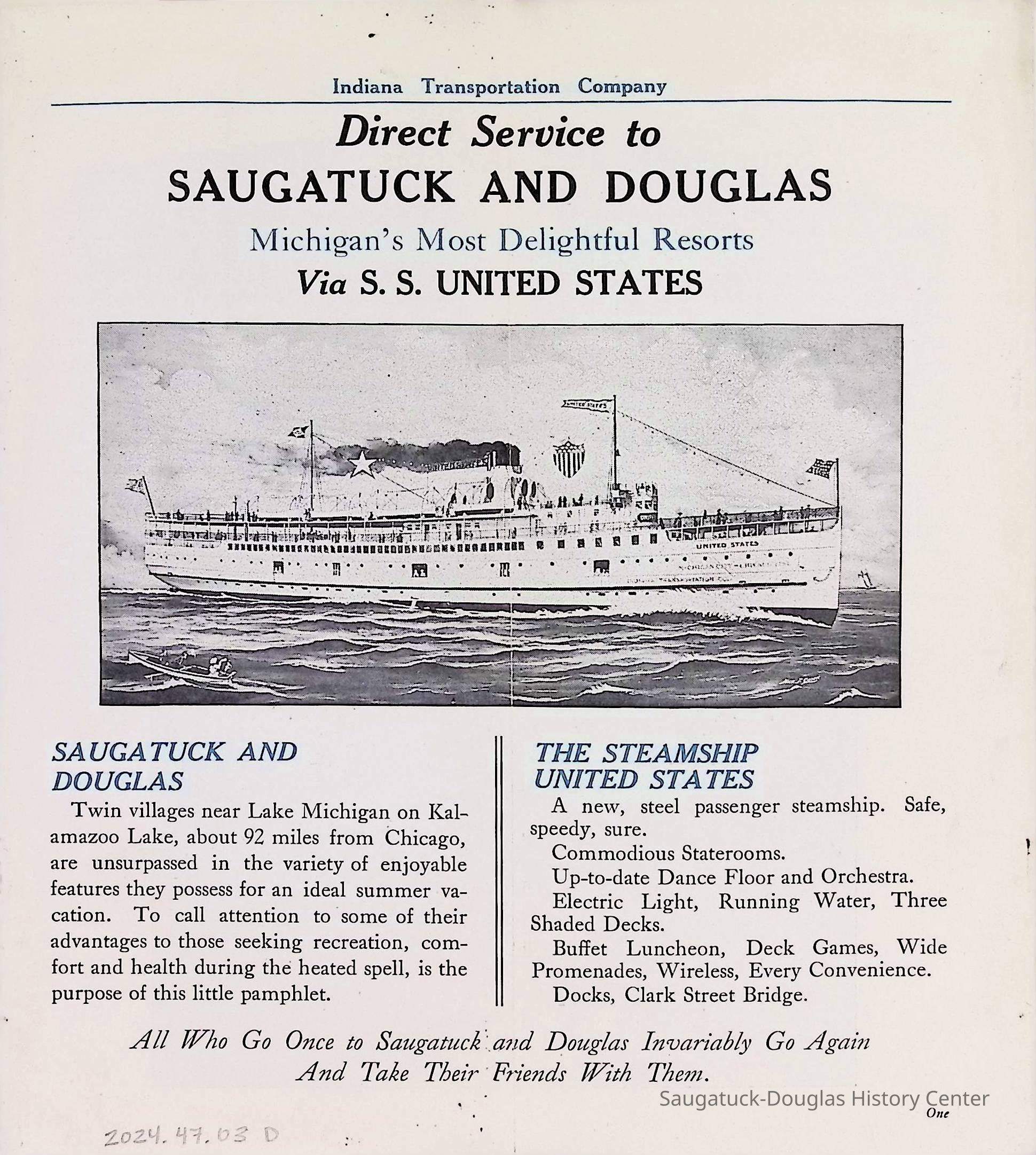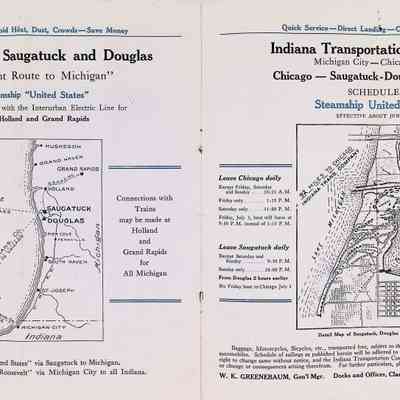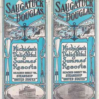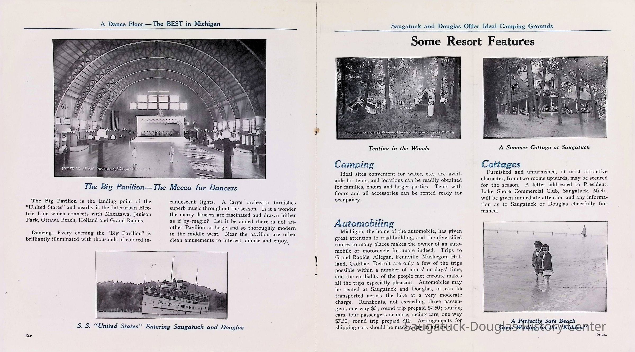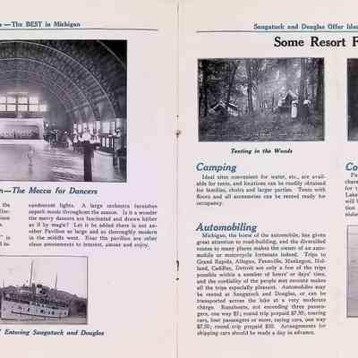D. "Michigan's Delightful Summer Resorts reached direct via steamship United States" Indiana Transportation Company brochure. Pages, below, scanned by Mark Reid in 2025. Photo of Big Pavilion indicates brochure printed after 1909. Promotes Saugatuck and Douglas as a resort that offered bathing (beaches), canoeing, fishing, dancing, camping, automobiling, cottages, a list of guest houses and lodging with rates and maps