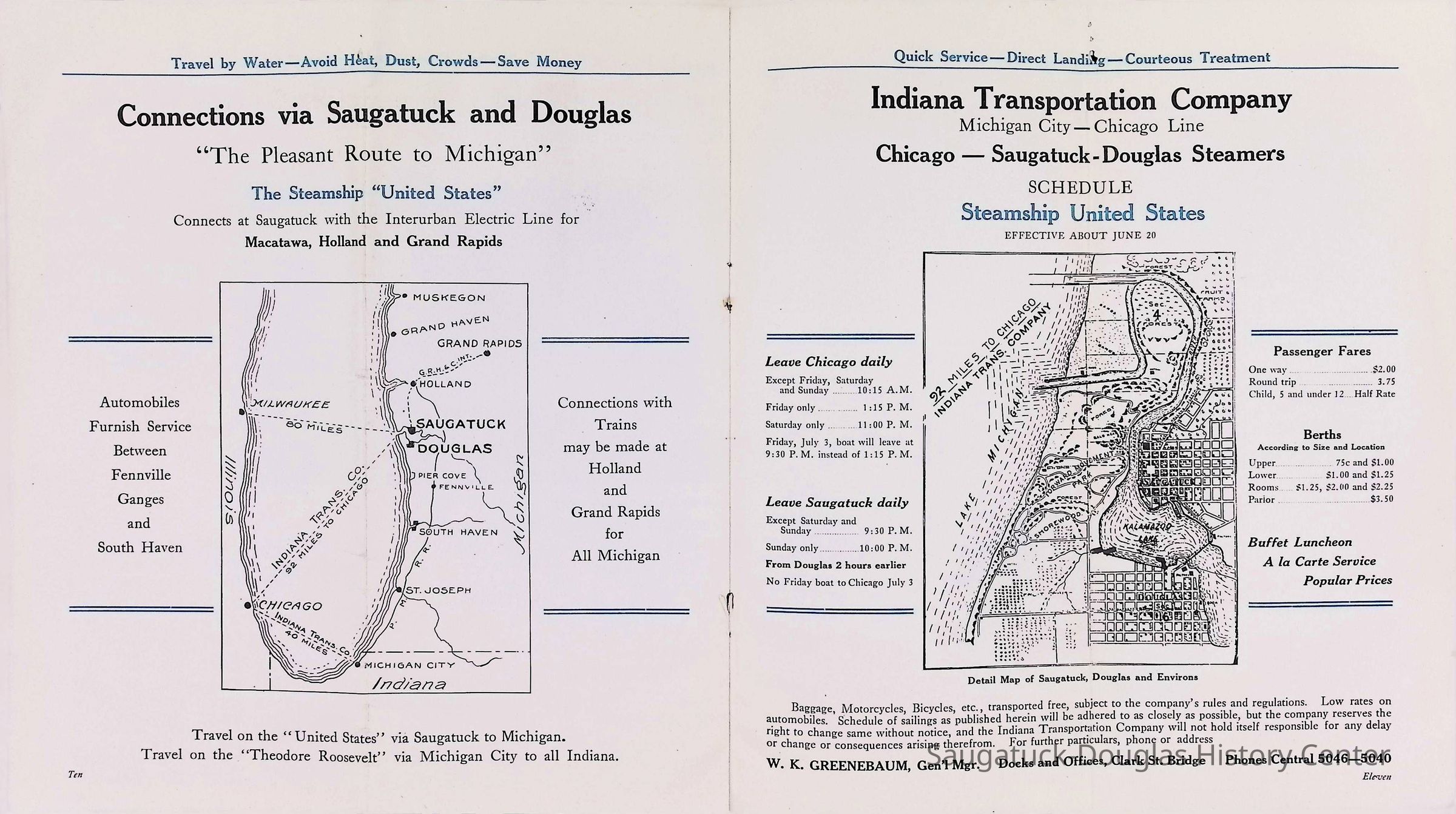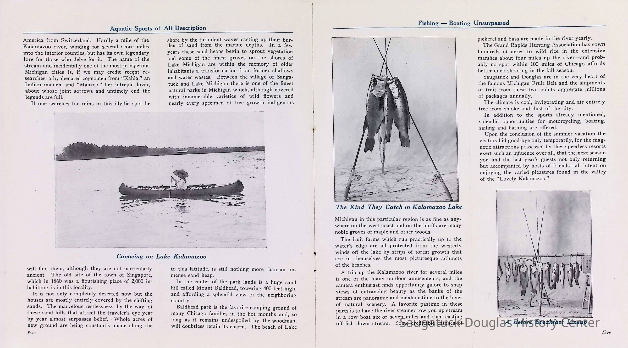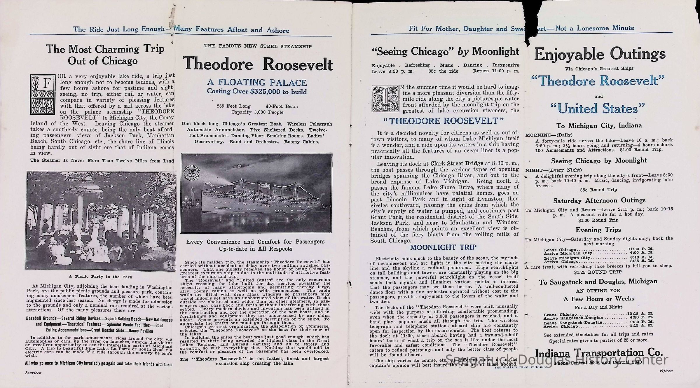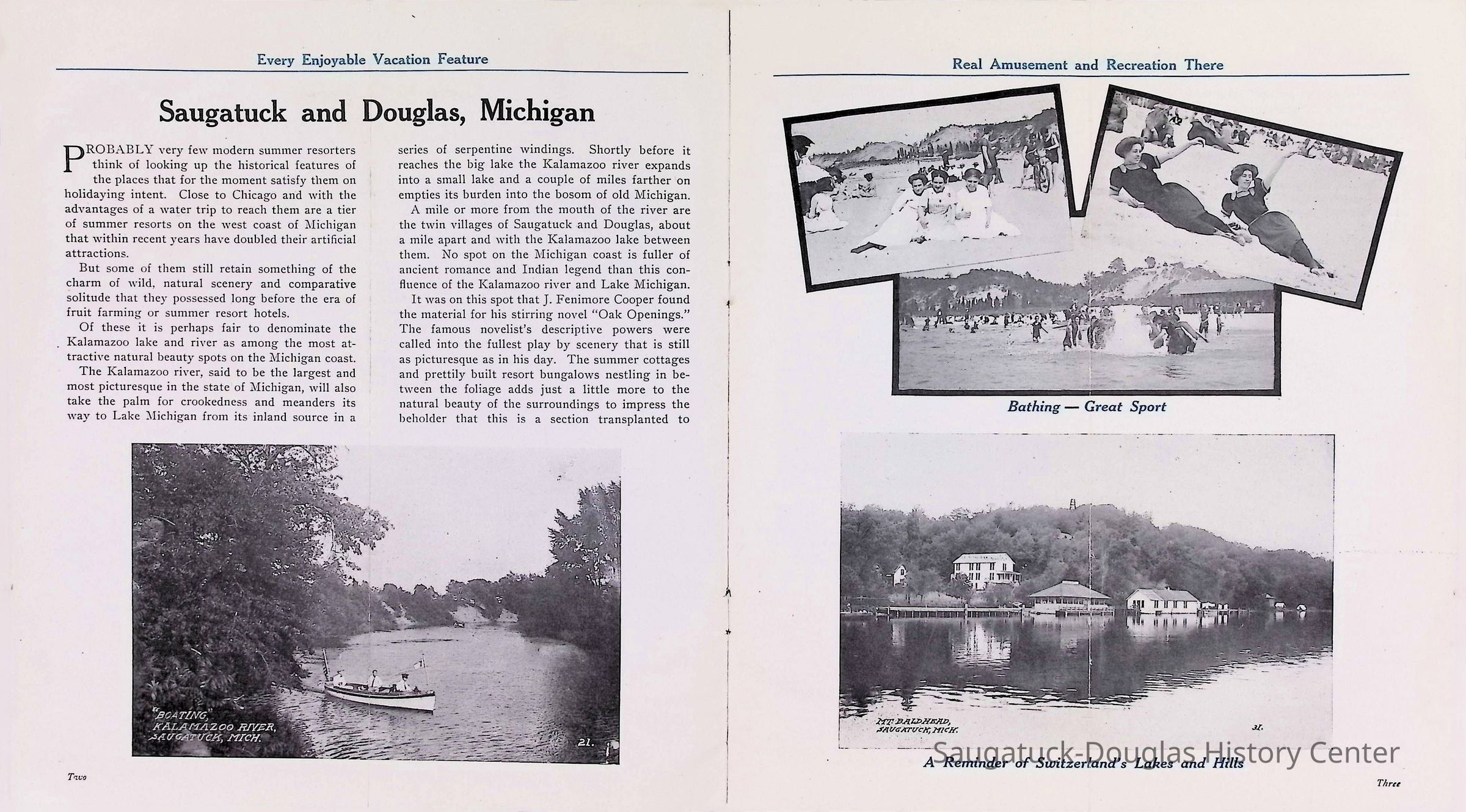 D. "Michigan's Delightful Summer Resorts reached direct via steamship United States" Indiana Transportation Company brochure. Pages, below, scanned by Mark Reid in 2025. Photo of Big Pavilion indicates brochure printed after 1909. Promotes Saugatuck and Douglas as a resort that offered bathing (beaches), canoeing, fishing, dancing, camping, automobiling, cottages, a list of guest houses and lodging with rates and maps