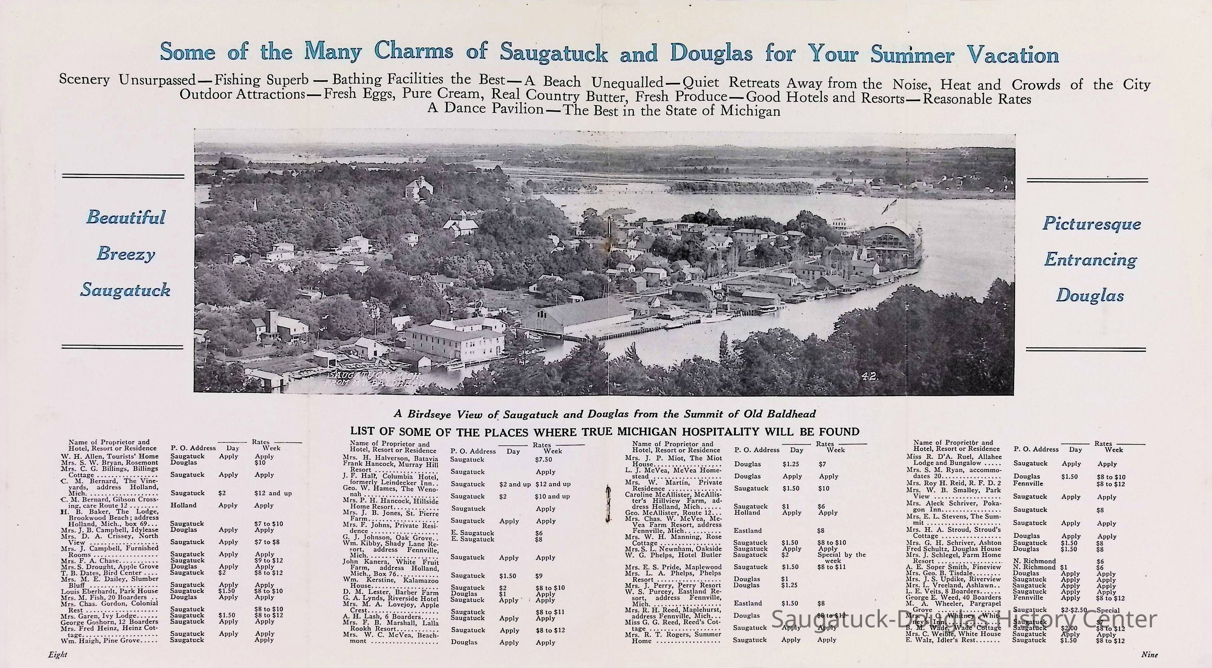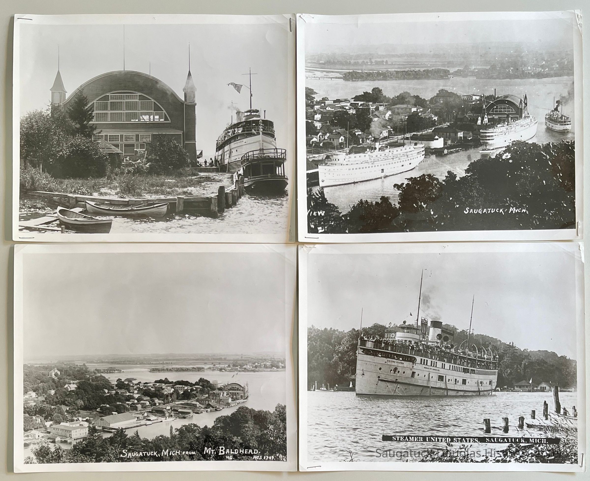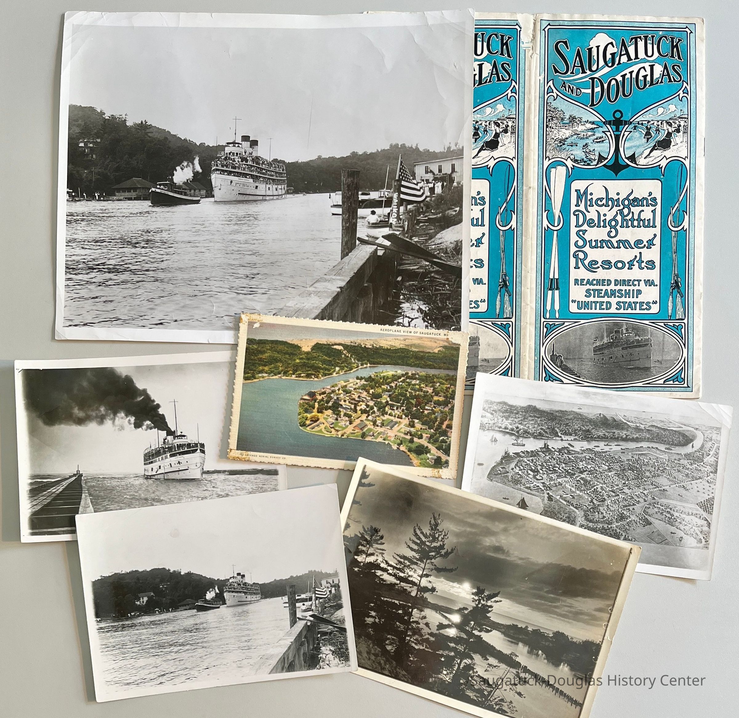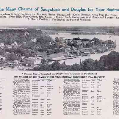 C. "Aeroplane view of Saugatuck, Mich by Chicago Aerial Survey Co." color postcard published by Parrish & Simonson, never mailed.