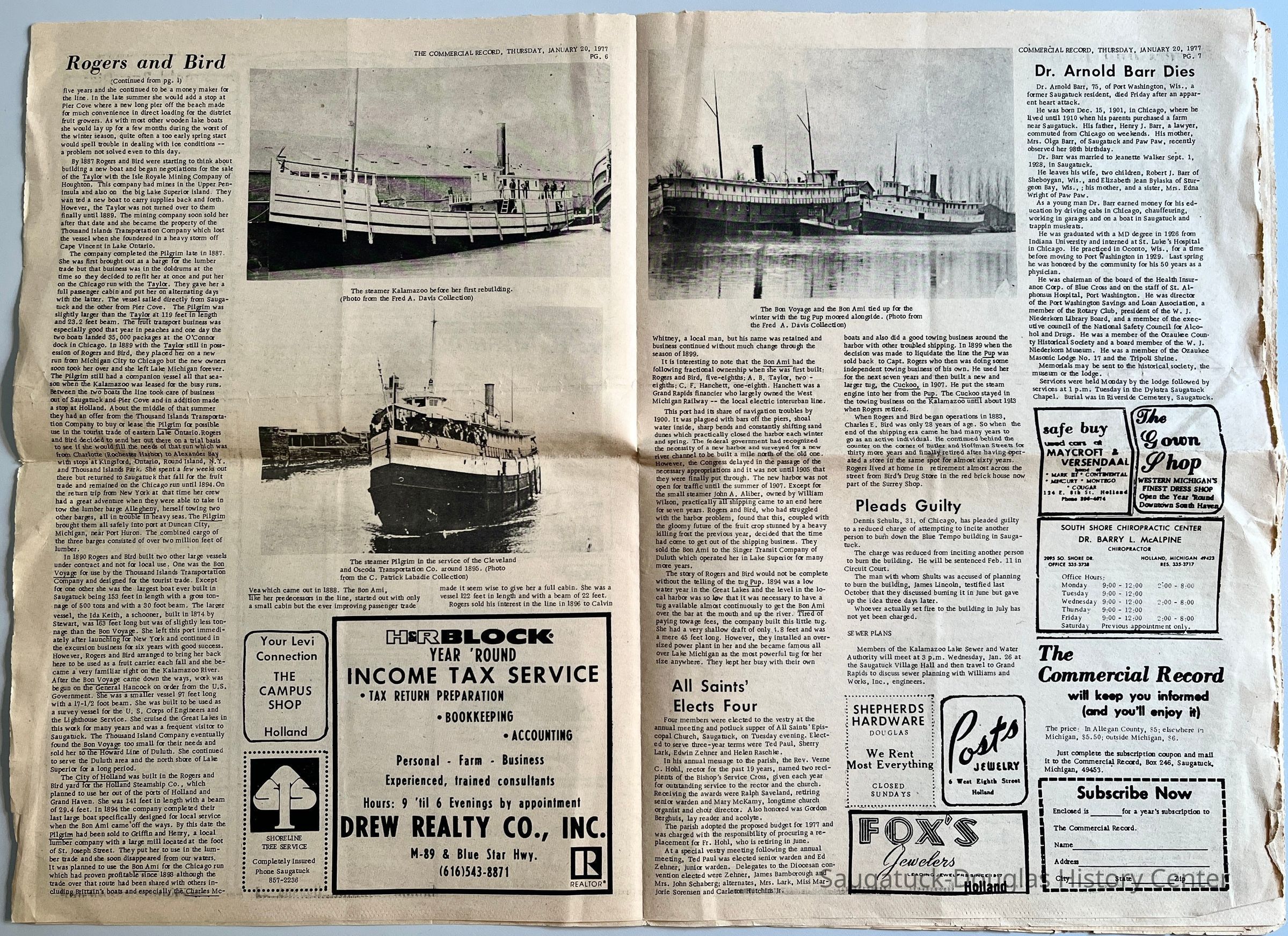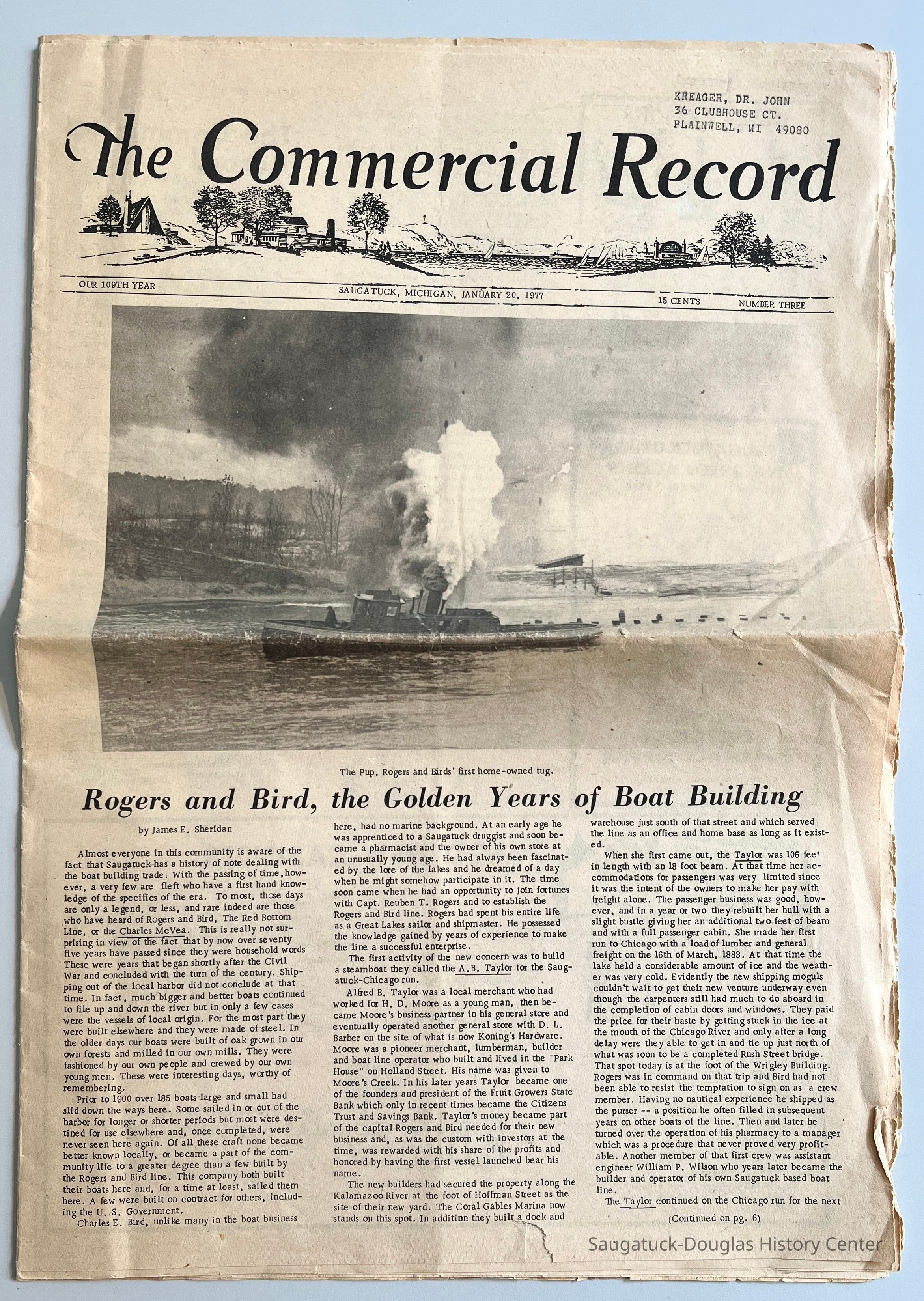 E. Commercial Record, 20 Jan 1977, mailed to Dr. John Kreager in Plainwell, MI, with front page story "Rogers and Bird, the Golden Years of Boat Building"