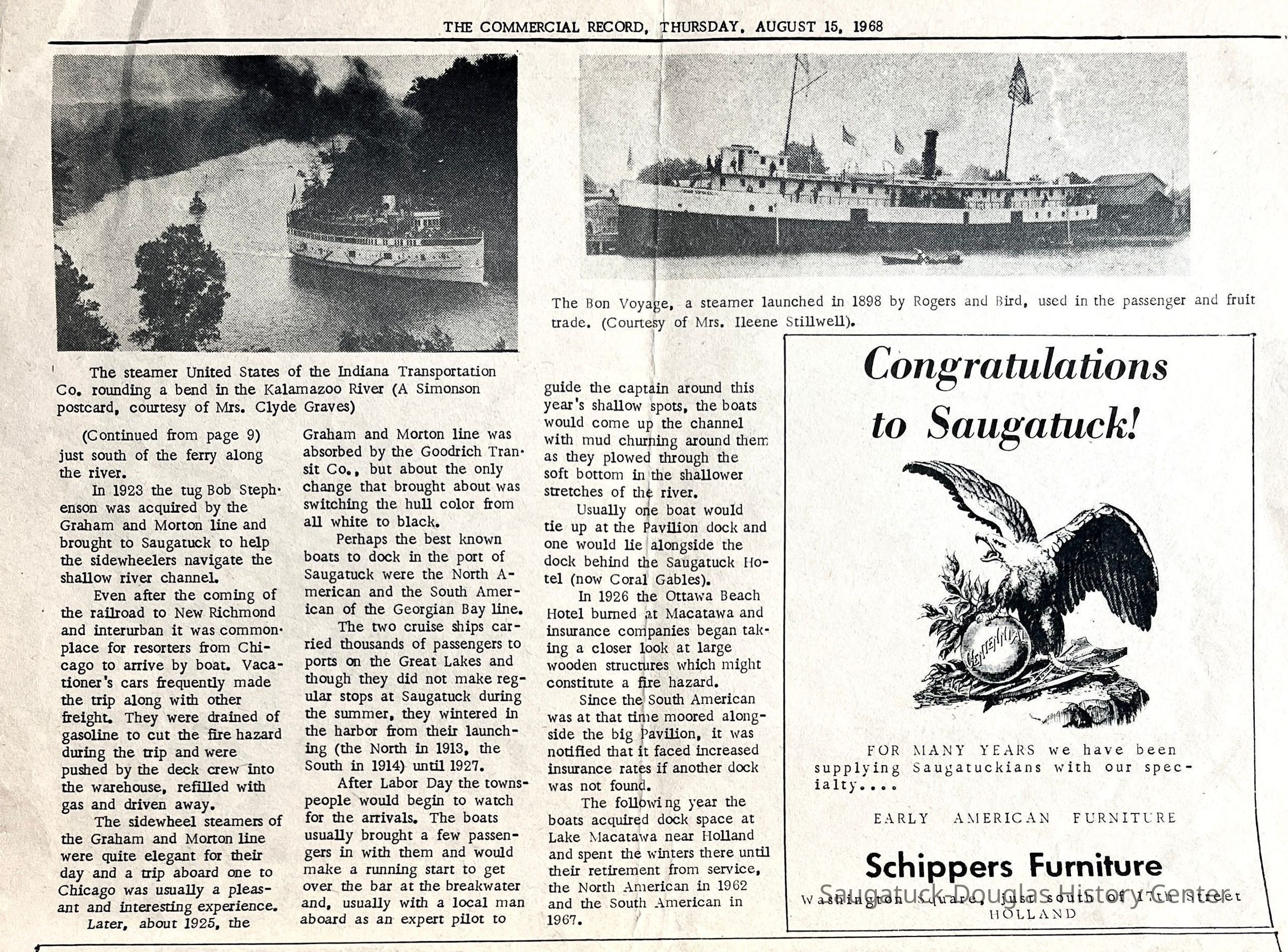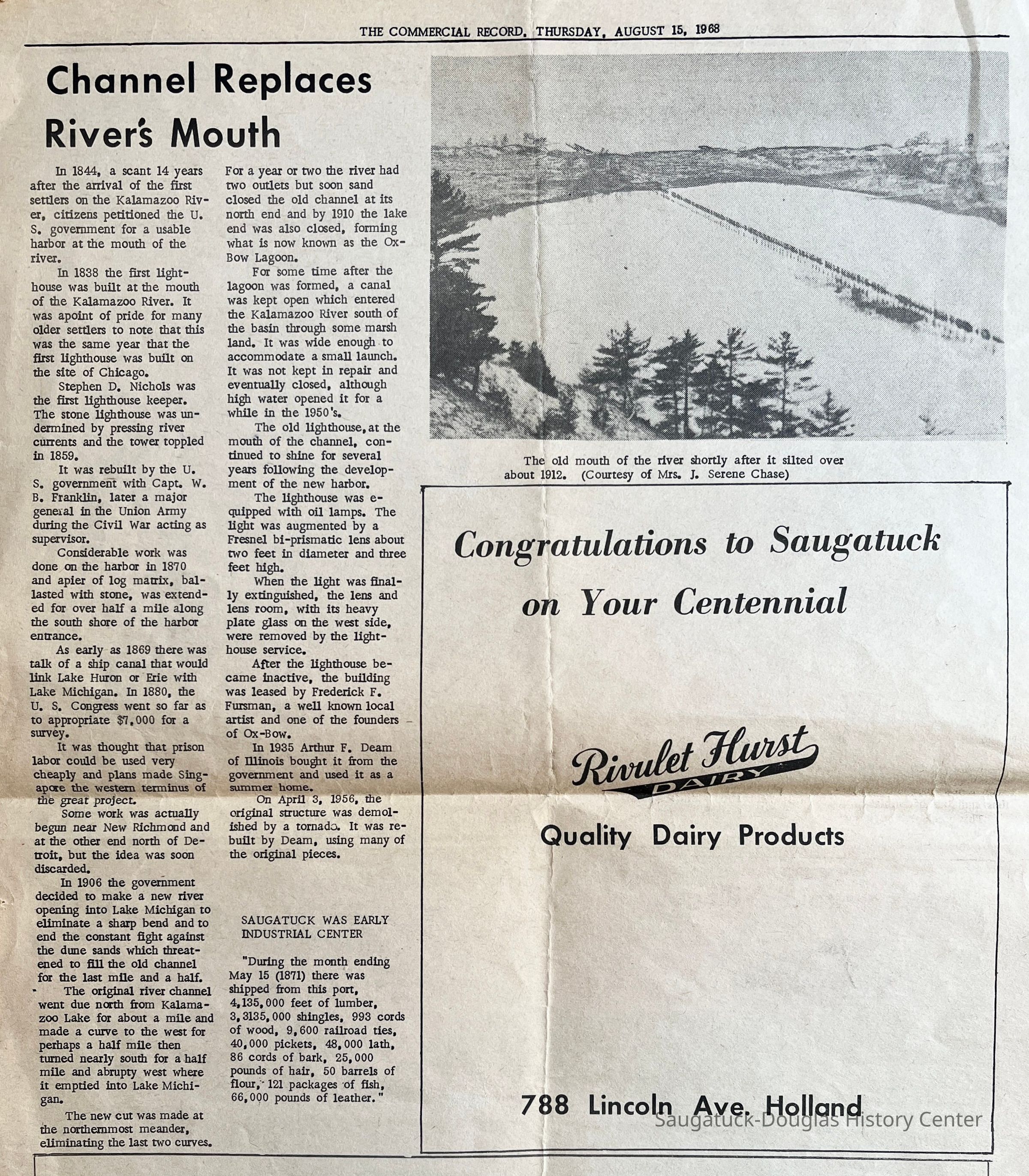 F. Commercial Record, 15 Aug 1968, four pages from Centennial special edition with partial story about ships, "The Big Pavilion - An Era," and the "Channel Replaces River's Mouth"Context