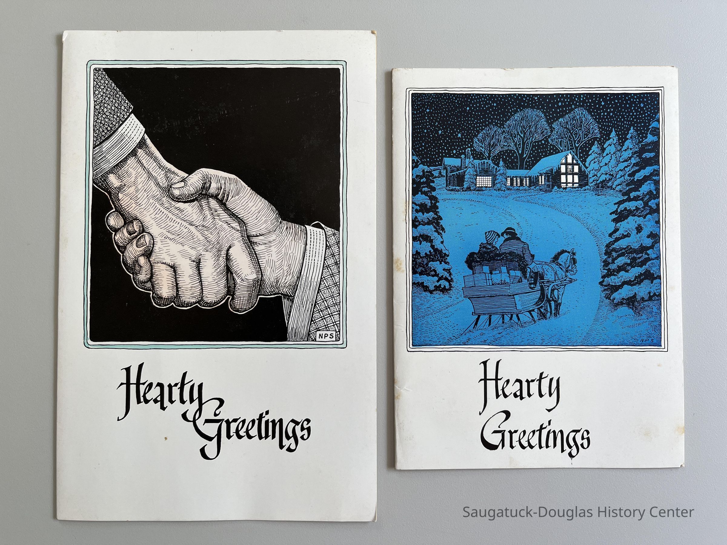 A. Hearty Greetings with illustration of two male hands clasping as if to shake hands or help each other. Interior sentiment refers to the clasp of one firm hand. Initial "MPS" in lower right corner of illustration. 8.5x5.5" folded