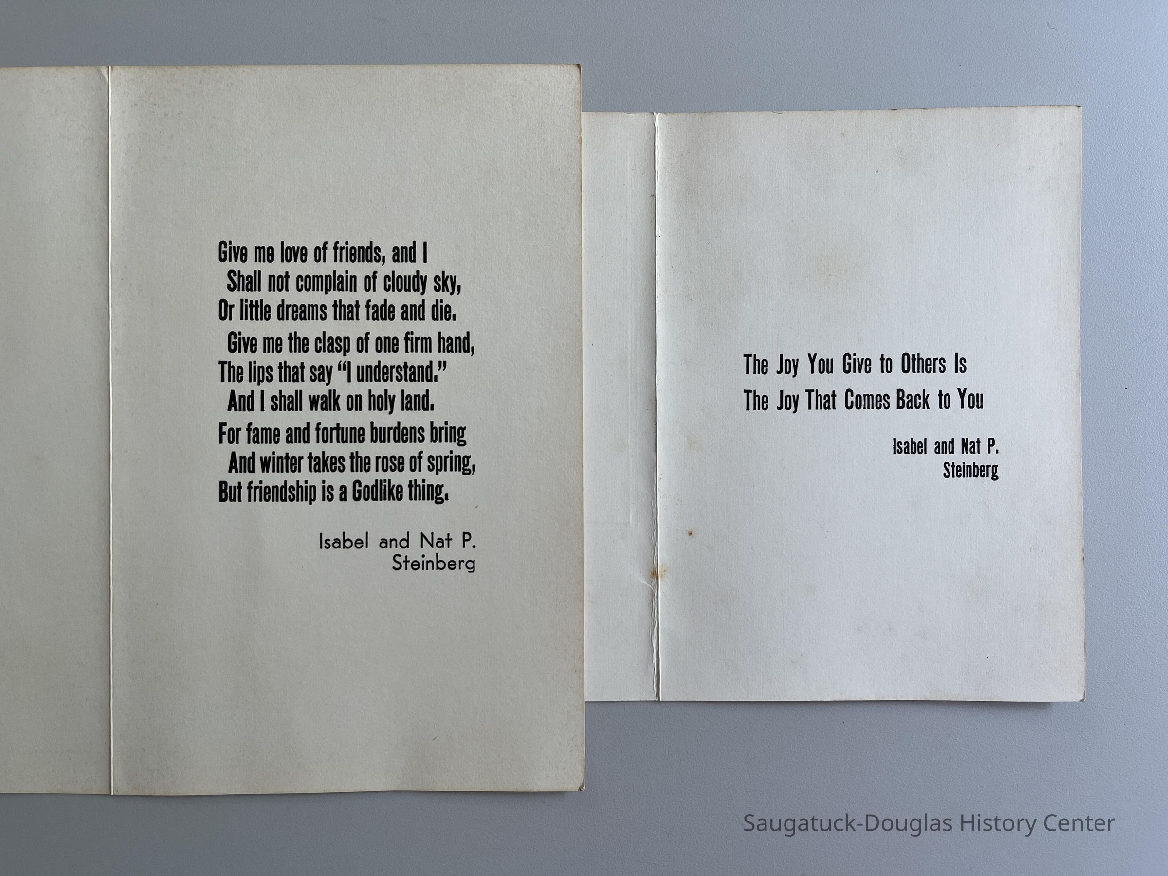 Two custom holiday cards created by Nat Steinberg with message from Isabel and Nat P. Steinberg. No envelopes.