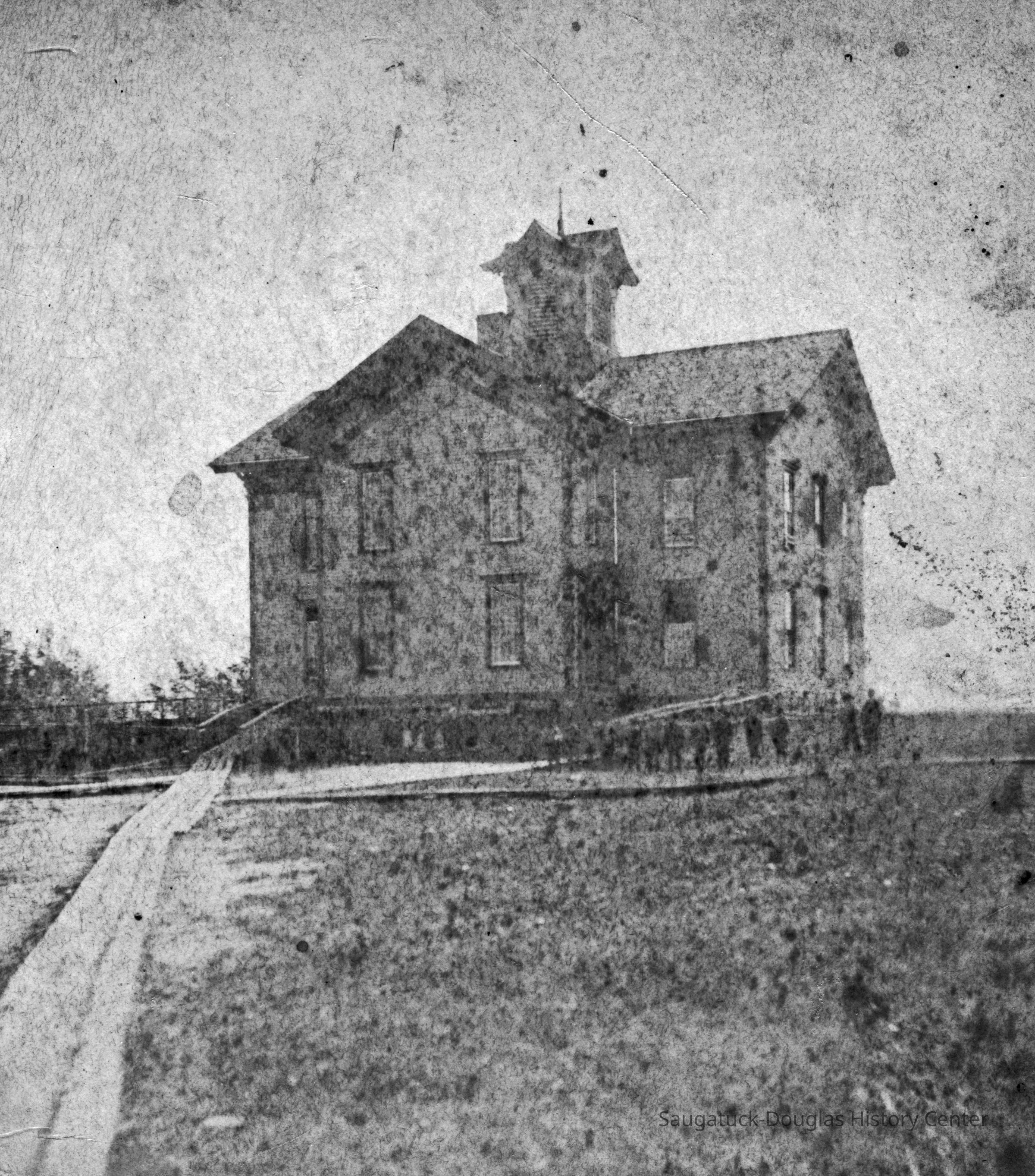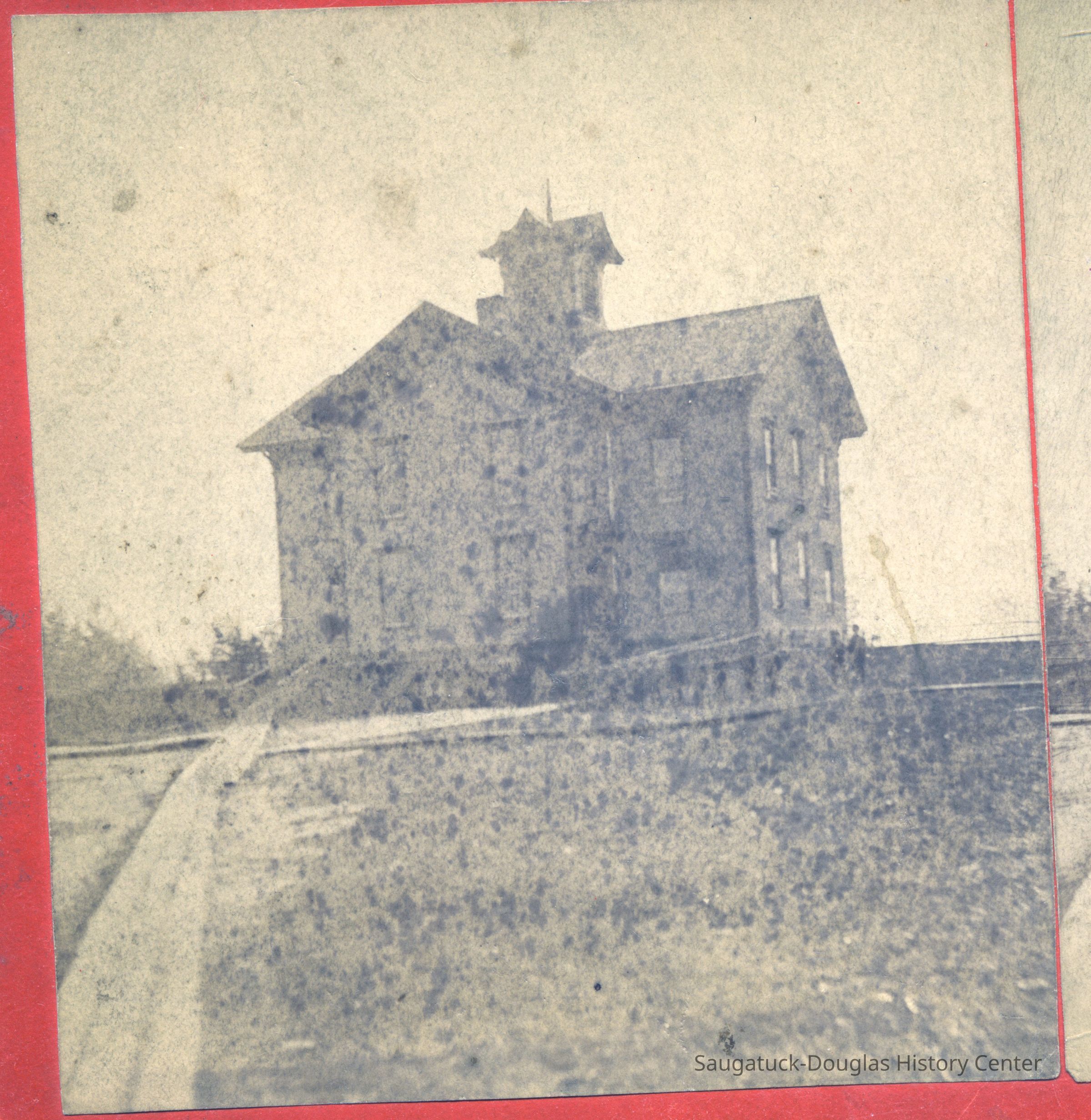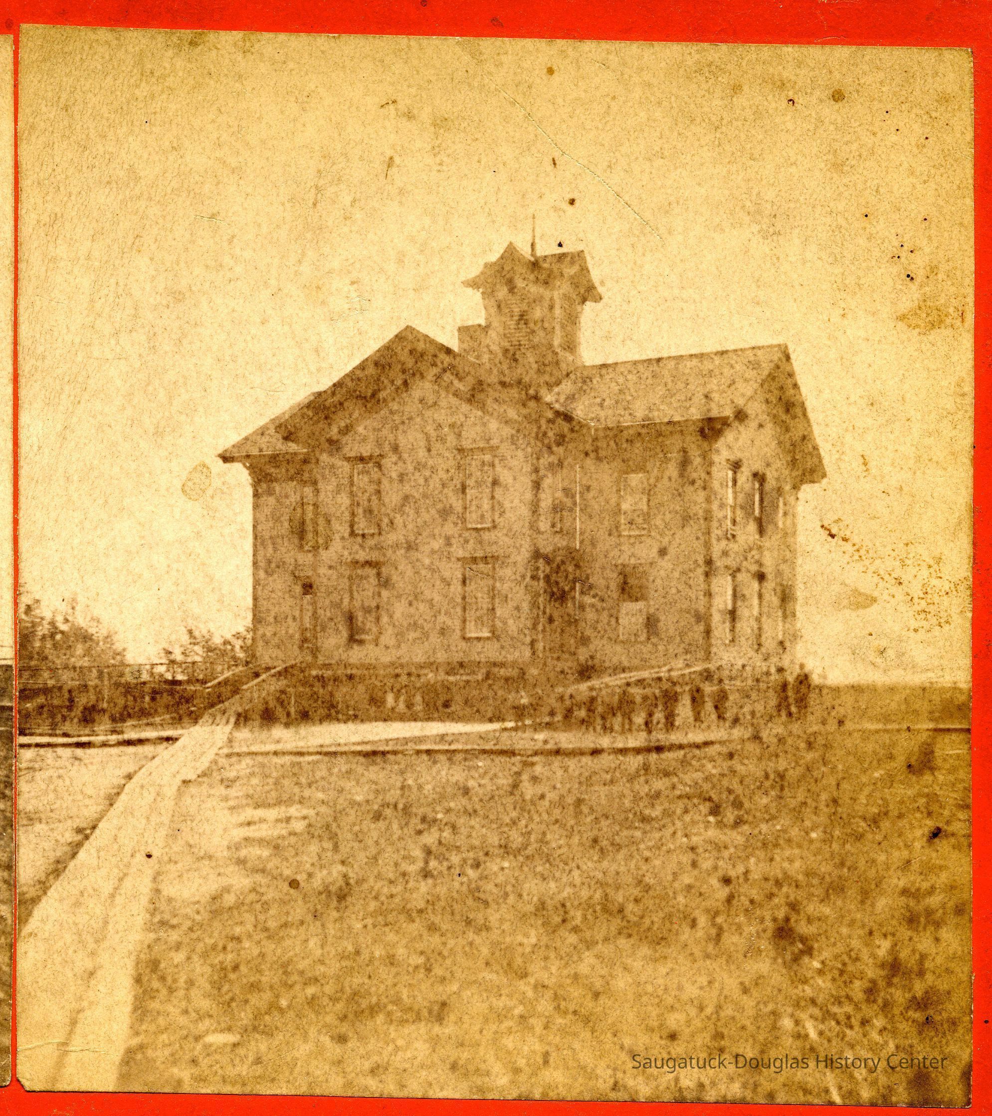 1 "School House Saugatuck Mich" - Very tiny students lined up outside a grand Union School building in Saugatuck. A plank boardwalk leads across an open field to the school. An attached post-it note in James Schmiechen's handwriting reads "Saug. School, ca 1867 (the year it was built) Looks to be still under construction (note foundation is scaffolded).