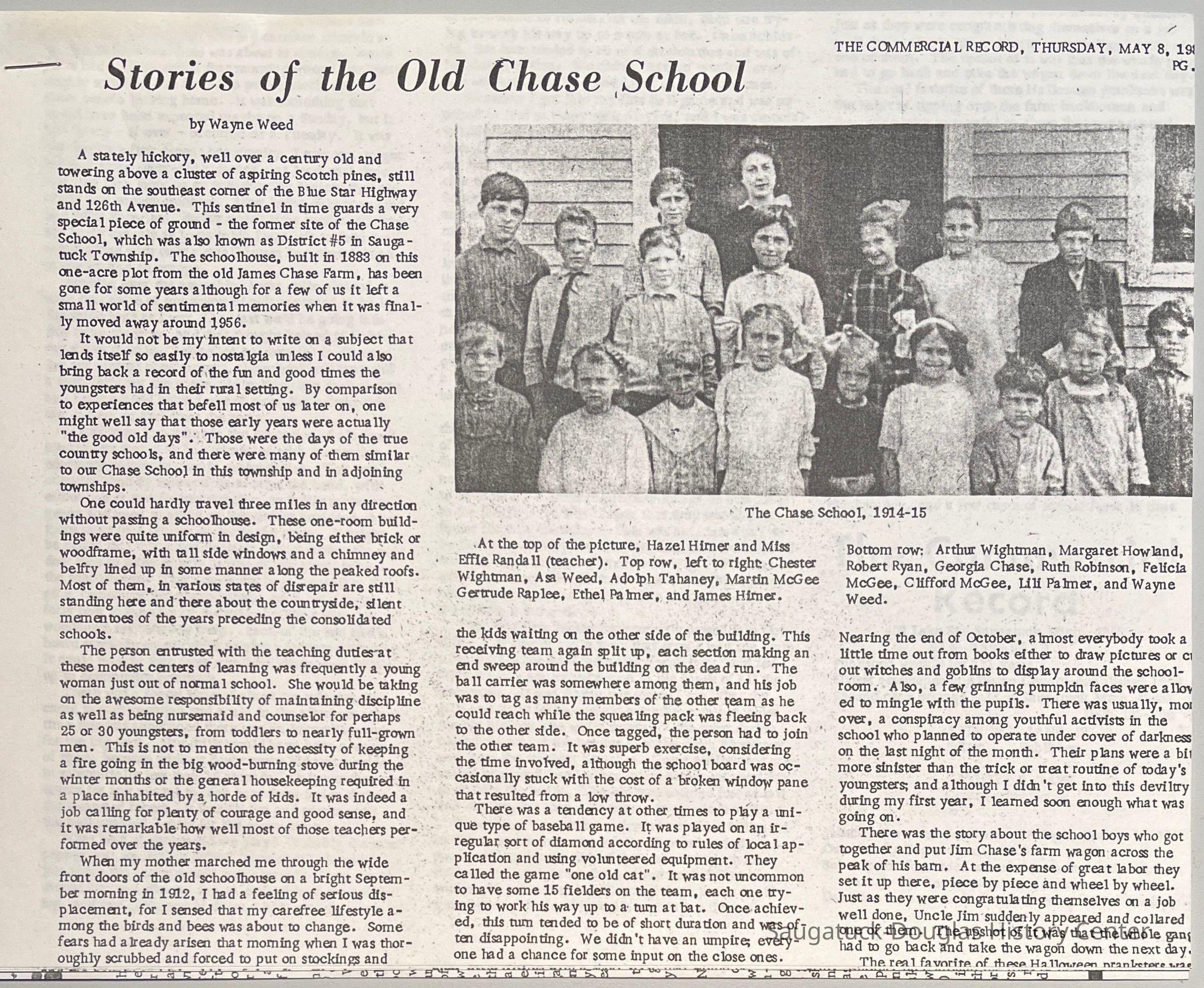 Photocopy of May 8, 1980 Commercial Record newspaper article by Wayne Weed titled "Stories of the Old Chase School"Context