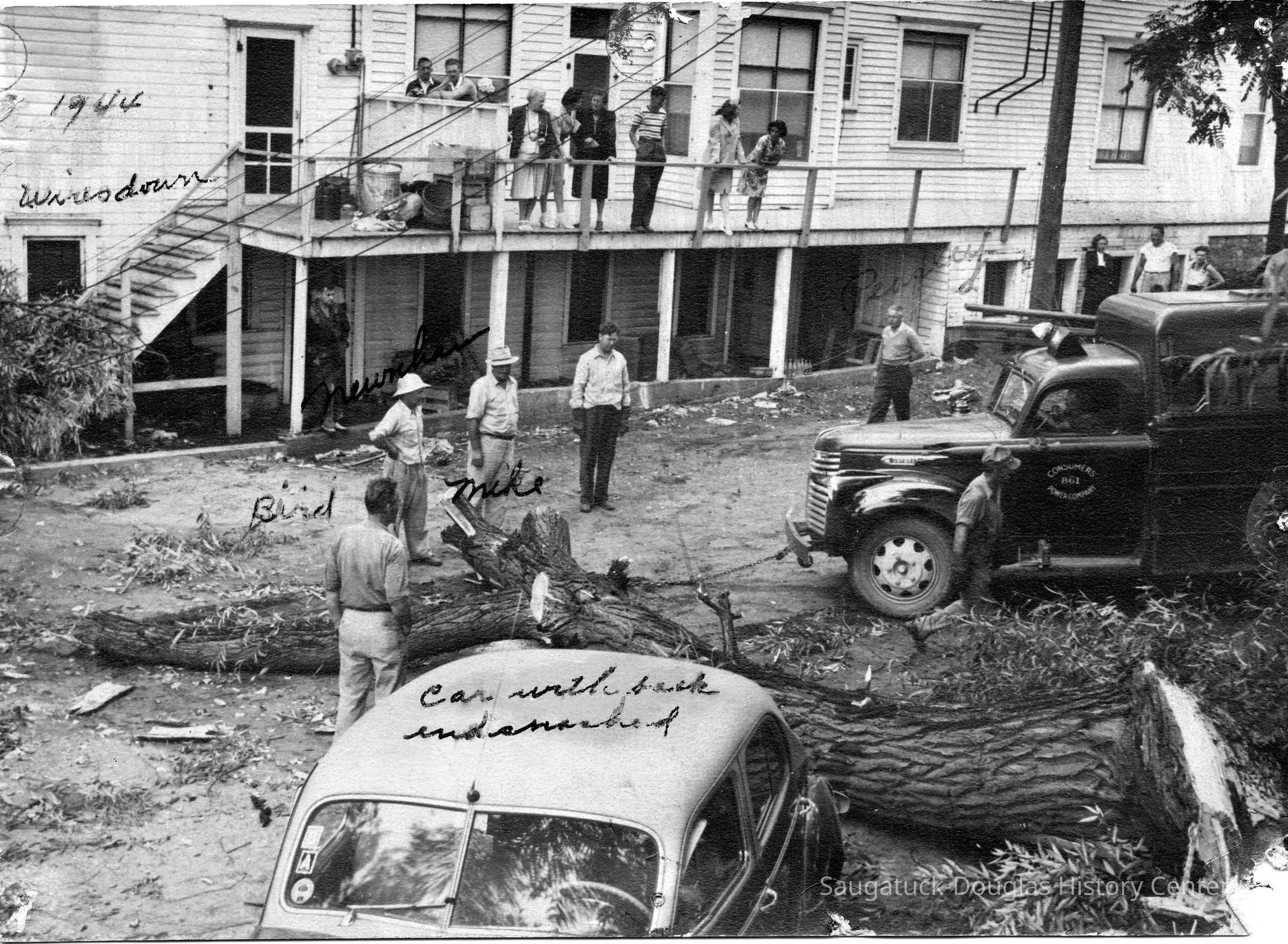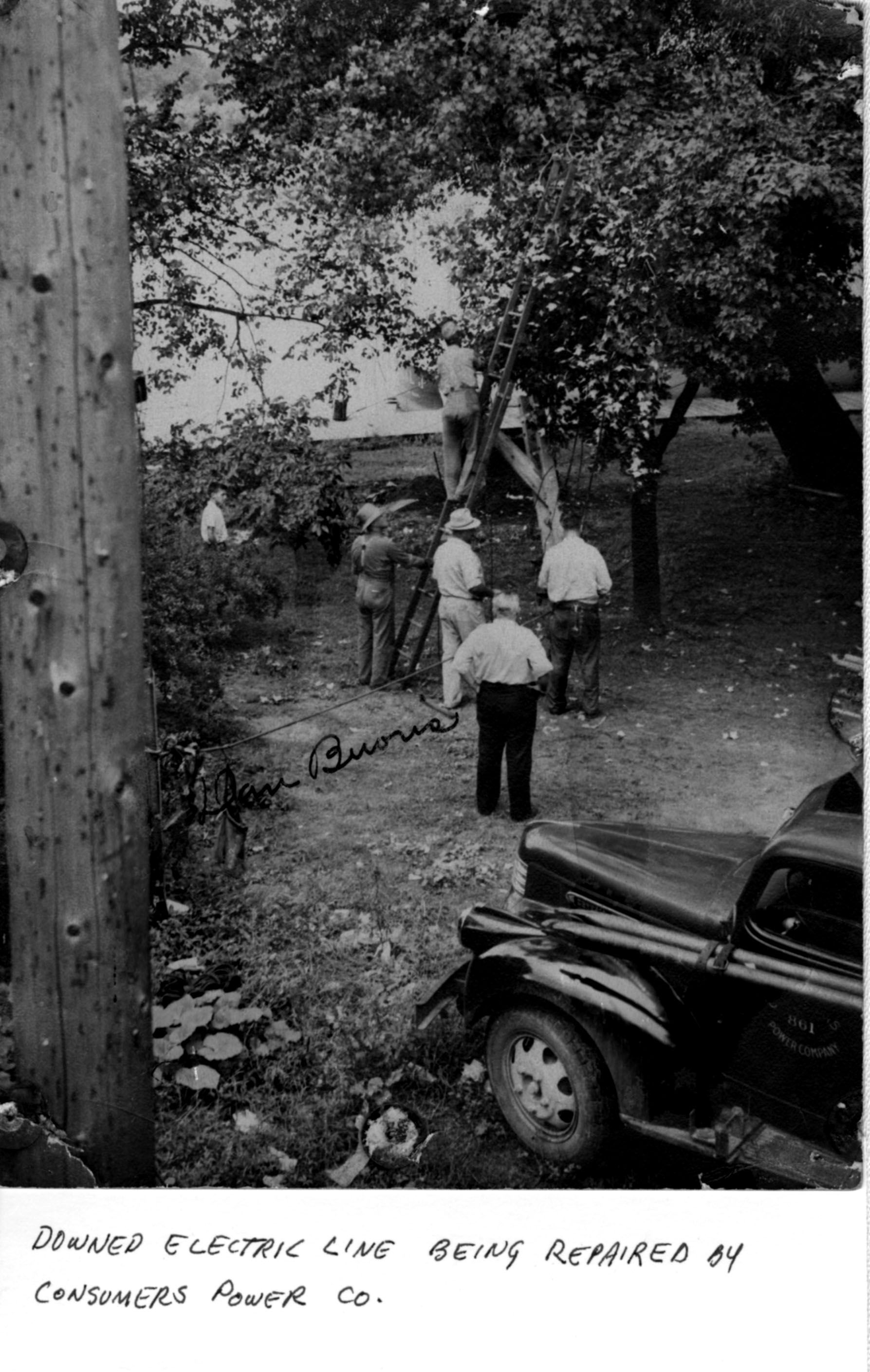 Photo of four men standing and a teen standing around a man is up on a ladder that is leaned against a tree. "Dan Buoris" is written on the print and the notation "Downed electric line being repaired by Consumers Power Co." The location looks to be along a riverfront boardwalk.