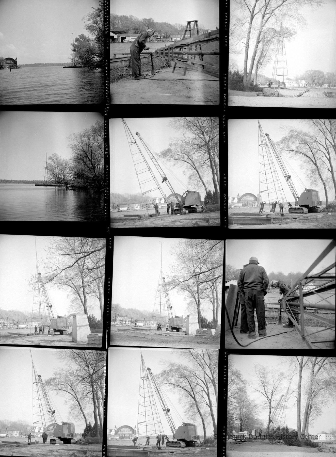 A crane lifts the new storm warning tower which may be the same one still near the Casa Loma property. Pavilion and the Edgewater marina is visible in the background