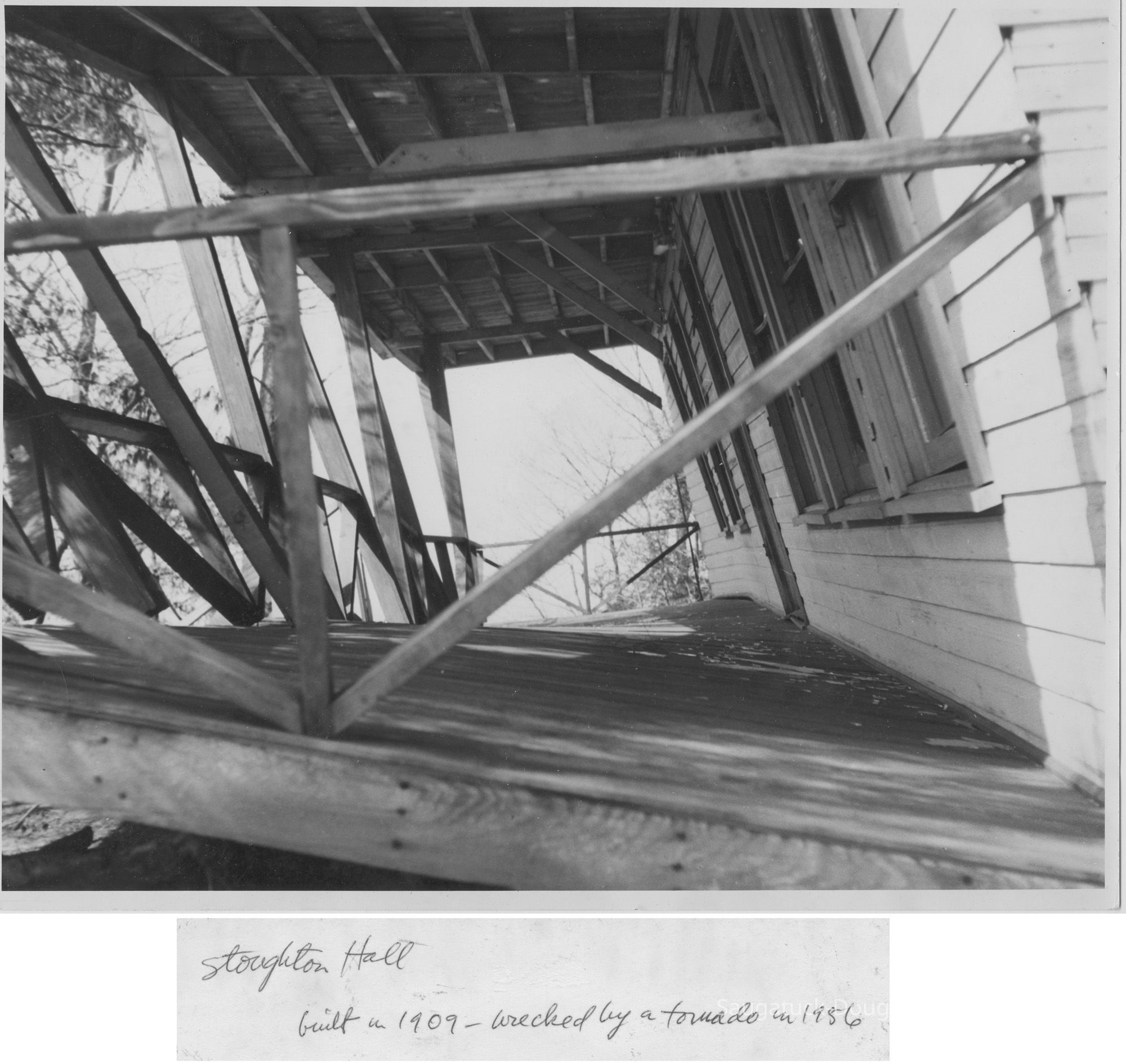 Porch of a semi-collapsed wooden building with the caption "Stoughton Hall built in 1909 - wrecked by a tornado in 1956."