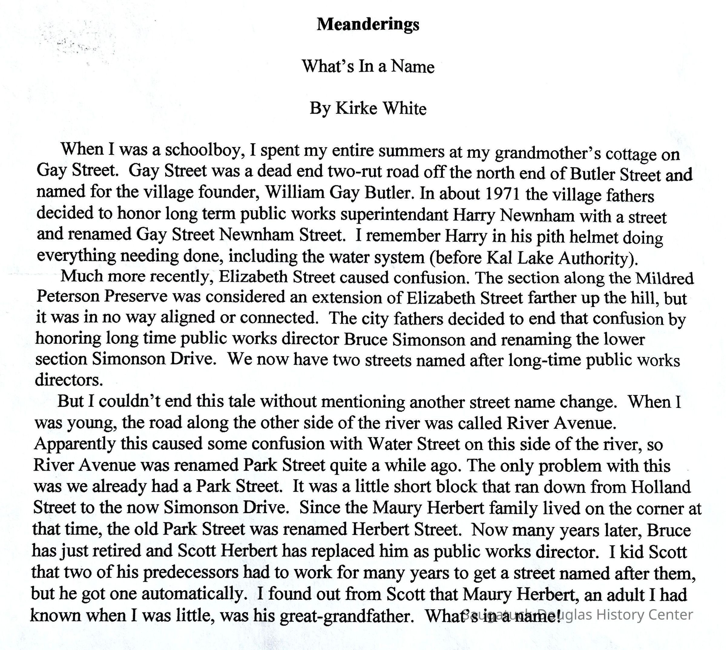 Single-page, laser-print of a short "Meanderings" essay by Kirke White titled "What's In a Name" that tells the story behind many of the street names on the north side of Saugatuck.Context