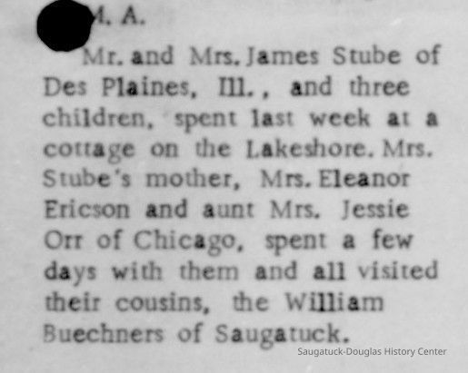 Dora A. Buechner 1887-1970 and William Buechner 1883-1969 (pronounced Beek-ners) were relatives. They lived at 445 St. Joseph Street, the SE corner of Mary and Joseph, in a tiny house that has since been torn down and rebuilt. They are buried at Saugatuck’s Riverside Cemetery.