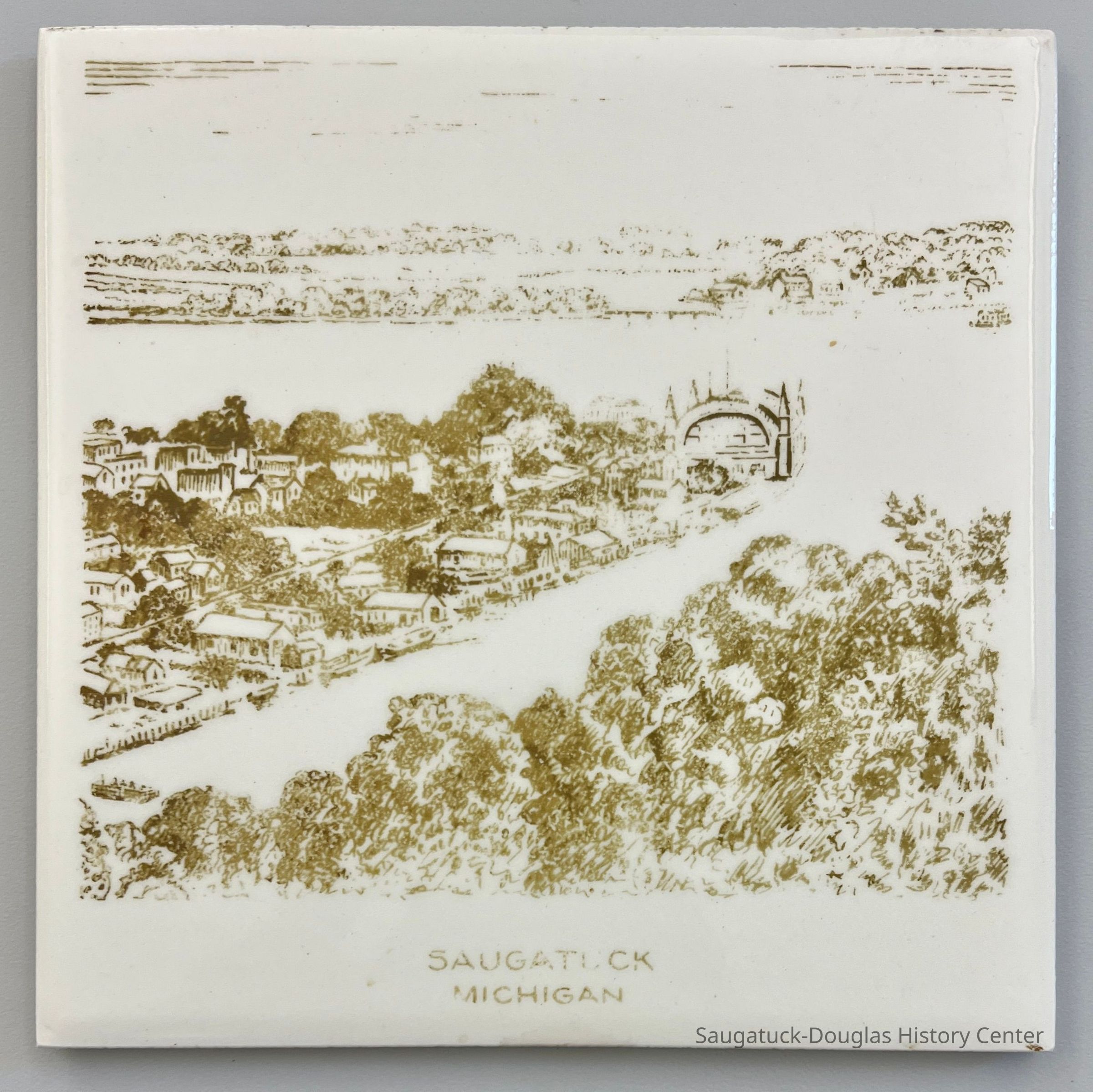 6-inch square decorative ceramic tile printed with an illustration of the view from Mount Baldhead in brown glaze. A paper label with an integrated hanger covers the back of the tile. The label is printed with a brief history of Saugatuck and the text "Pete & Joe Shop, Russell and Jean Force" and "Manufactured by The Kemper-Thomas Company" of Cincinnati, Ohio.Context