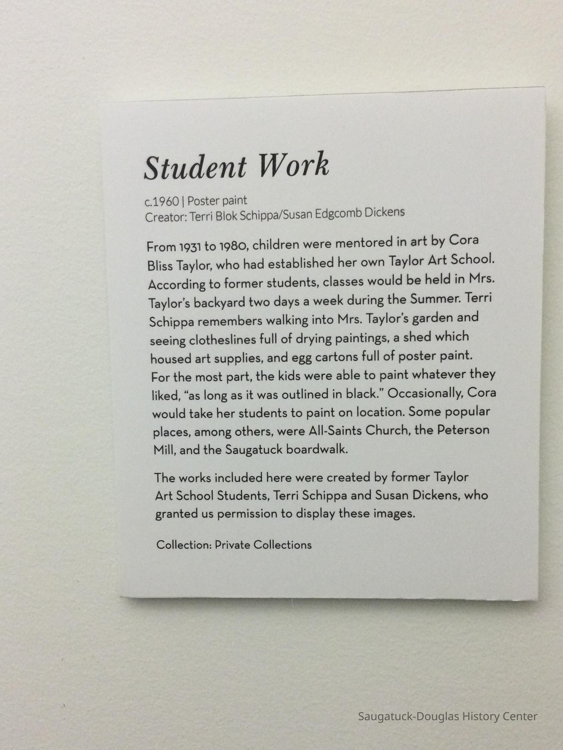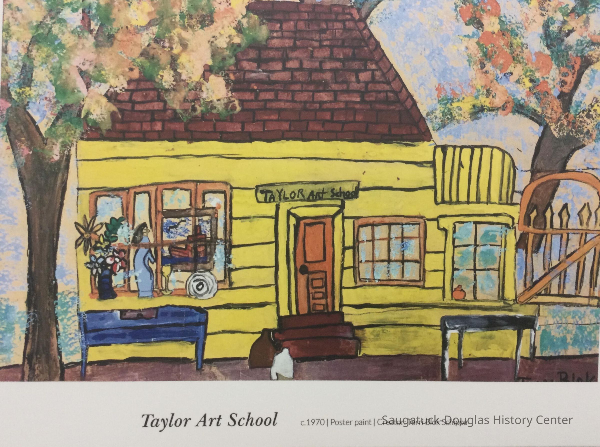 From 1931 to 1980, children were mentored in art by Cora Bliss Taylor, who had established her own Taylor Art School. According to former students, classes would be held in Mrs. Taylor’s backyard two days a week during the Summer. Terri Schippa remembers walking into Mrs. Taylor’s garden and seeing clotheslines full of drying paintings, a shed which housed art supplies, and egg cartons full of poster paint. For the most part, the kids were able to paint whatever they liked, “as long as it was outlined in black.” Occasionally, Cora would take her students to paint on location. Some popular places, among others, were All-Saints Church, the Peterson Mill, and the Saugatuck boardwalk.