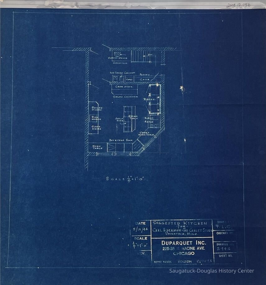 This architectural drawing shows the kitchen details for the Chalet of Hoerman's. Blueprint by Duparquet, Inc.Collection